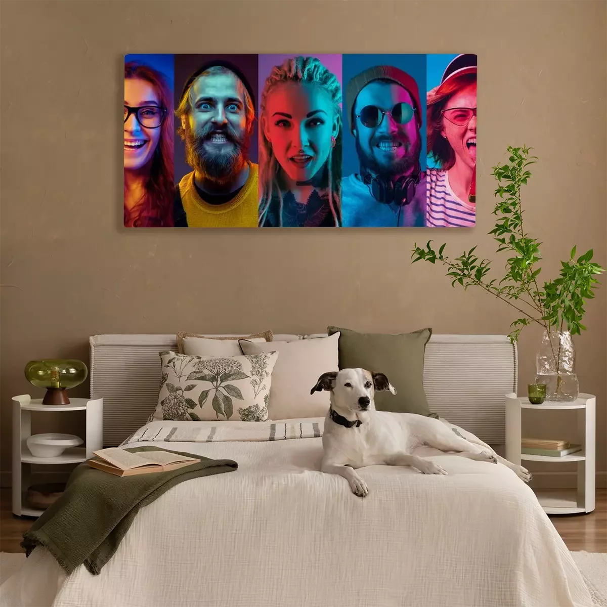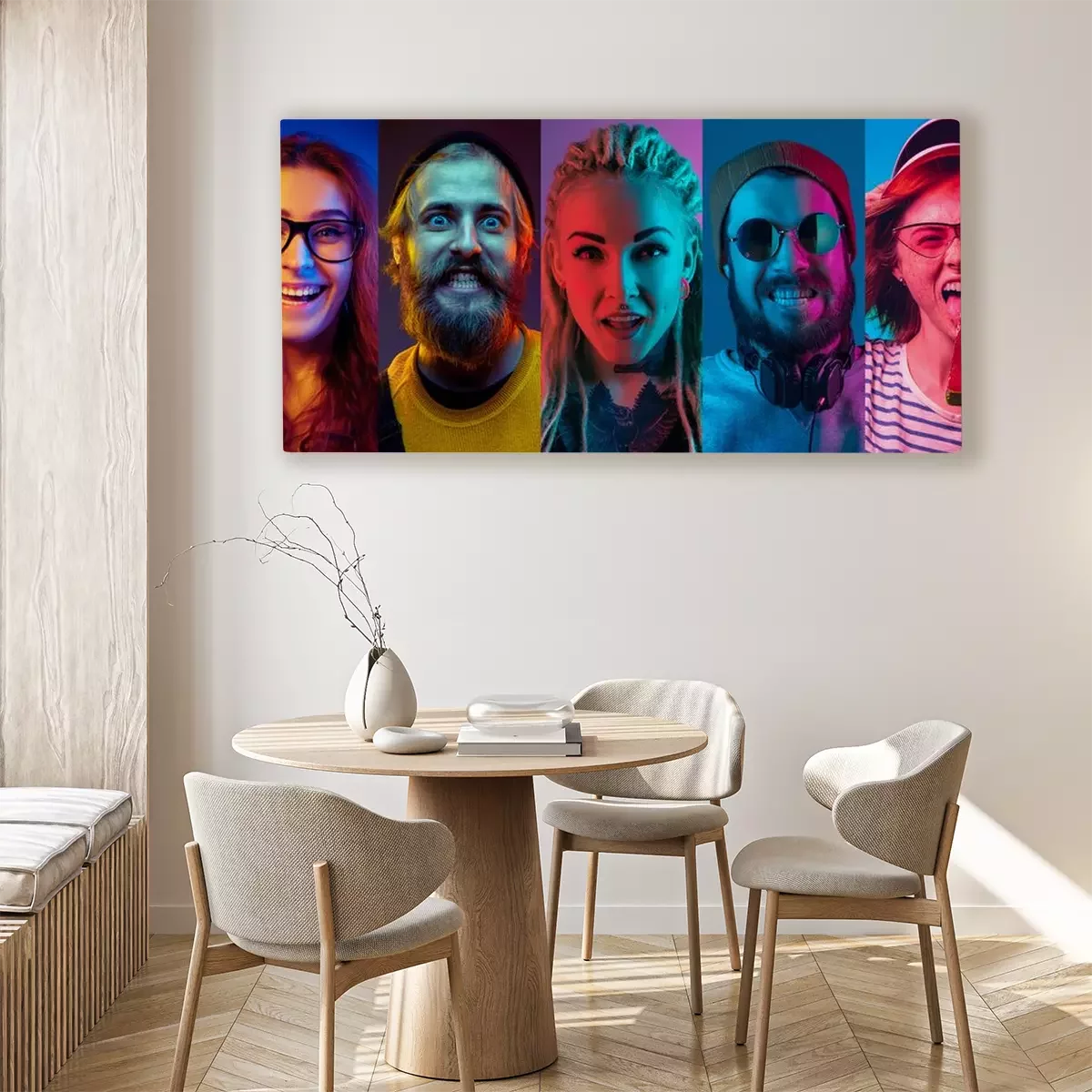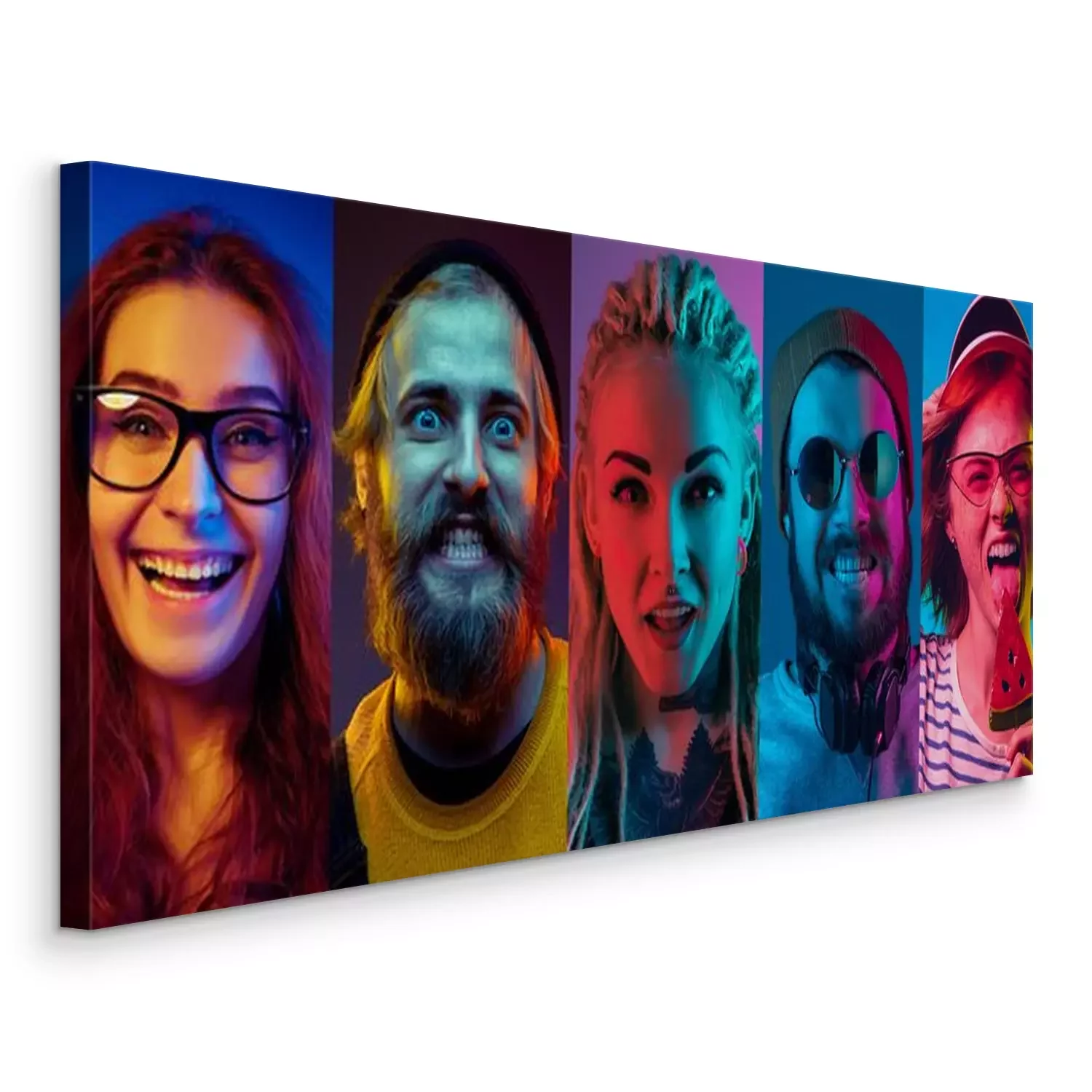 Tableau : Collage of portraits of young emotional people on multicolored background in neon light. Concept of human emotions, facial expression, sales. Smiling, listen to music, happy. Flyer for ad, proposal.