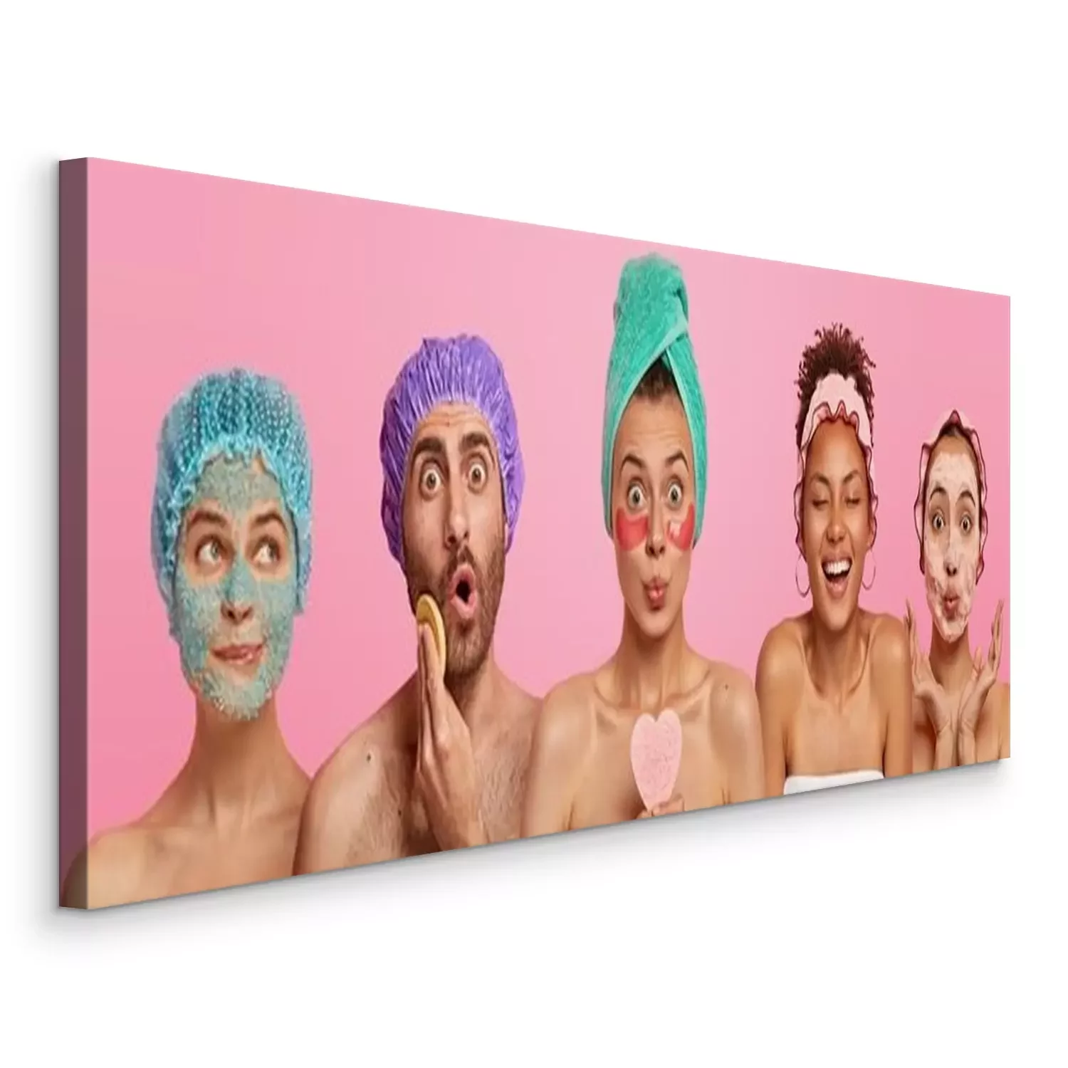Tableau  Collage shot of five people appy face masks, hold beauty sponges, stand with bare shoulders indoor, care about appearance and beauty, isolated on pink background. Wellness, cosmetology, spa concept