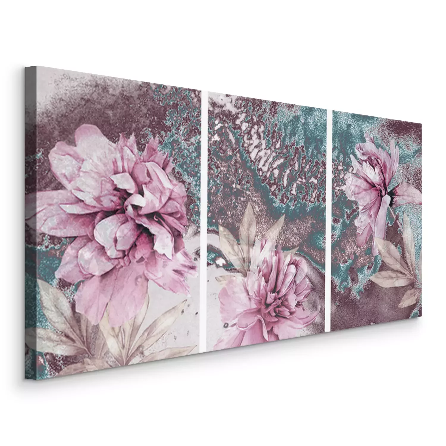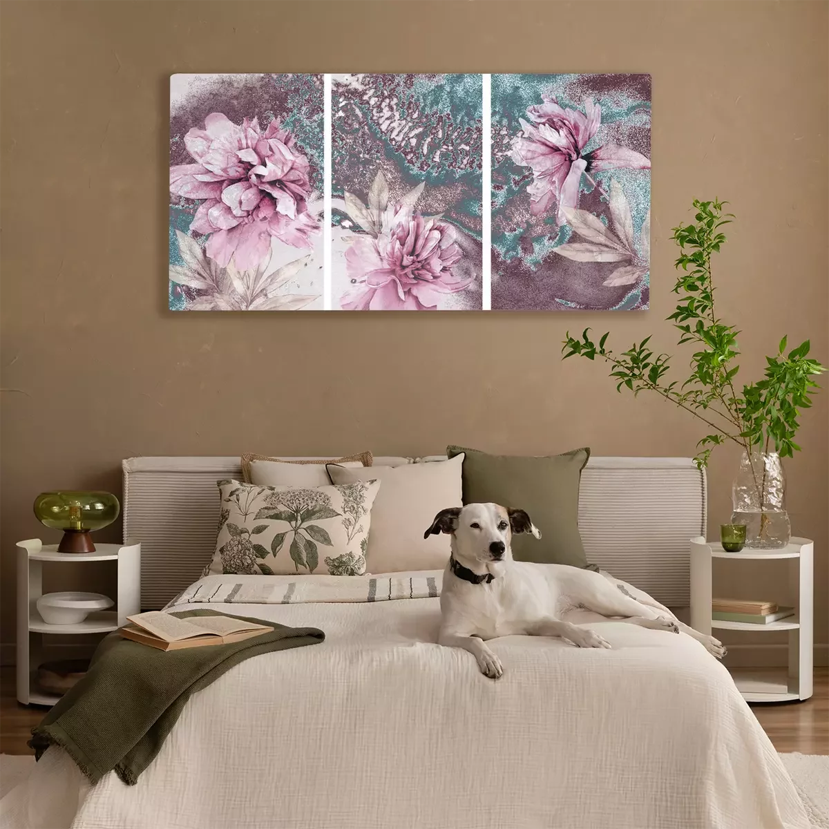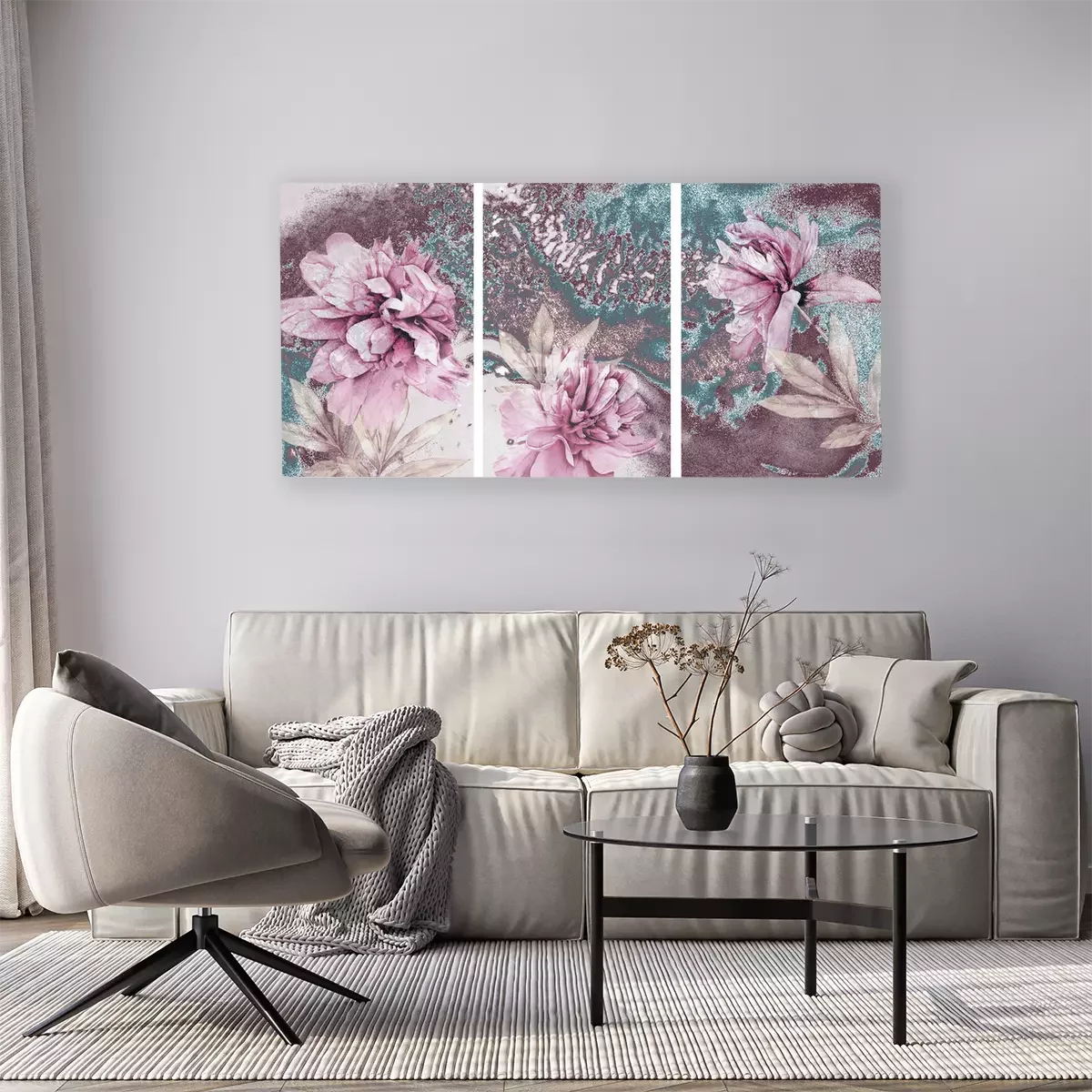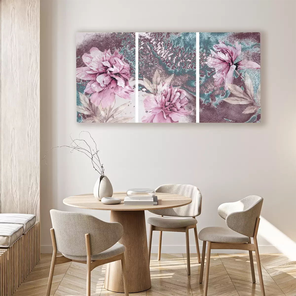 Tableau  Collection of designer oil paintings. Decoration for the interior. Modern abstract art on canvas. A set of paintings with pink peonies on an abstract blue background