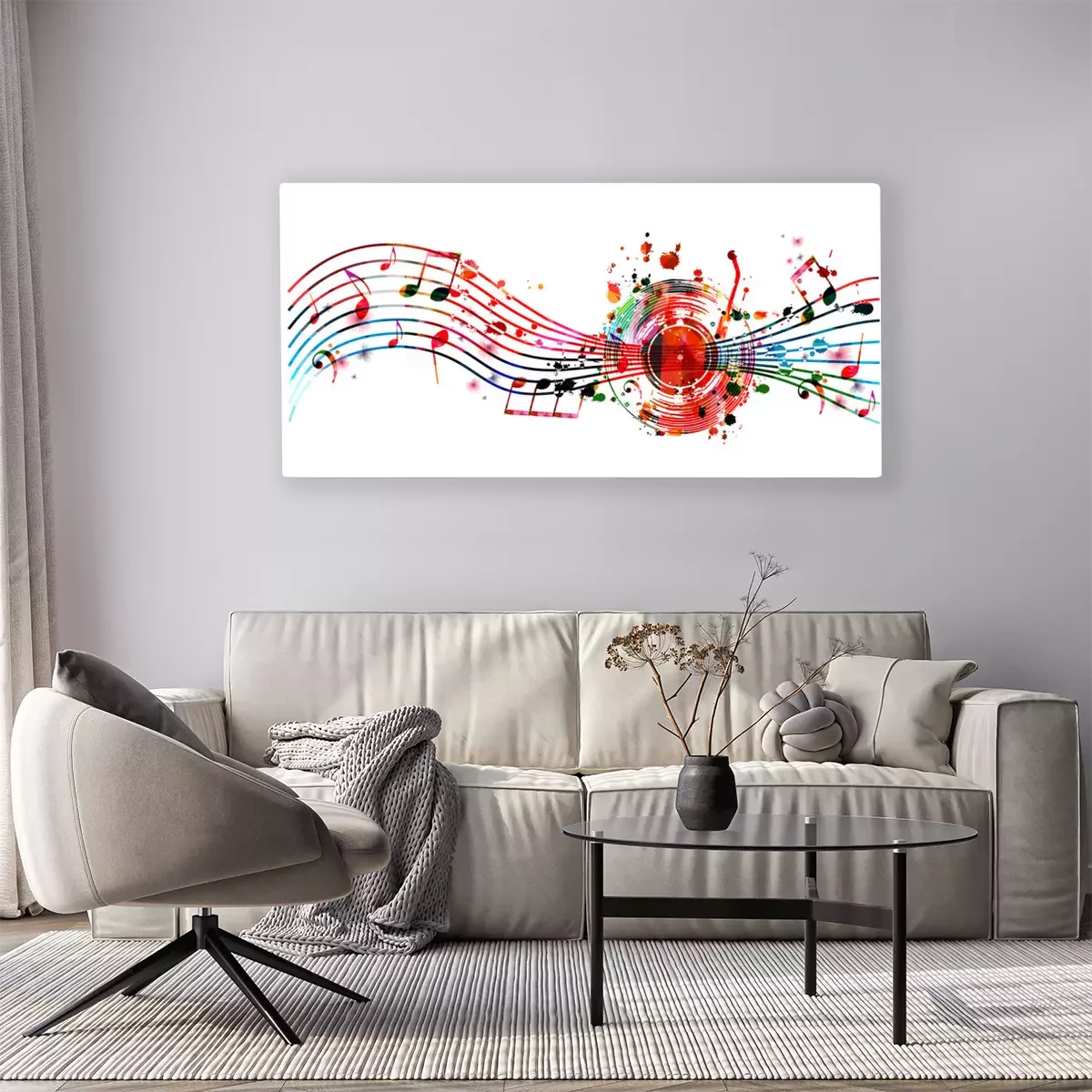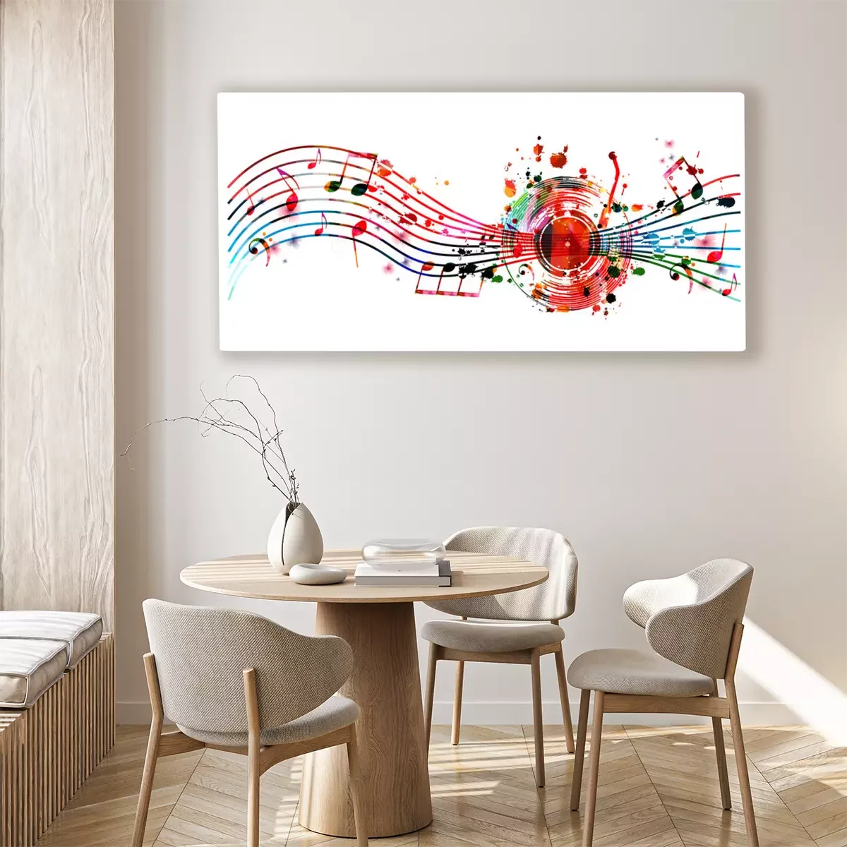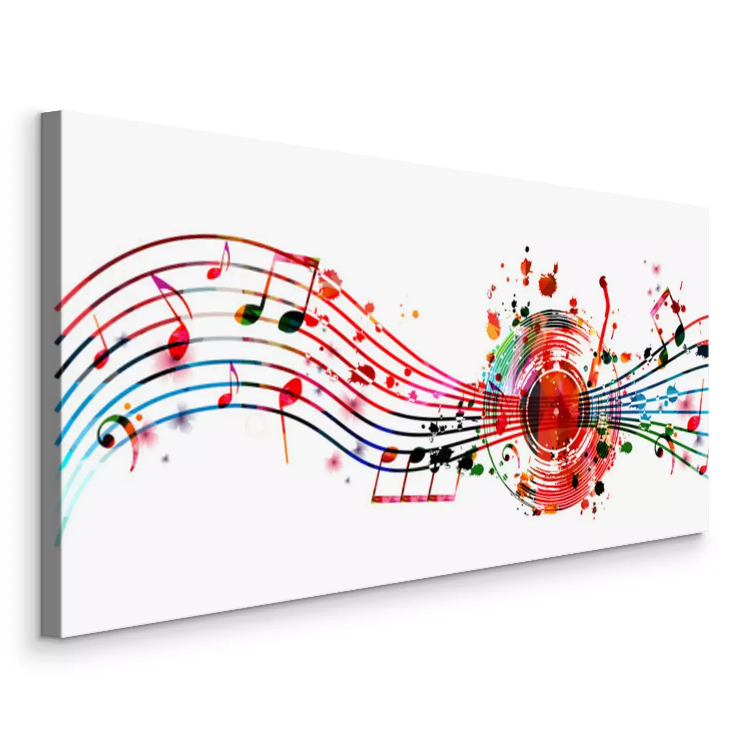 Tableau  Colorful music background with music notes and vinyl record disc isolated vector illustration design. Artistic music festival poster, events, party flyer, music notes signs and symbols