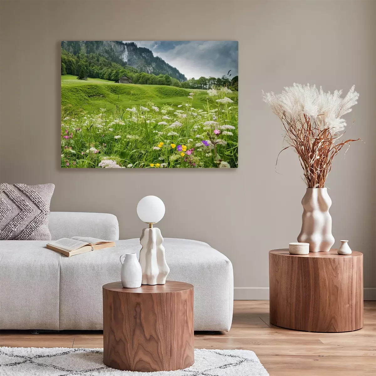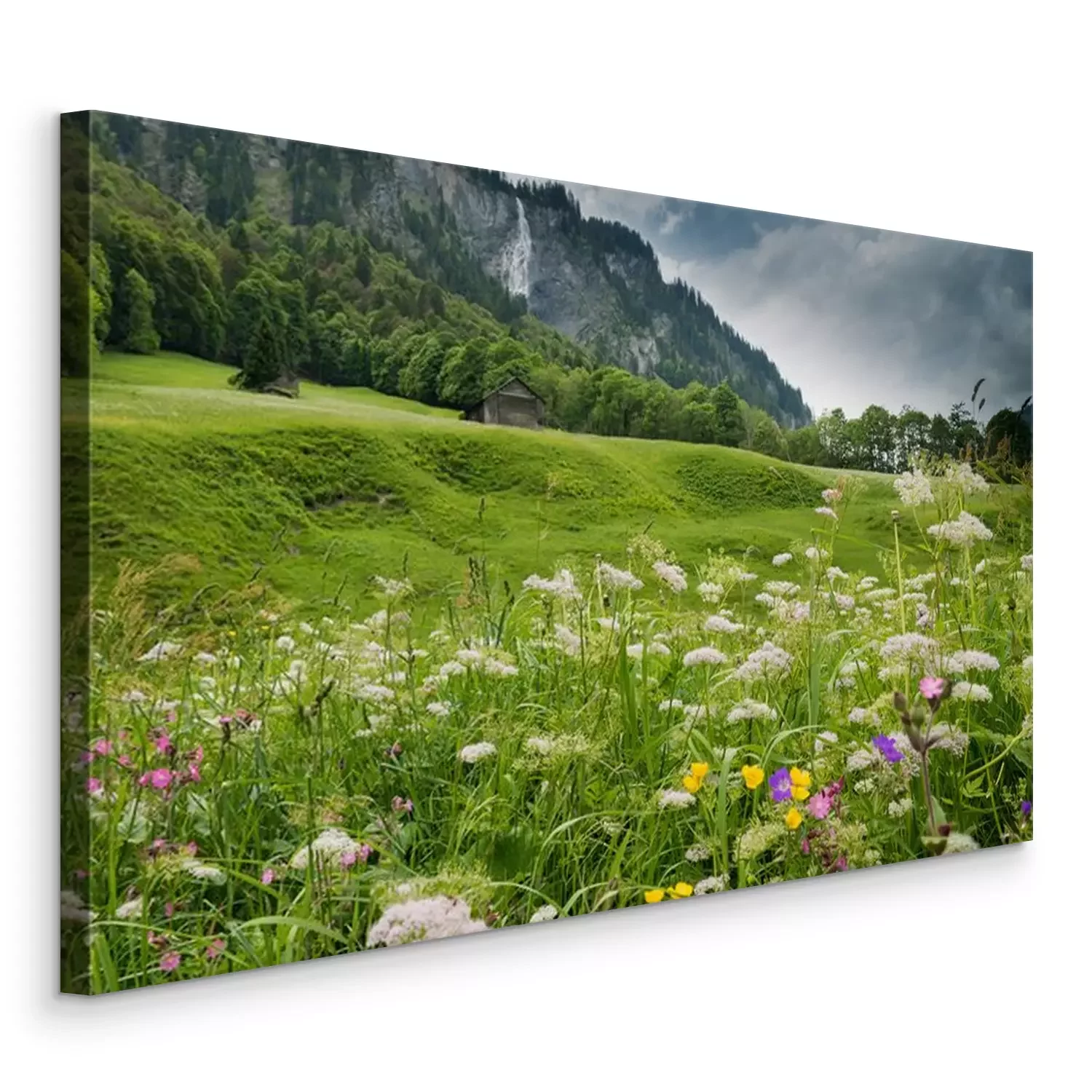 Tableau  colorful wildflower meadow and old hut in a mountain landscape with waterfall