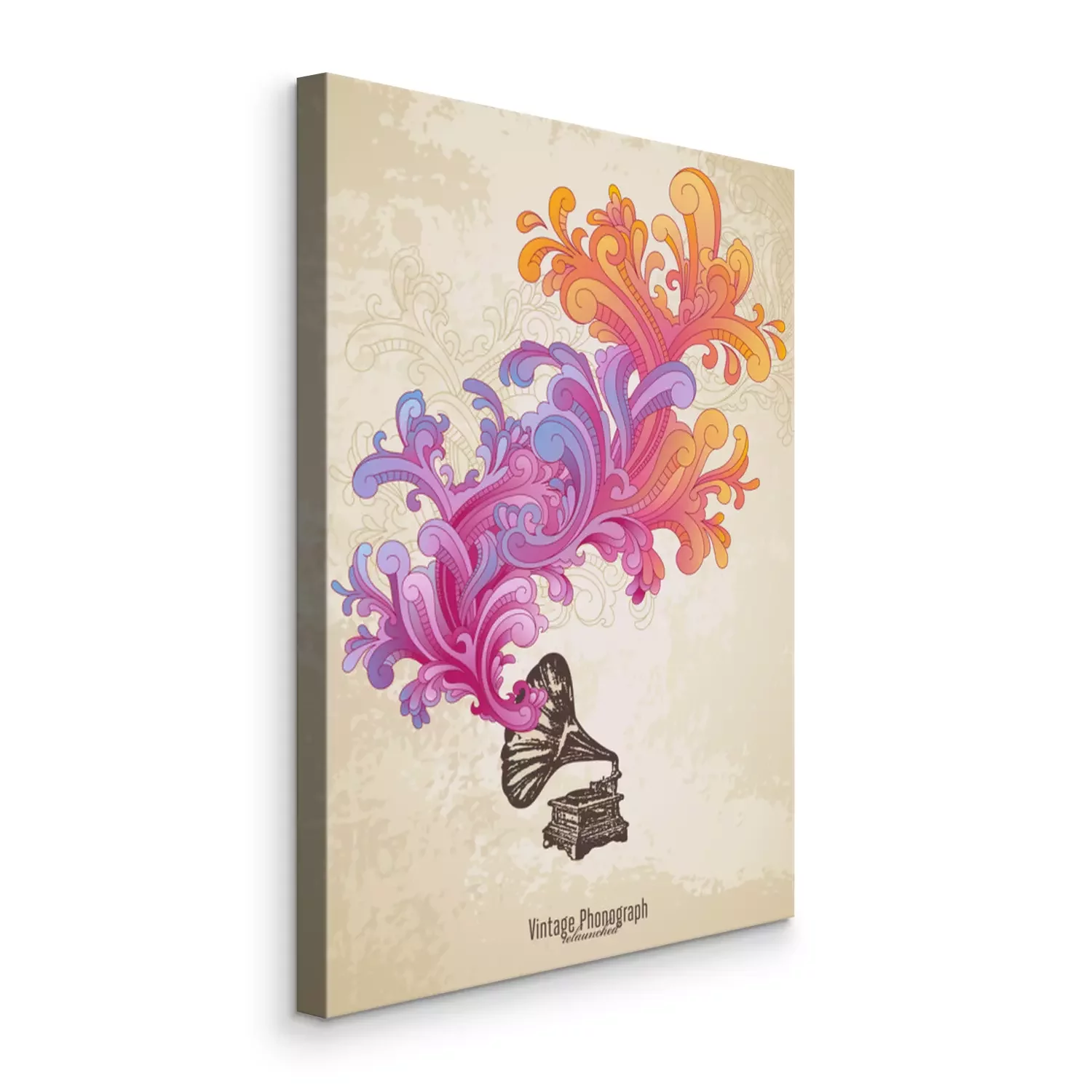 Tableau : composition de musique rétro avec phonographe et des remous colorés