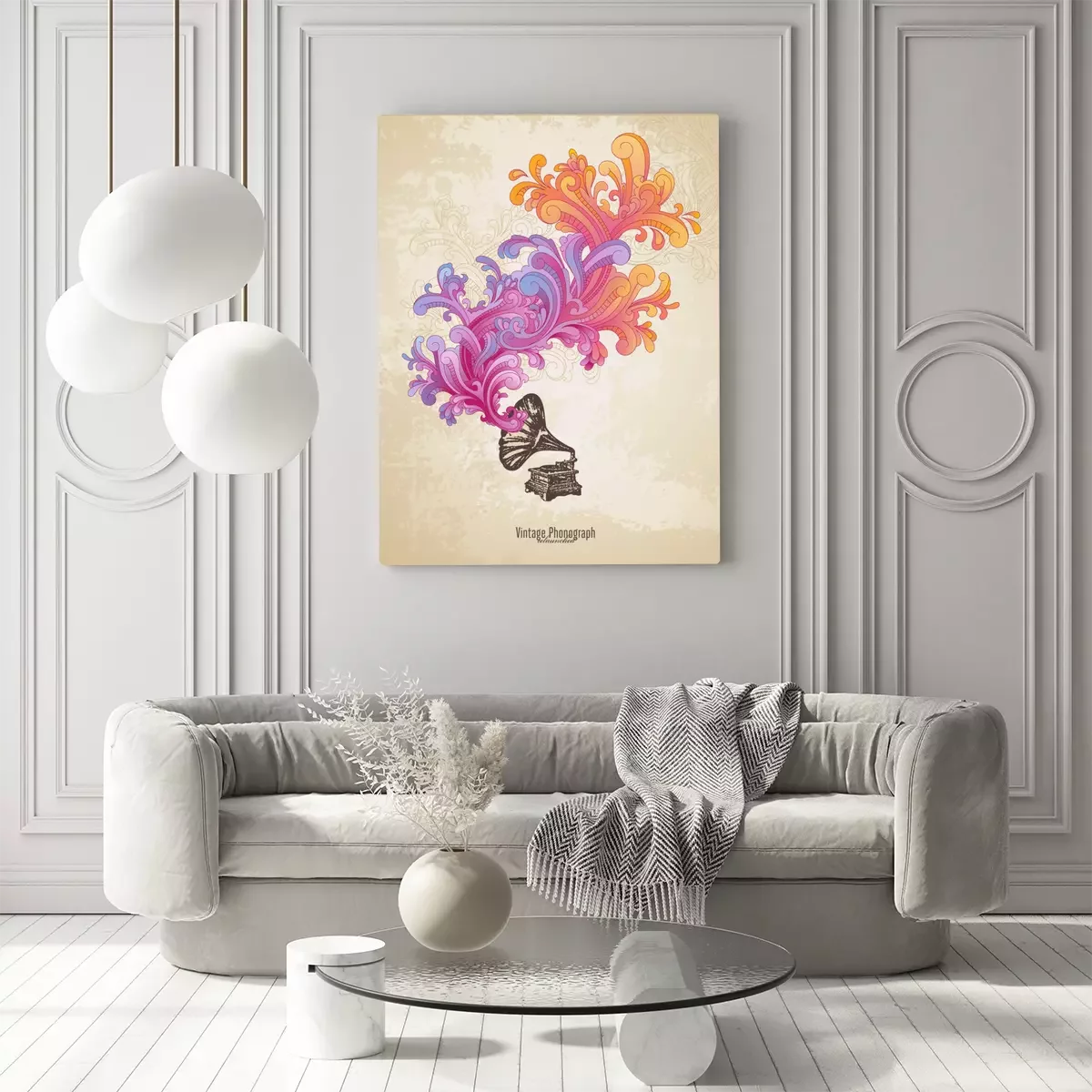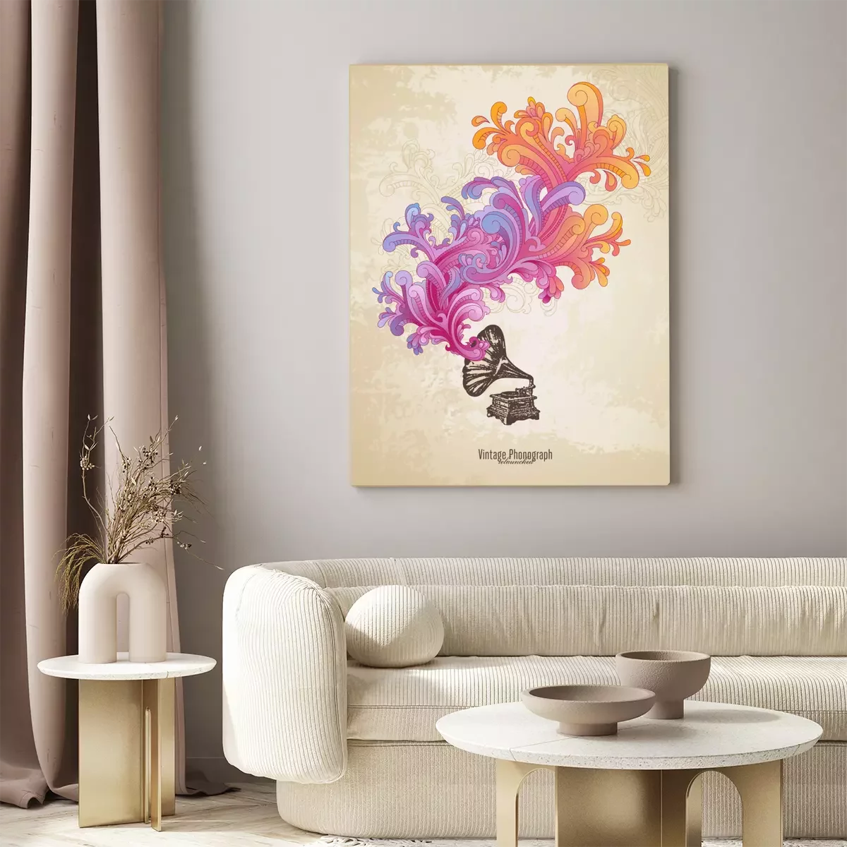 Tableau  composition de musique rétro avec phonographe et des remous colorés