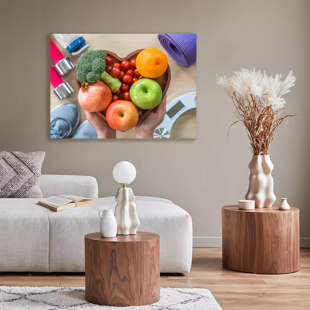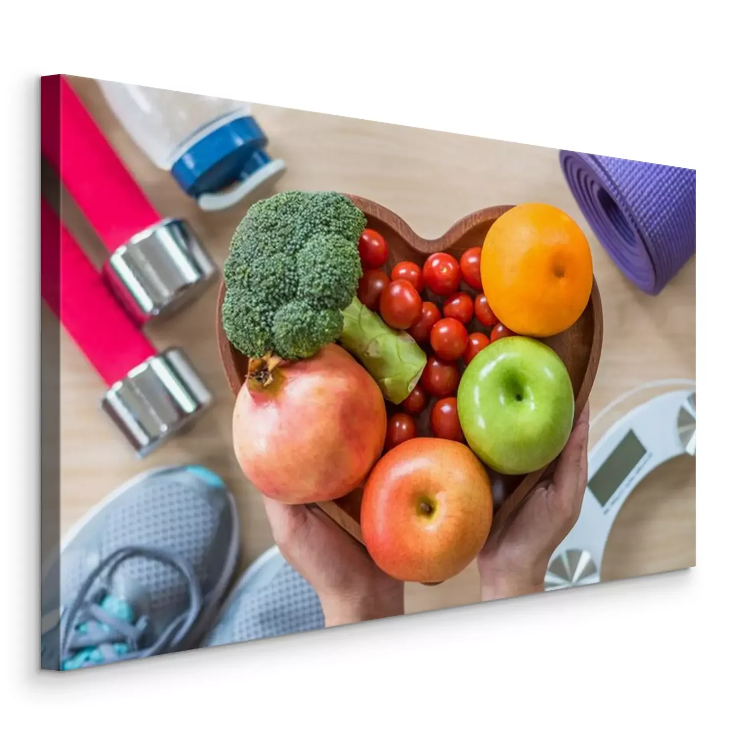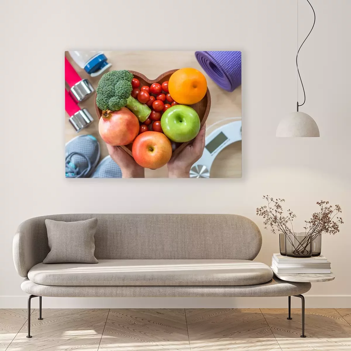 Tableau  Concept de mode de vie sain, nourriture saine bonne santé diététique dans le plat de coeur avec sporty gym aérobie exercice de remise en forme formation de classe équipement, échelle de poids et chaus