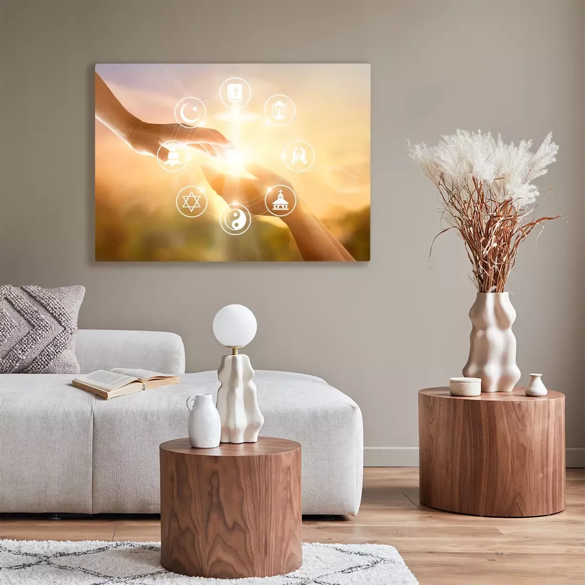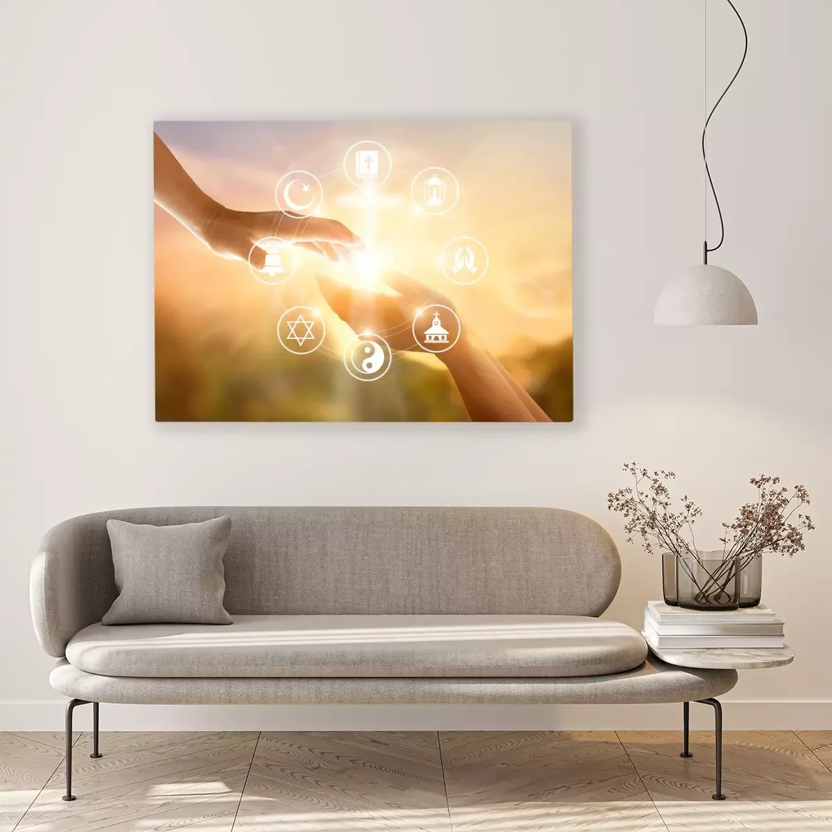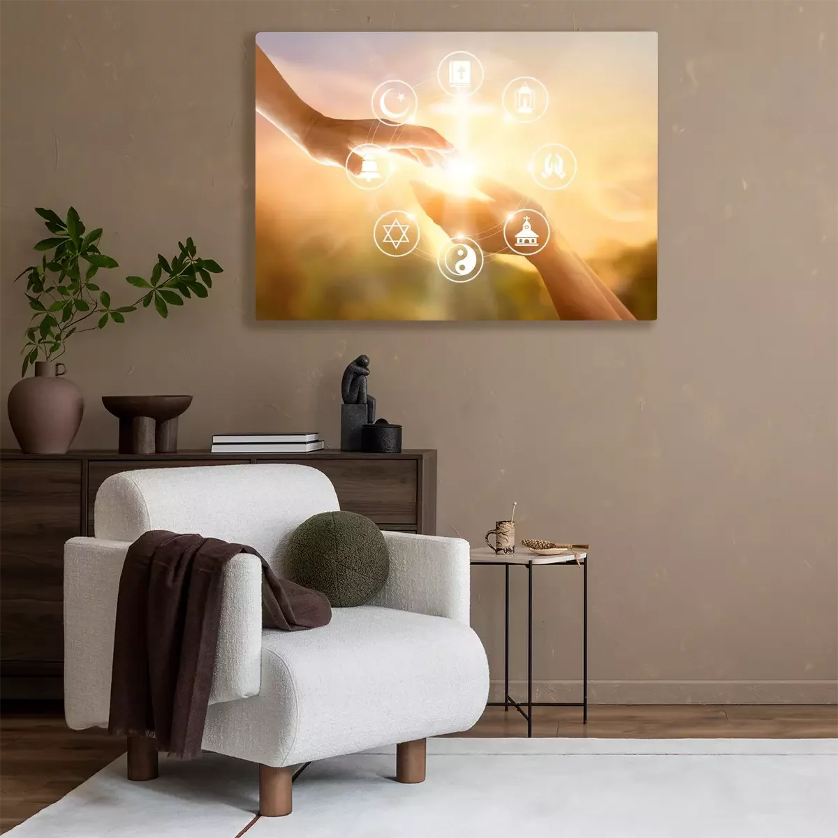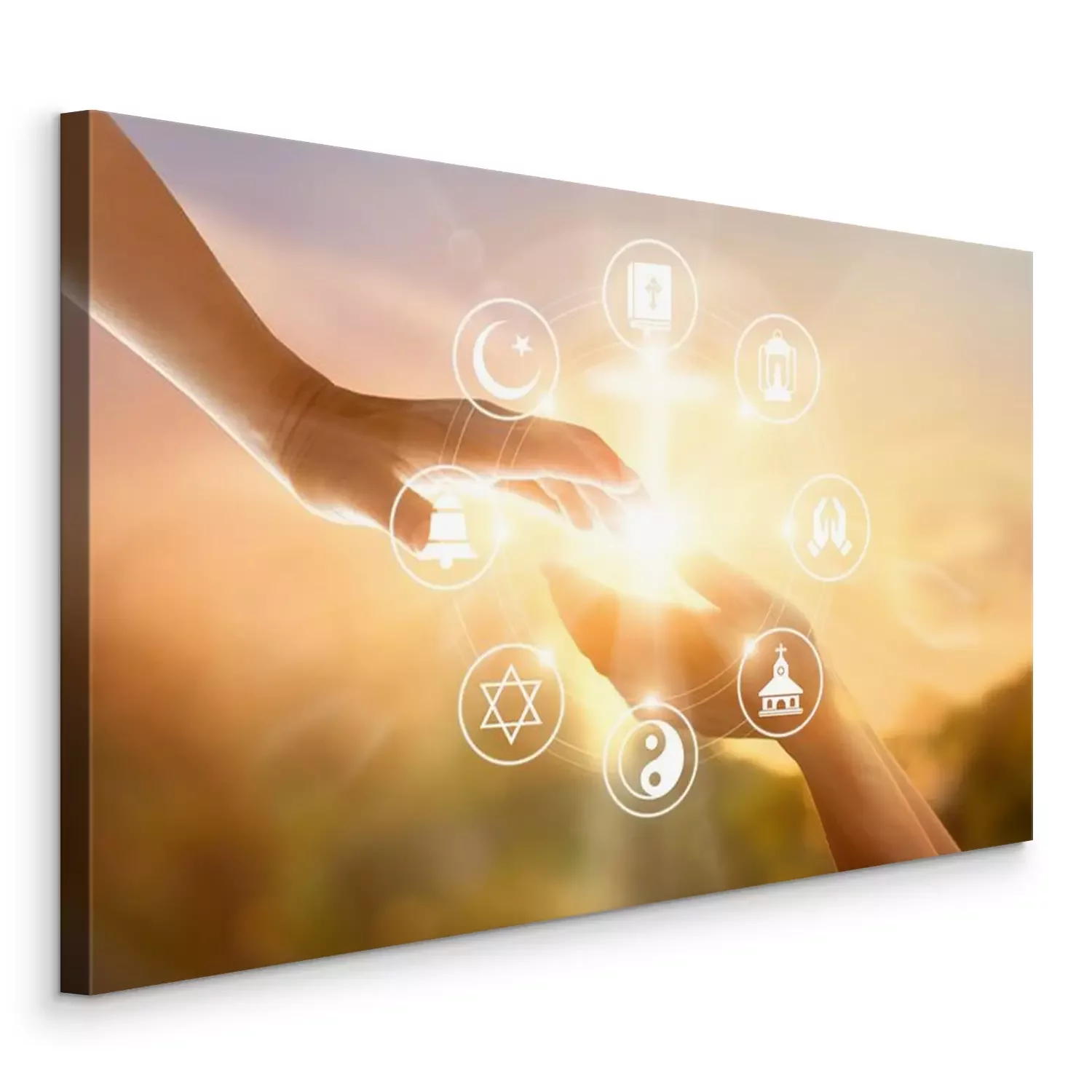 Tableau  Concept de religion. Des mains humaines pardonnent et bénissent ensemble. Icône de prière et de religions sur fond de coucher de soleil ciel