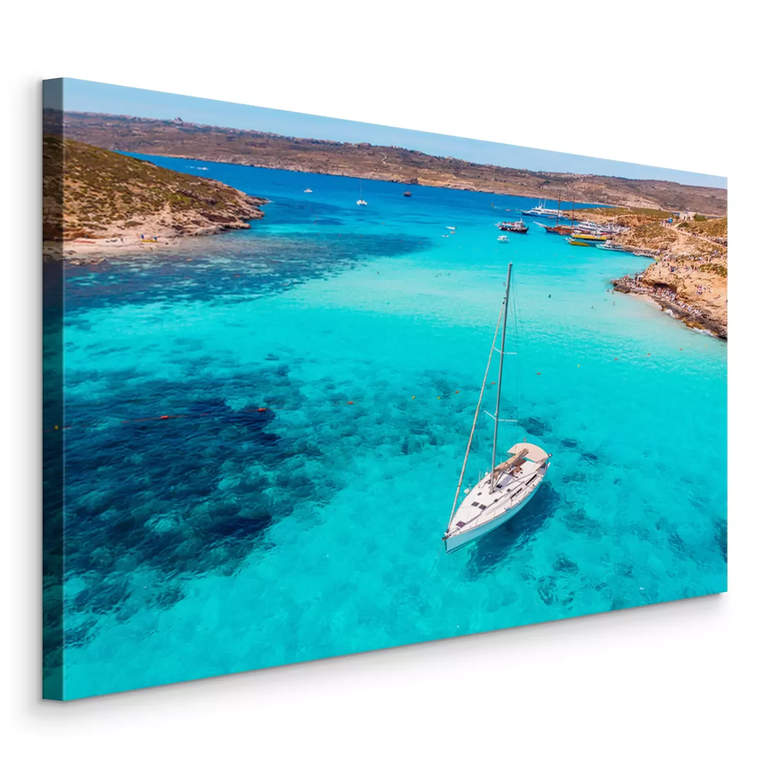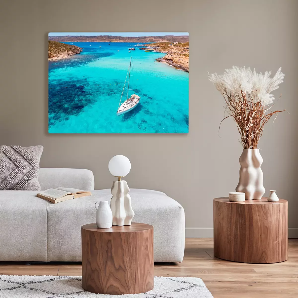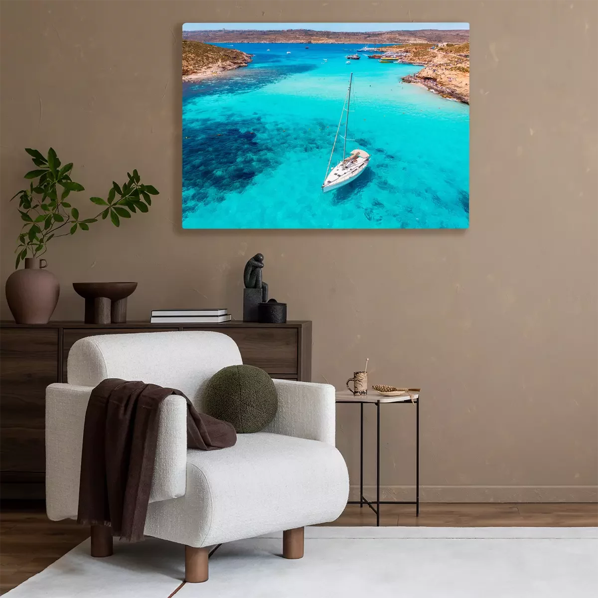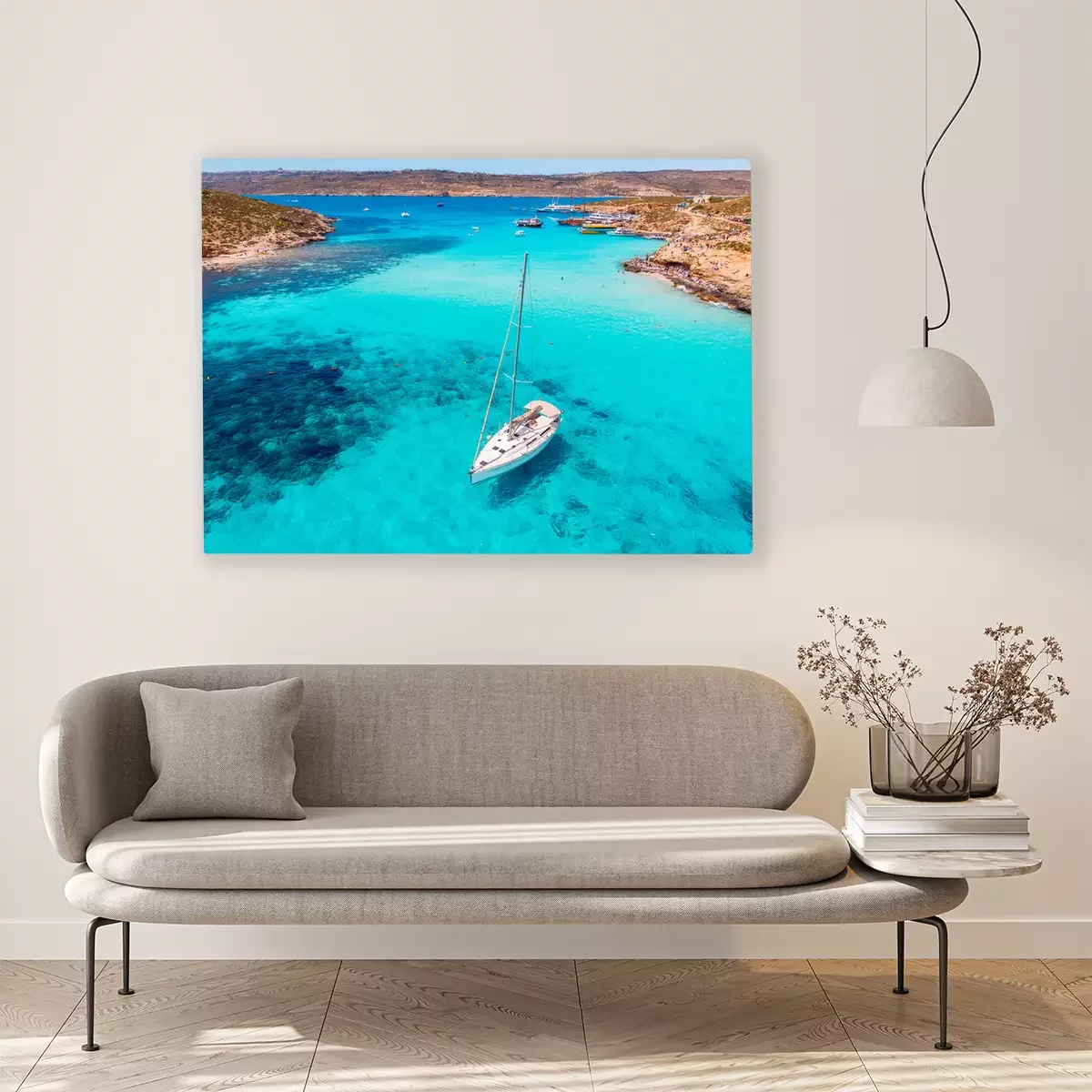 Tableau  Concept paradise vacation. White yacht with sail in clear water of sea with sand. Blue Lagoon Comino Malta. Aerial view