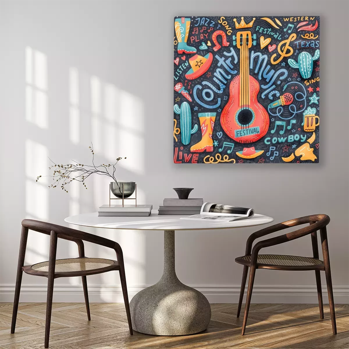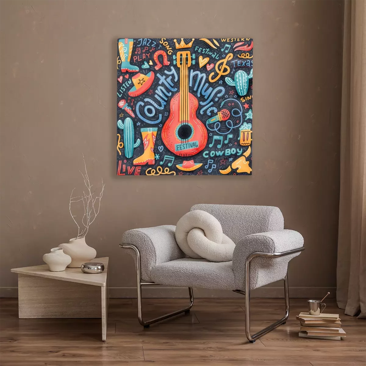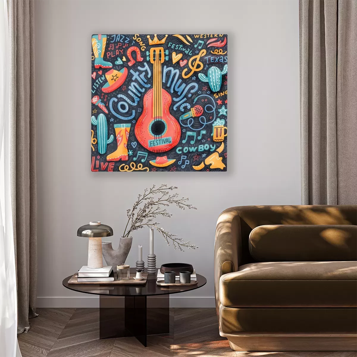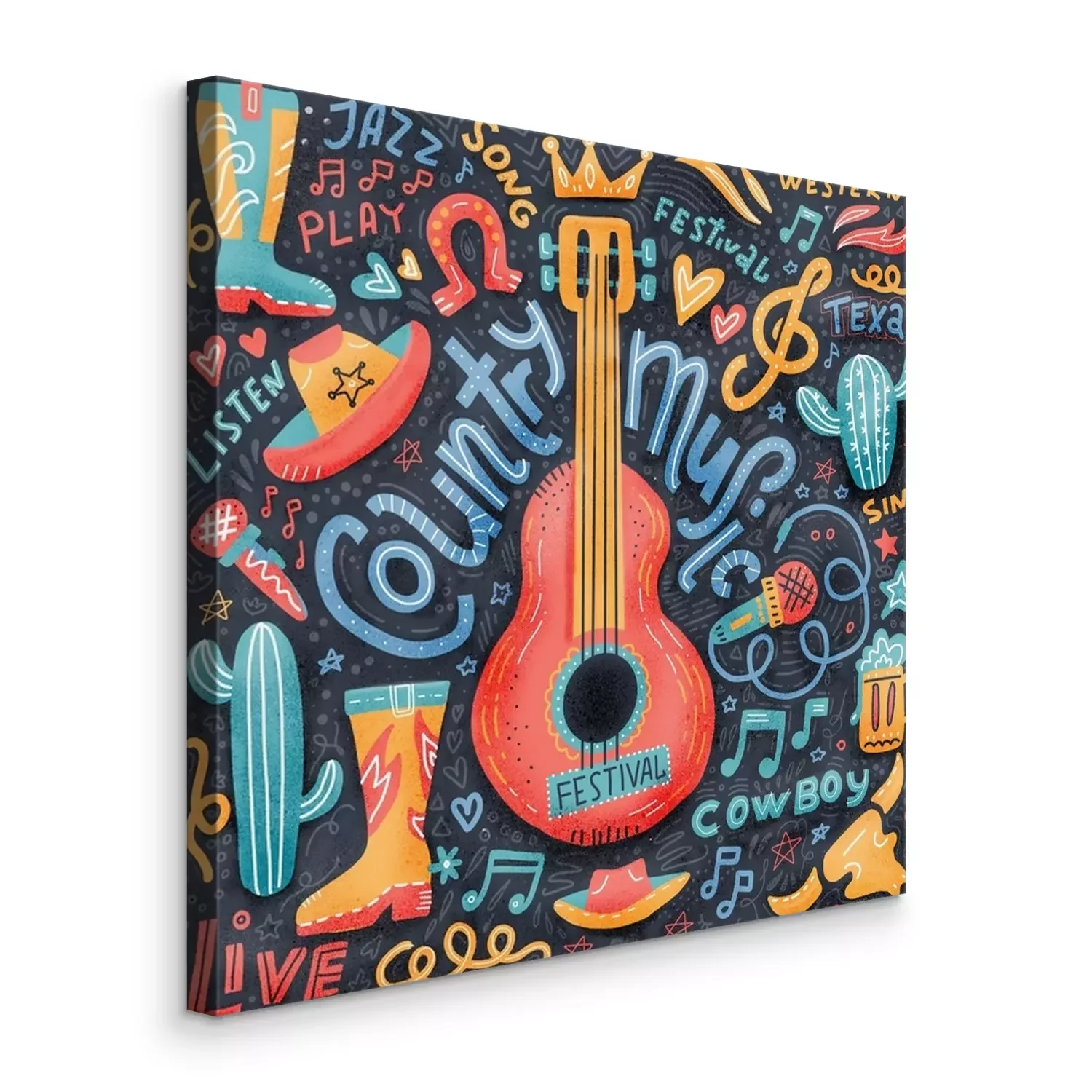 Tableau  Country music print concept for postcards or festival banners. hand drawn illustration in textured flat doodle style. Guitar with written lettering.
