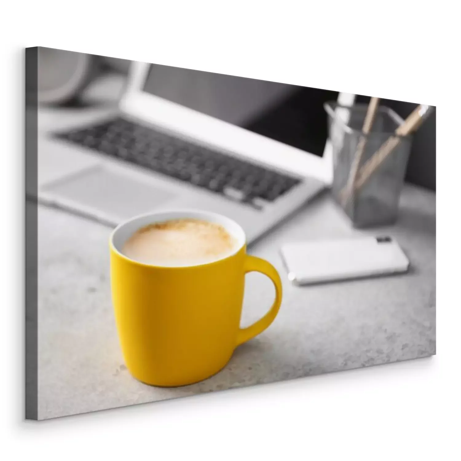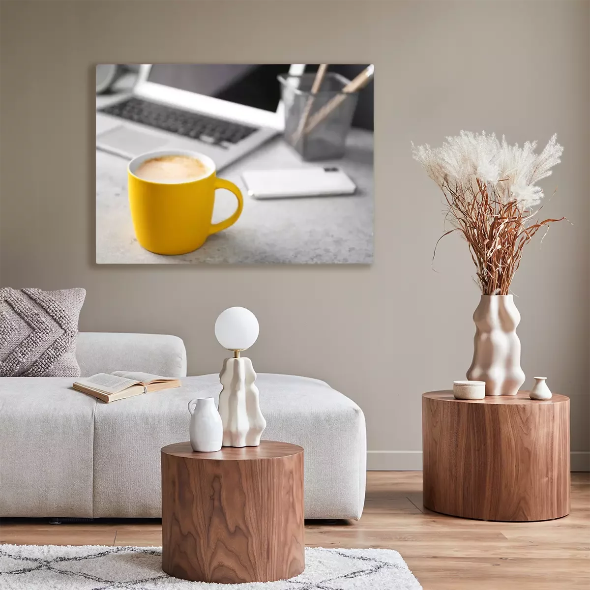 Tableau  Coupe jaune avec café sur la table de bureau. Espace pour le texte