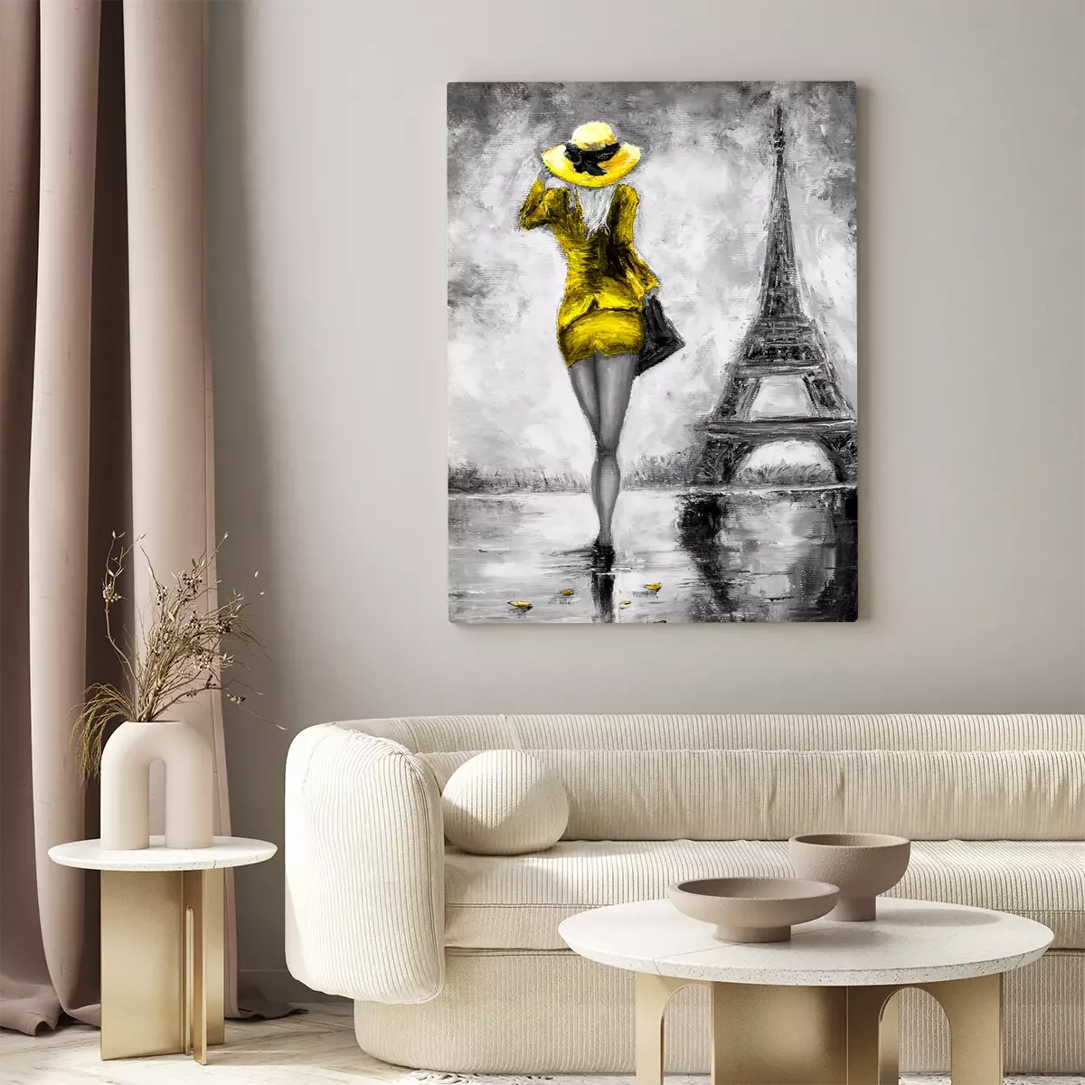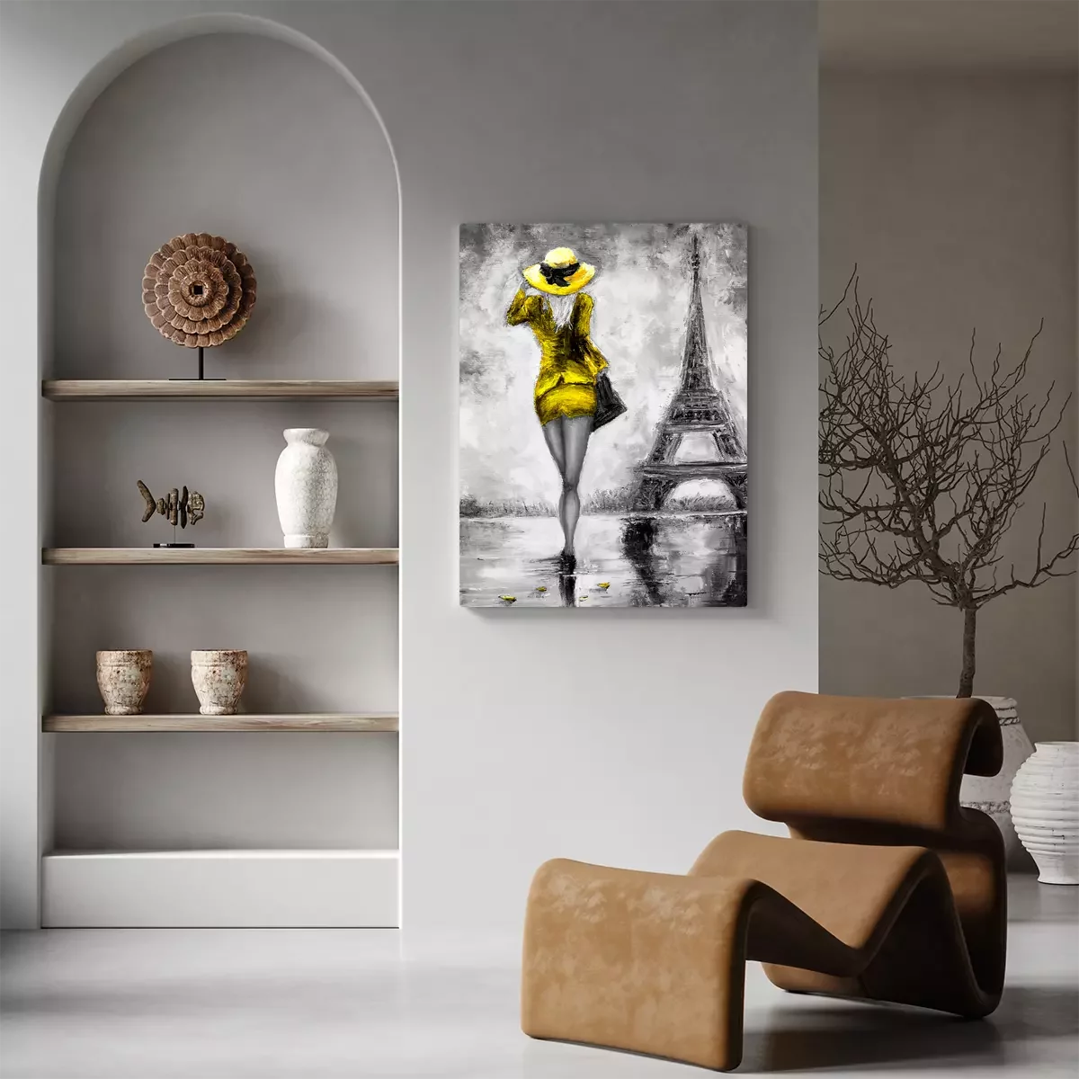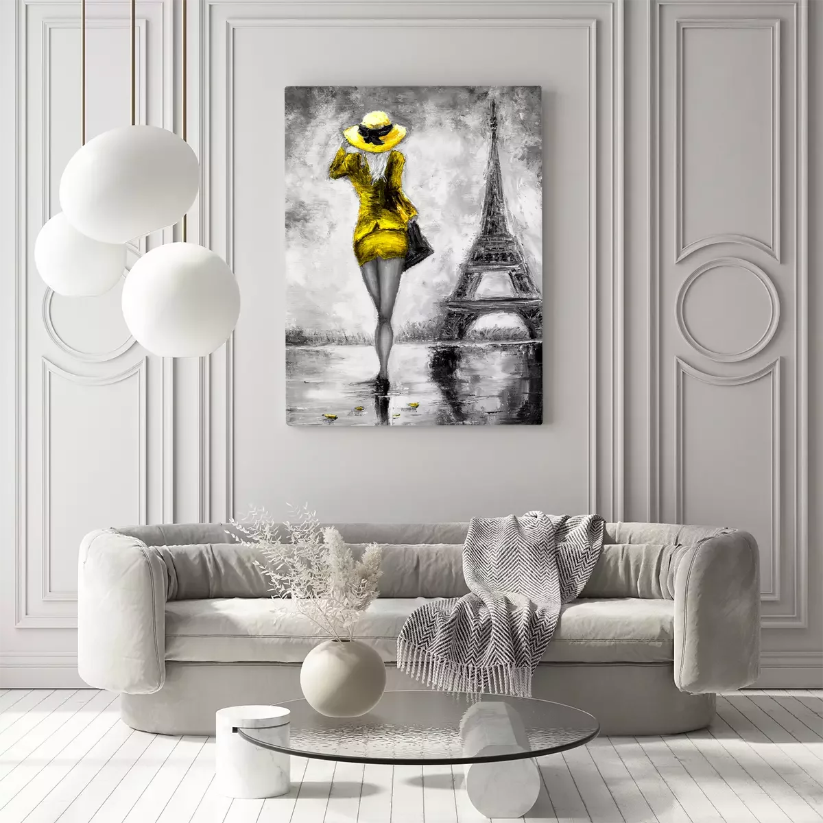 Croquis d'une femme en robe et chapeau, avec la tour eiffel en arrière-plan.