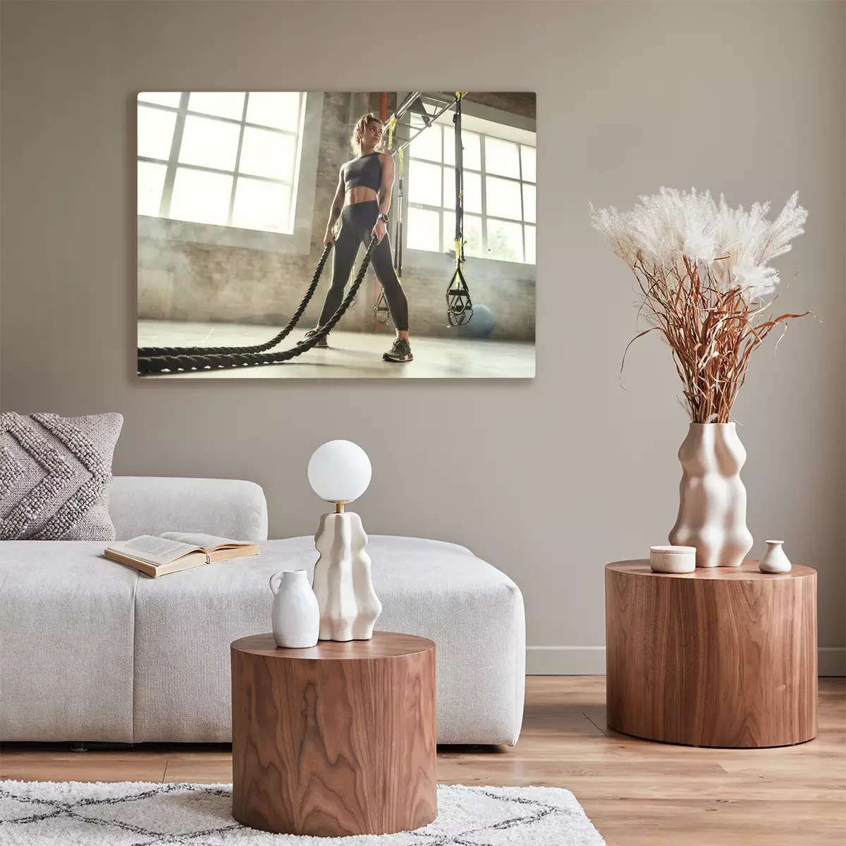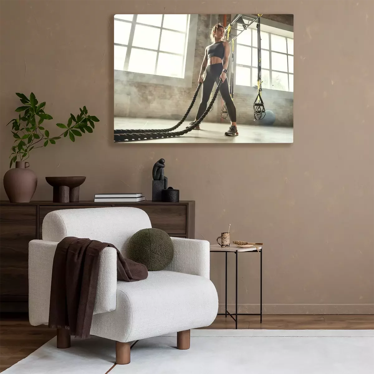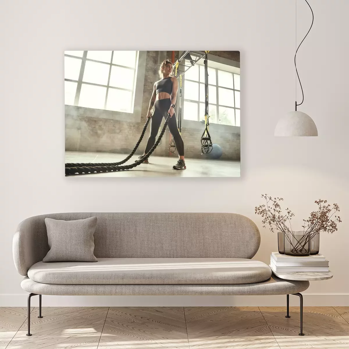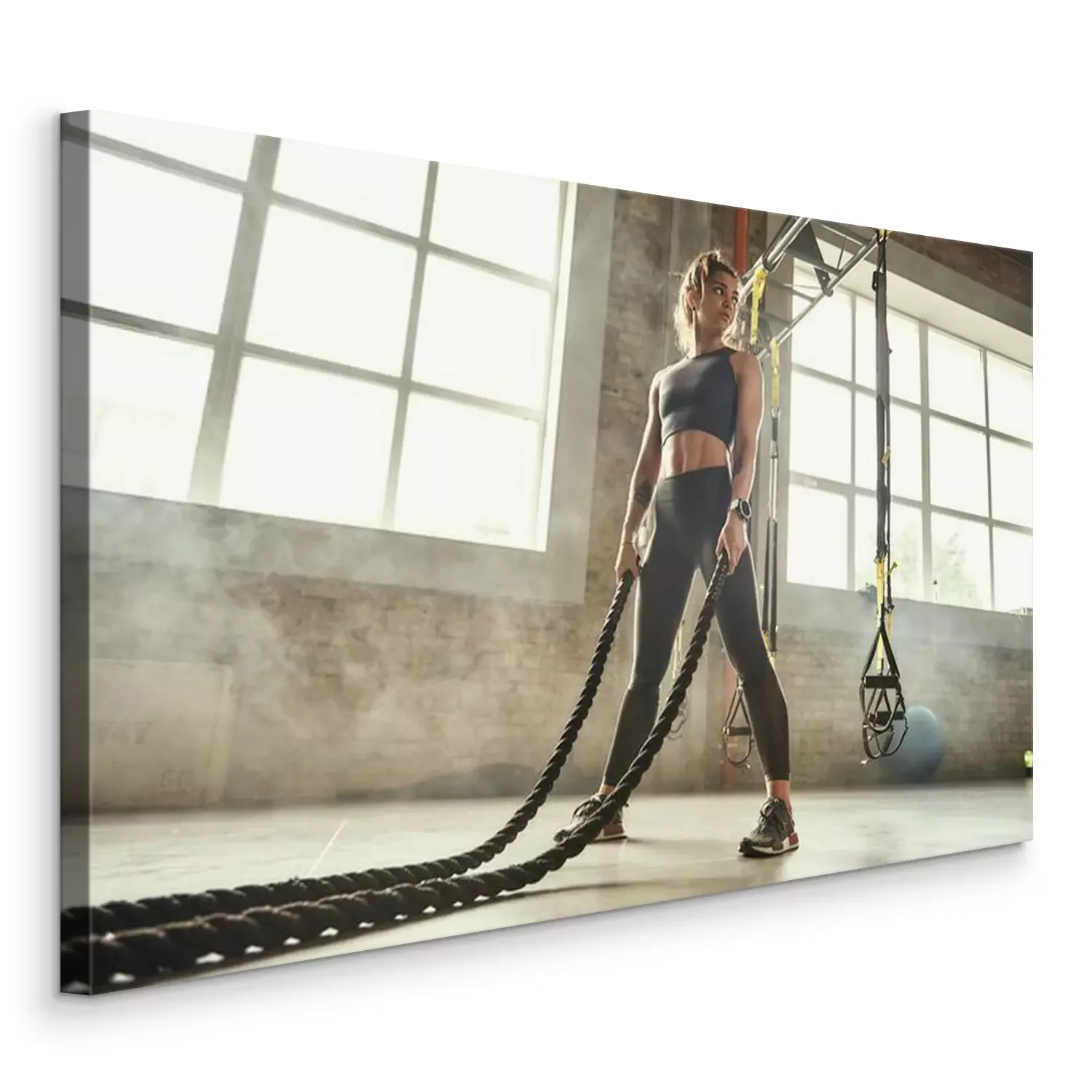 Tableau : CrossFit training. Young athletic woman with perfect body doing crossfit exercises with a rope in the gym.