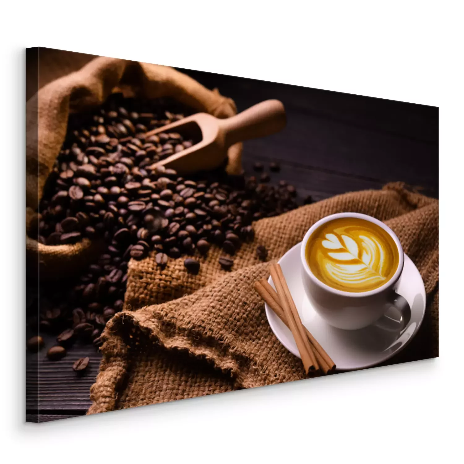 Tableau  Cup of coffee latte and coffee beans in burlap sack on old wooden background