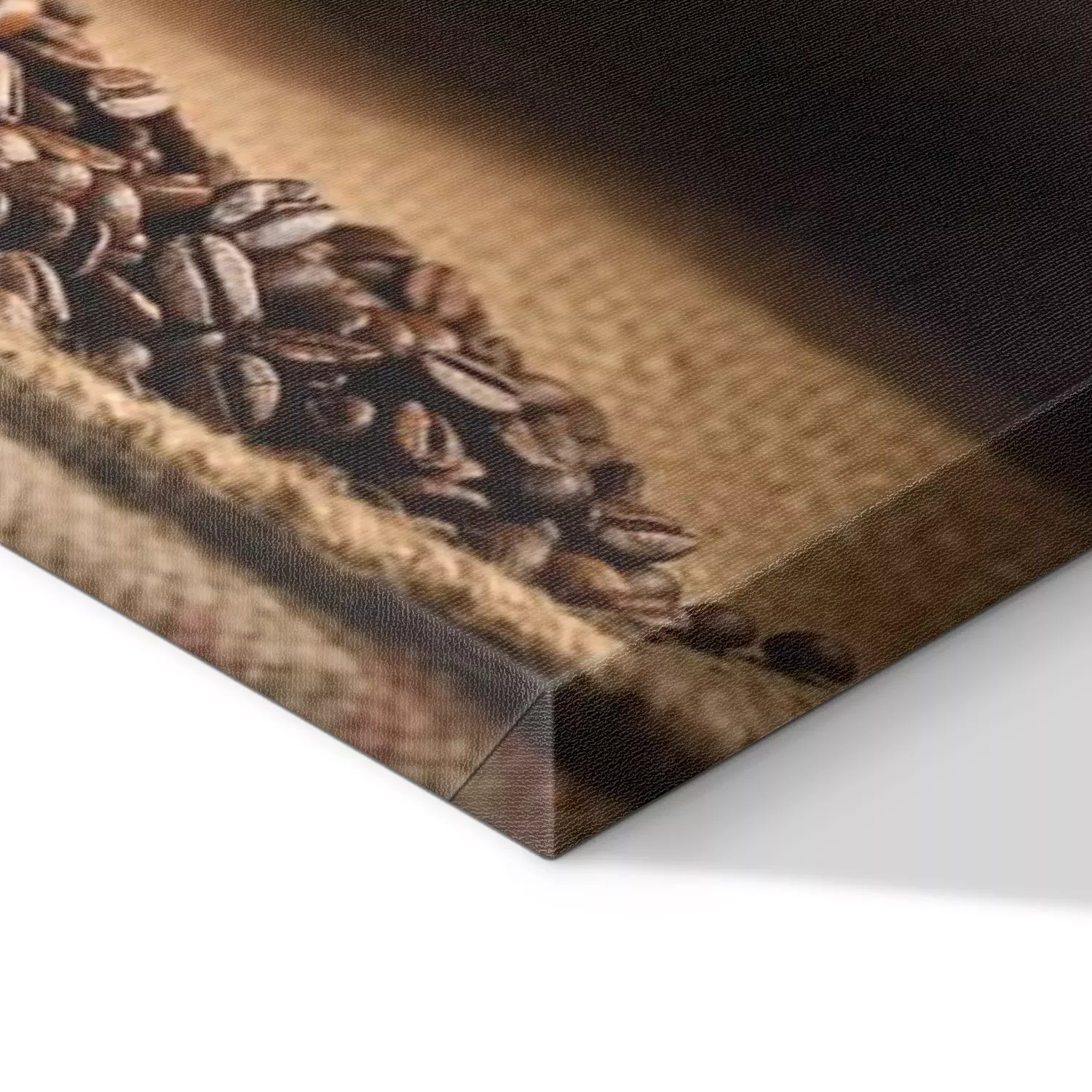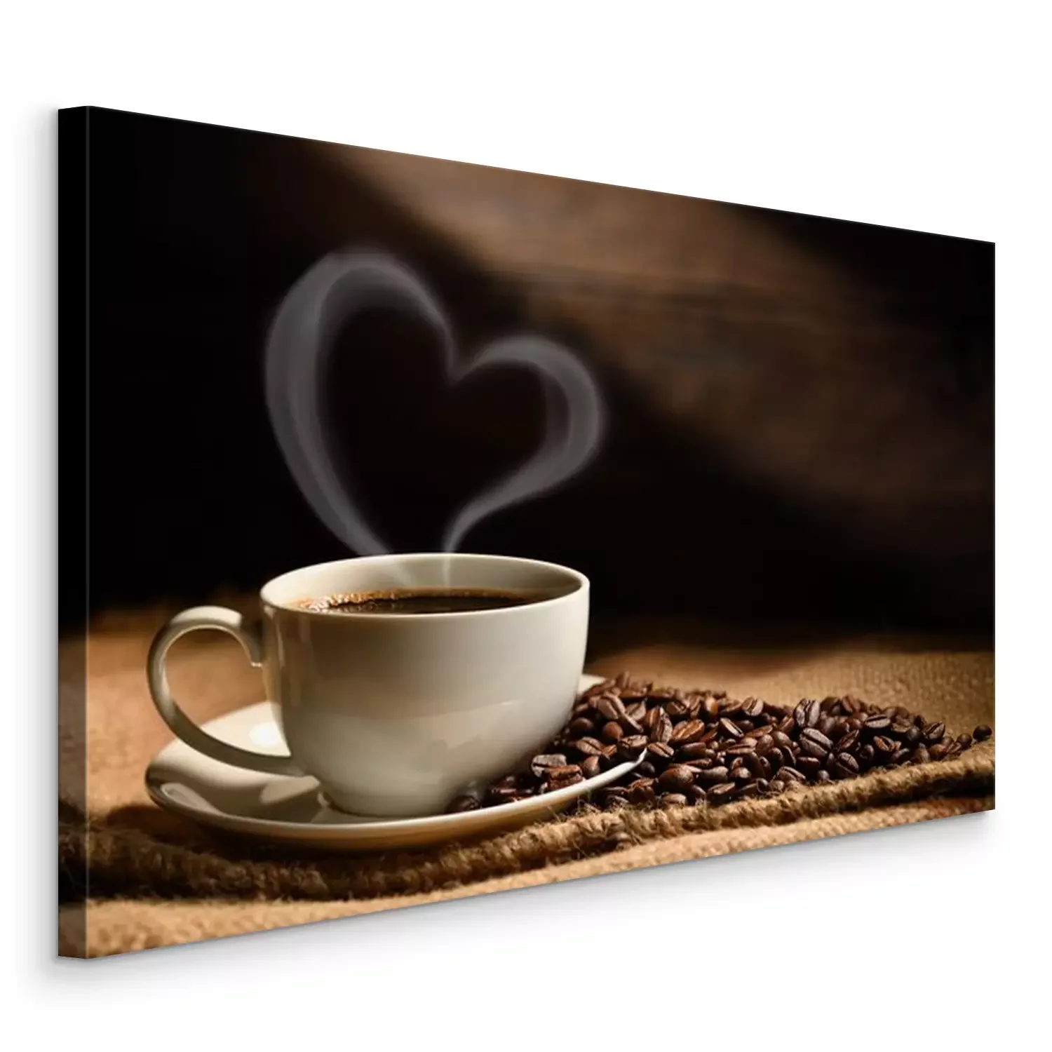 Tableau  Cup of coffee with heart shape smoke and coffee beans on burlap sack on old wooden background