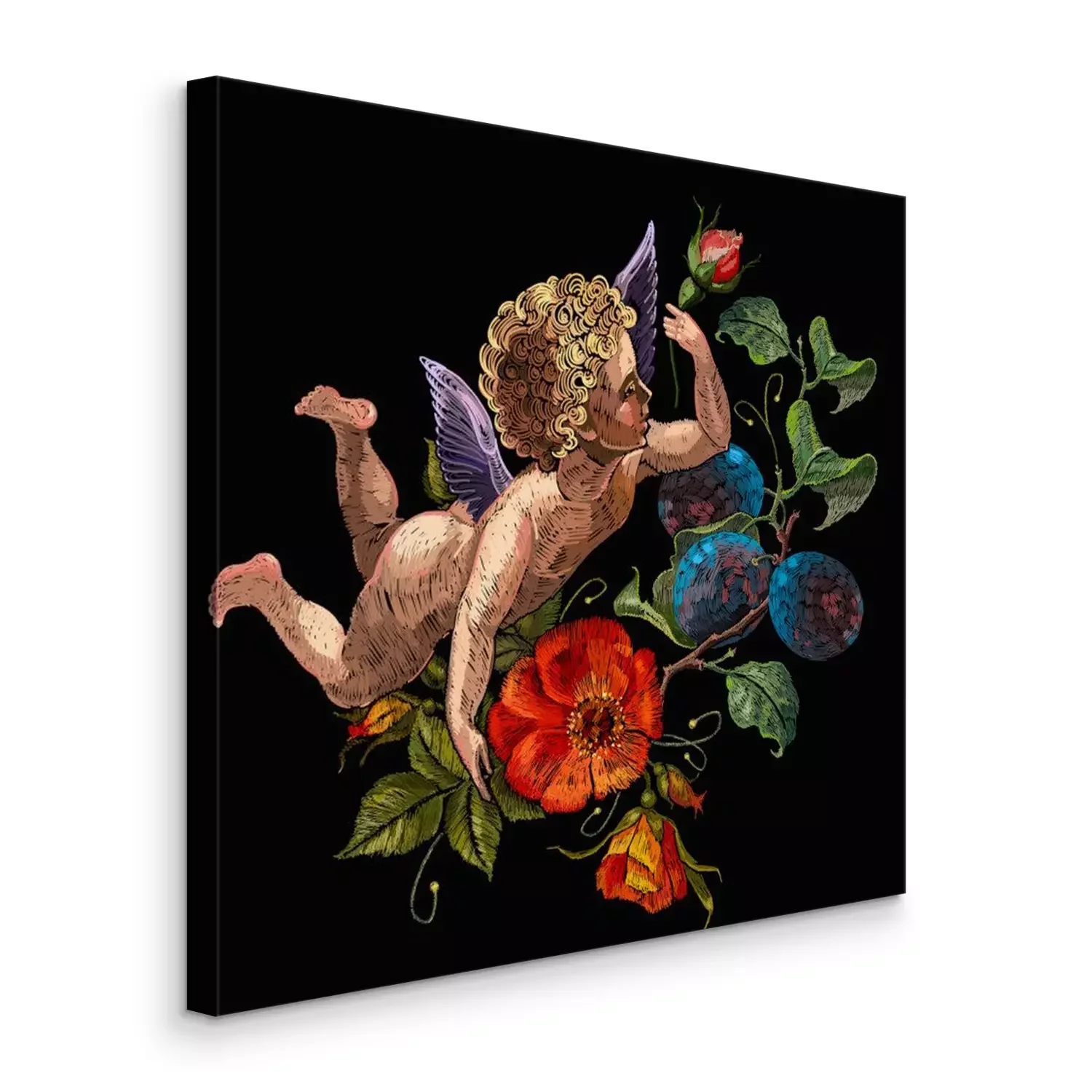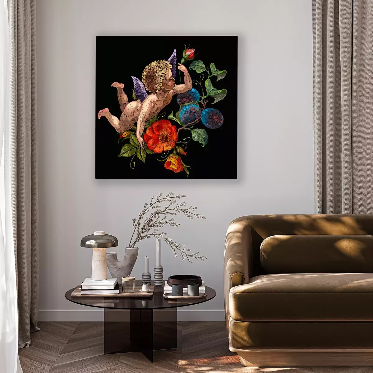 Tableau  Cupidon au milieu de fleurs sur un fond noir
