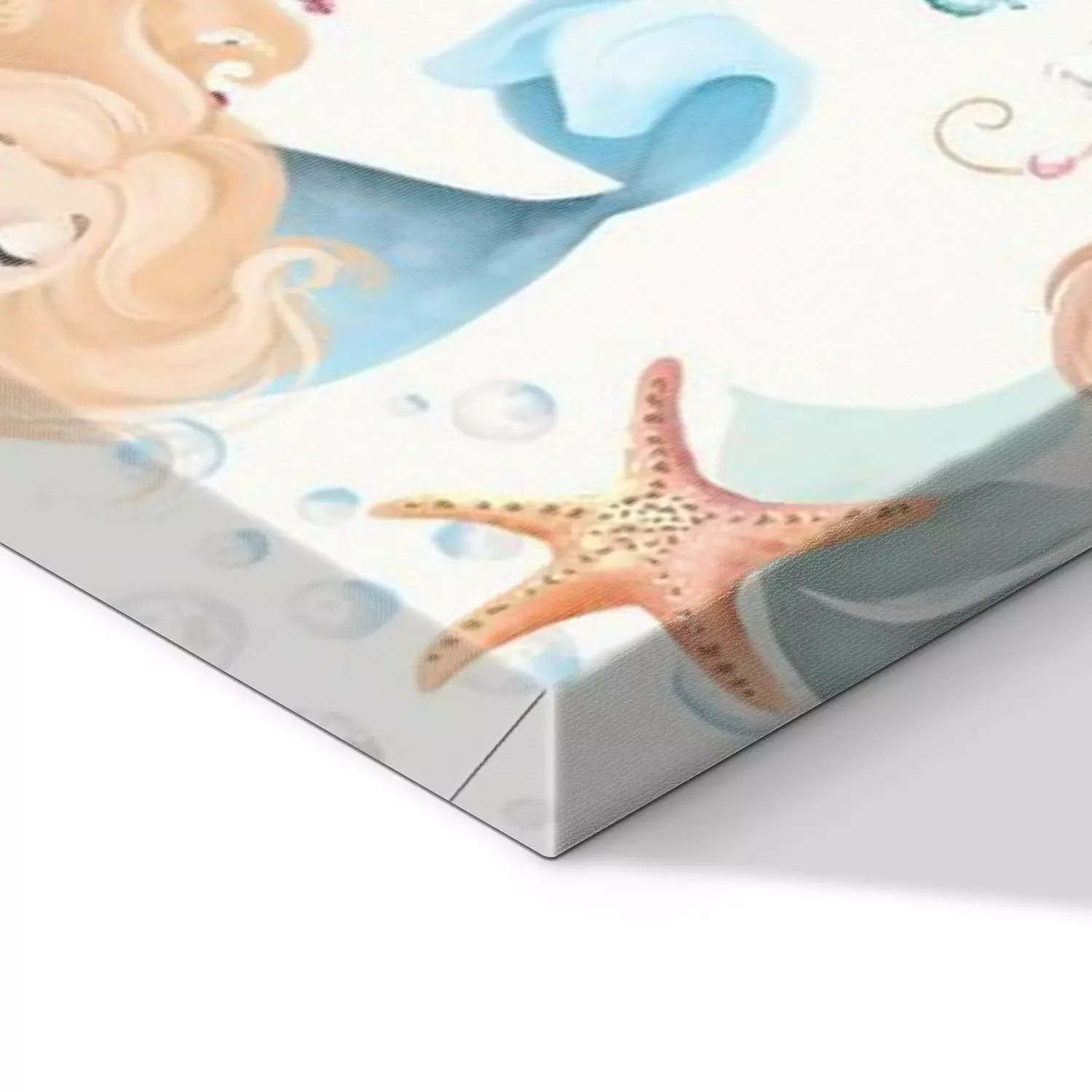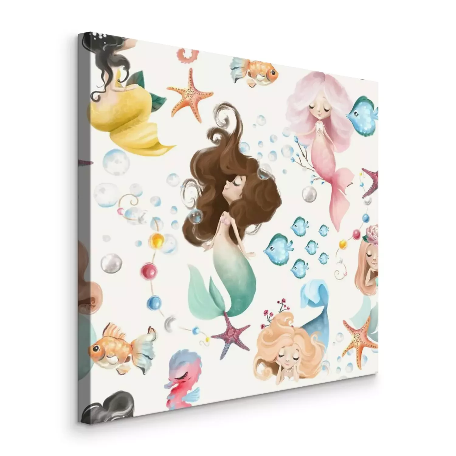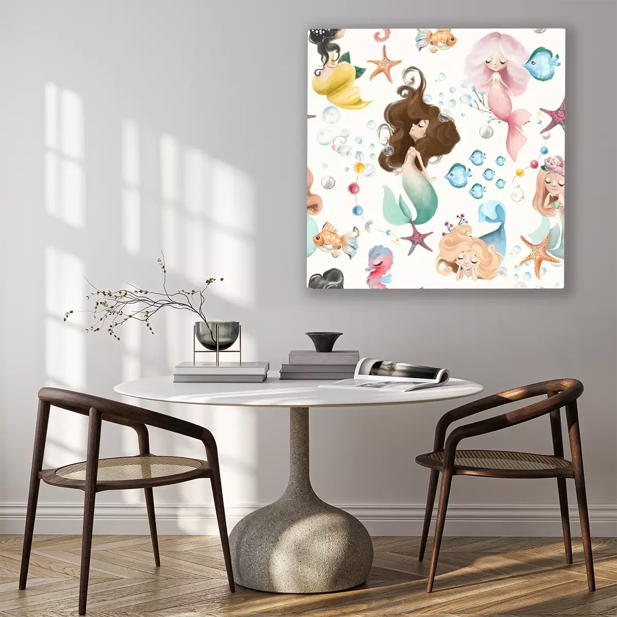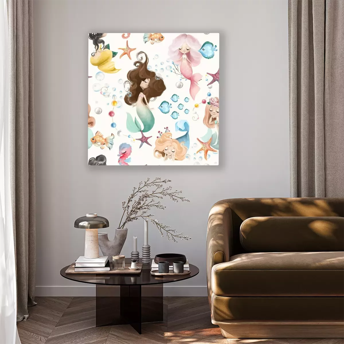 Tableau  Cute and beautiful seamless pattern - little mermaids, fishes and flowers watercolor illustration