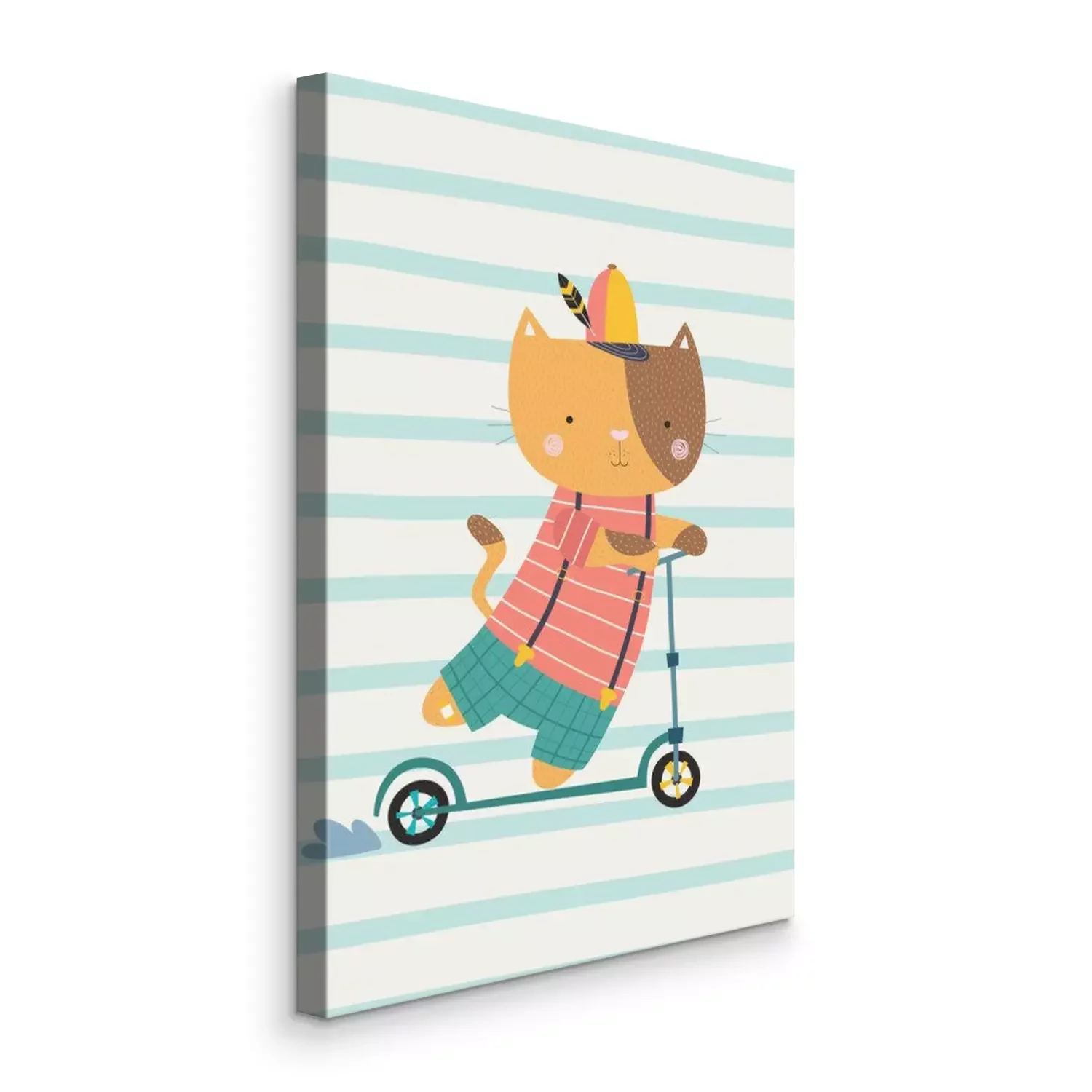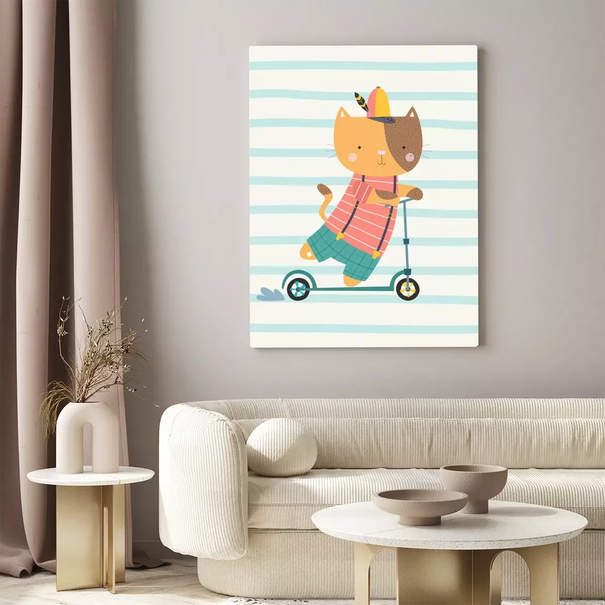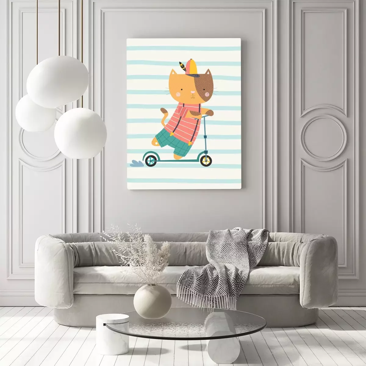 Tableau  Cute cat on a scooter. Vector illustration in a scandinavian style. Cute and funny poster.