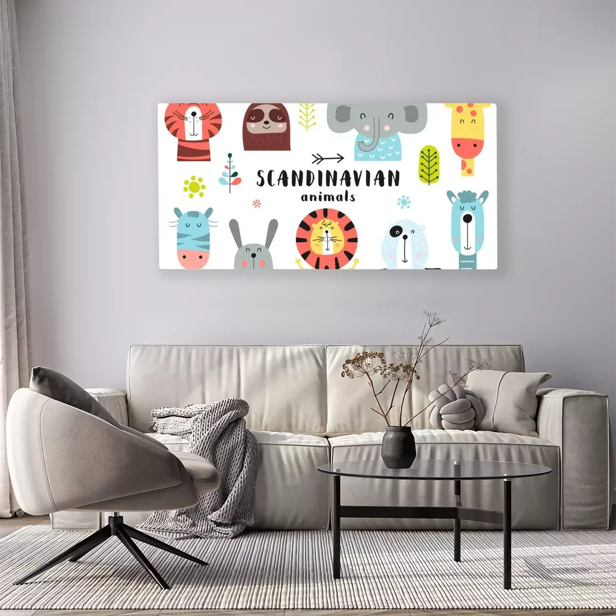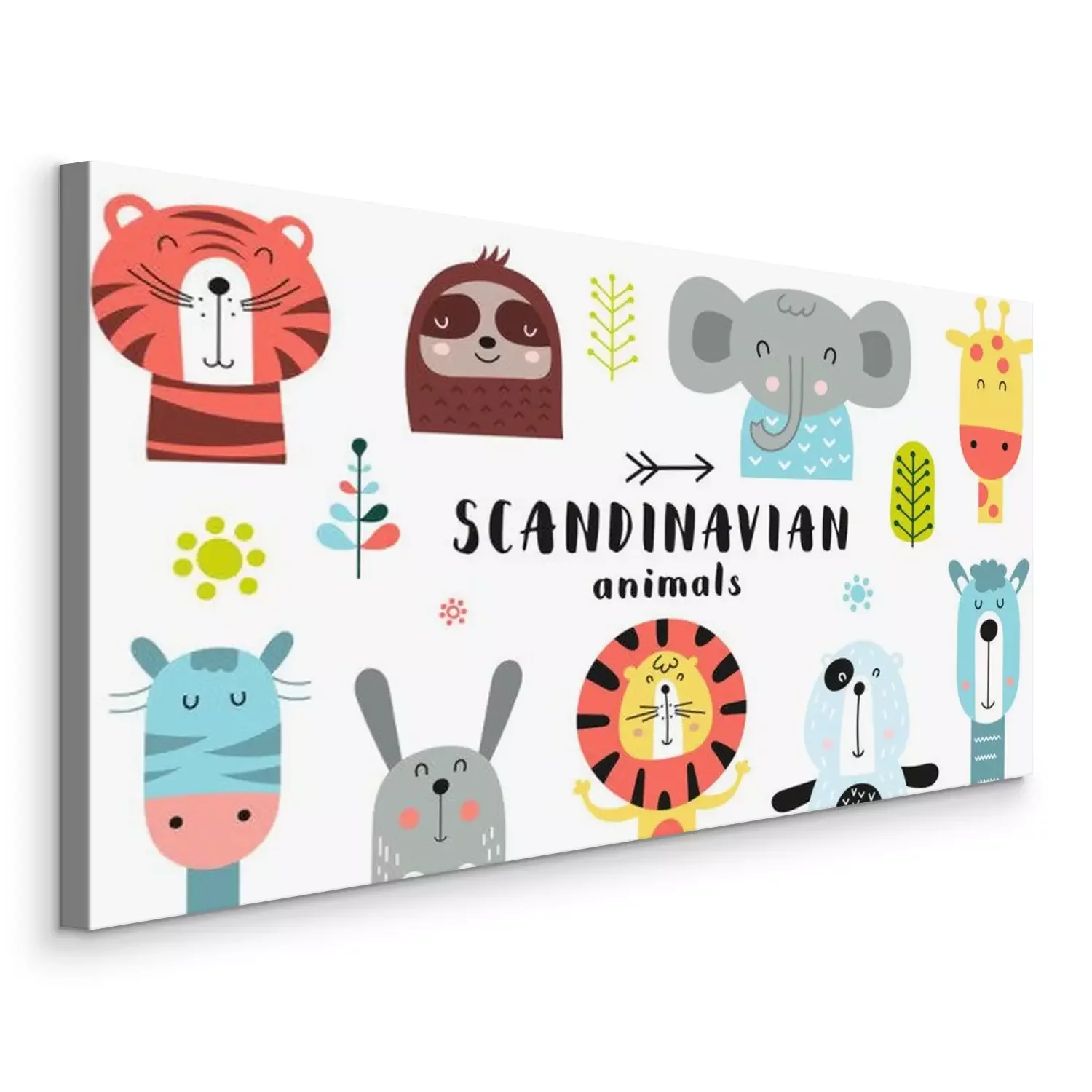 Tableau  Cute scandinavian animals set. Hand drawn. Doodle cartoon animals for nursery posters, cards, kids t-shirts. Vector illustration. Tiger, lazy sloth, elephant, giraffe, zebra, hare, lion, bear, llama.