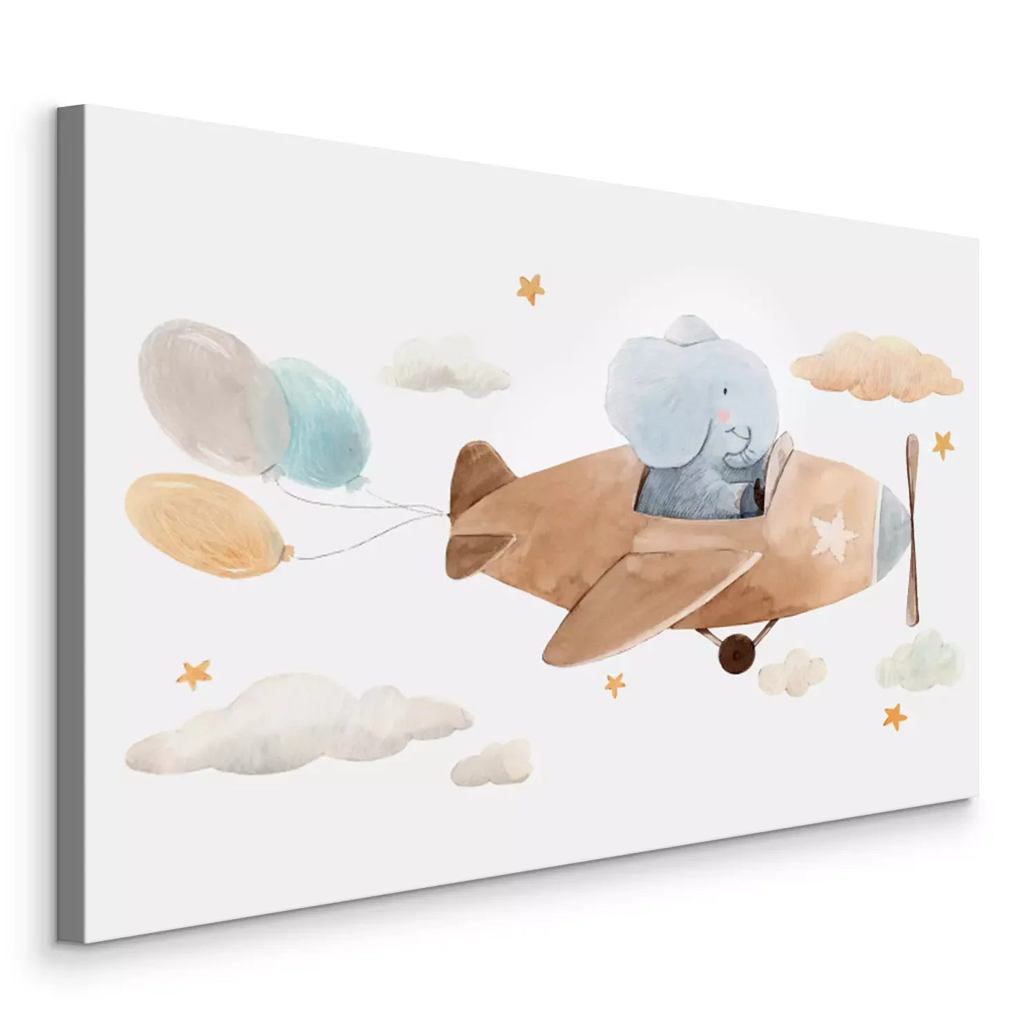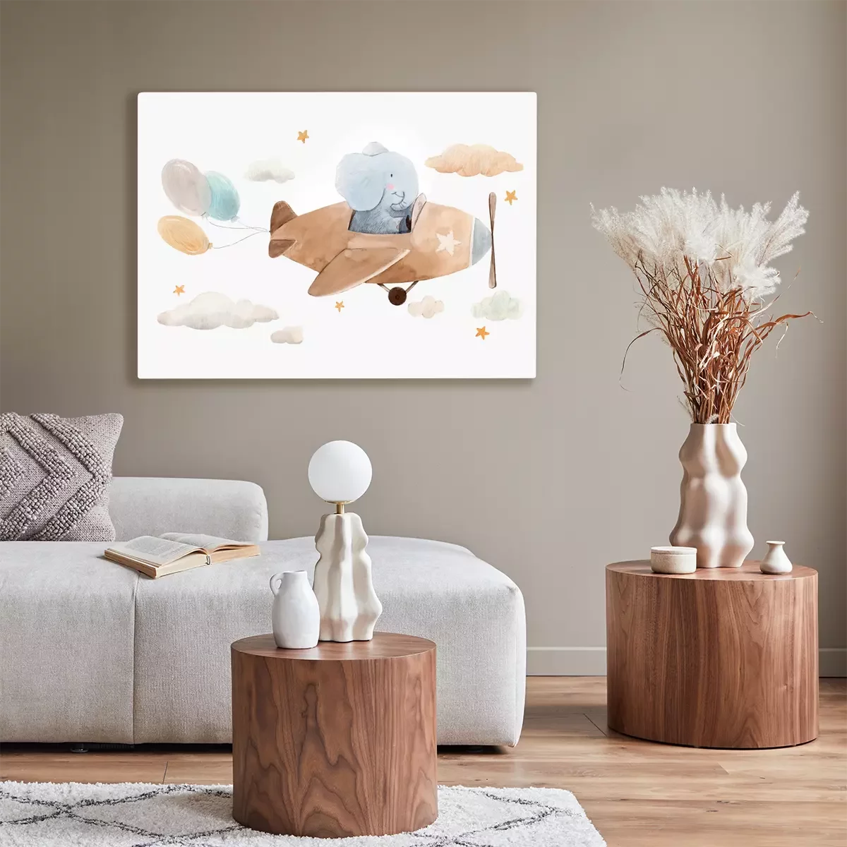 Tableau  Cute watercolor artwork with baby elephant on the plane with air baloons, clouds and stars. Stock illustration.