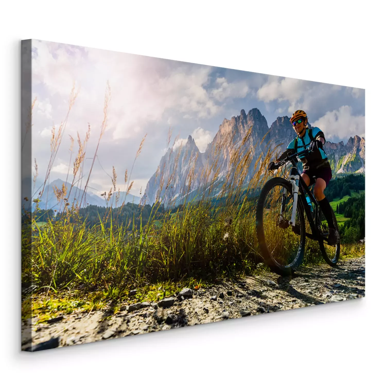 Tableau  Cycling outdoor adventure in Dolomites. Cycling woman in Dolomites landscape. Woman cycling MTB enduro trail track. Outdoor sport activity.
