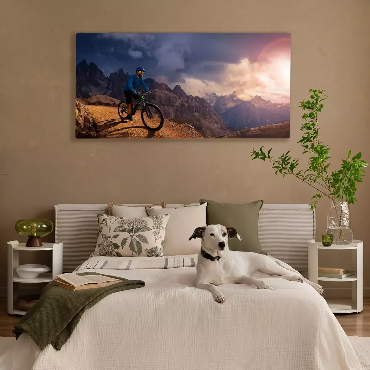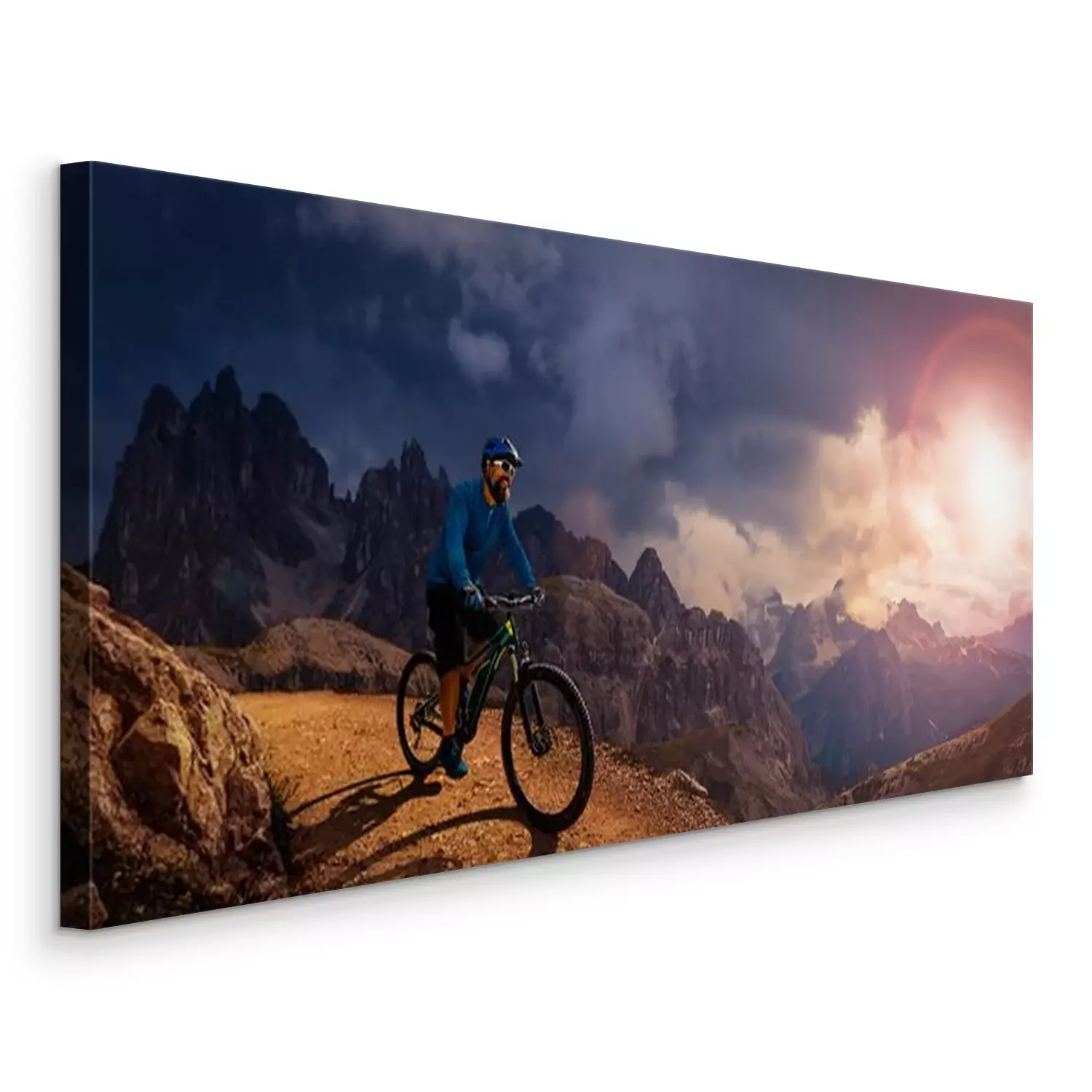 Tableau  Cycling outdoor adventure. Man cycling on electric bike, rides mountain trail. Man riding on bike in Dolomites mountains landscape. Cycling e-mtb enduro trail track. Outdoor sport activity.