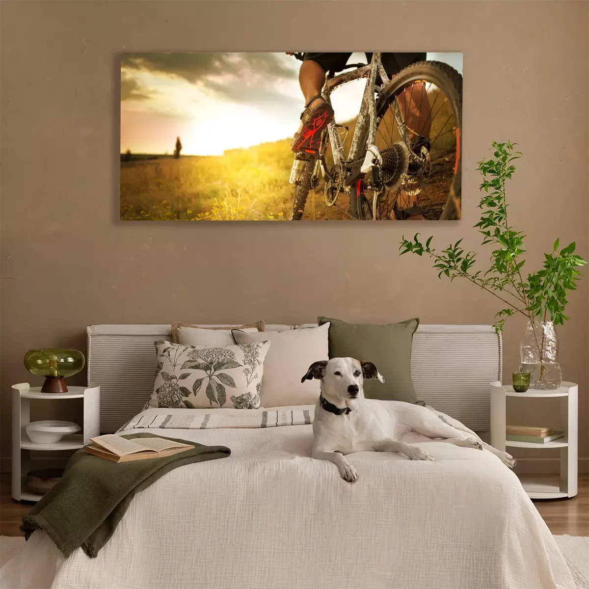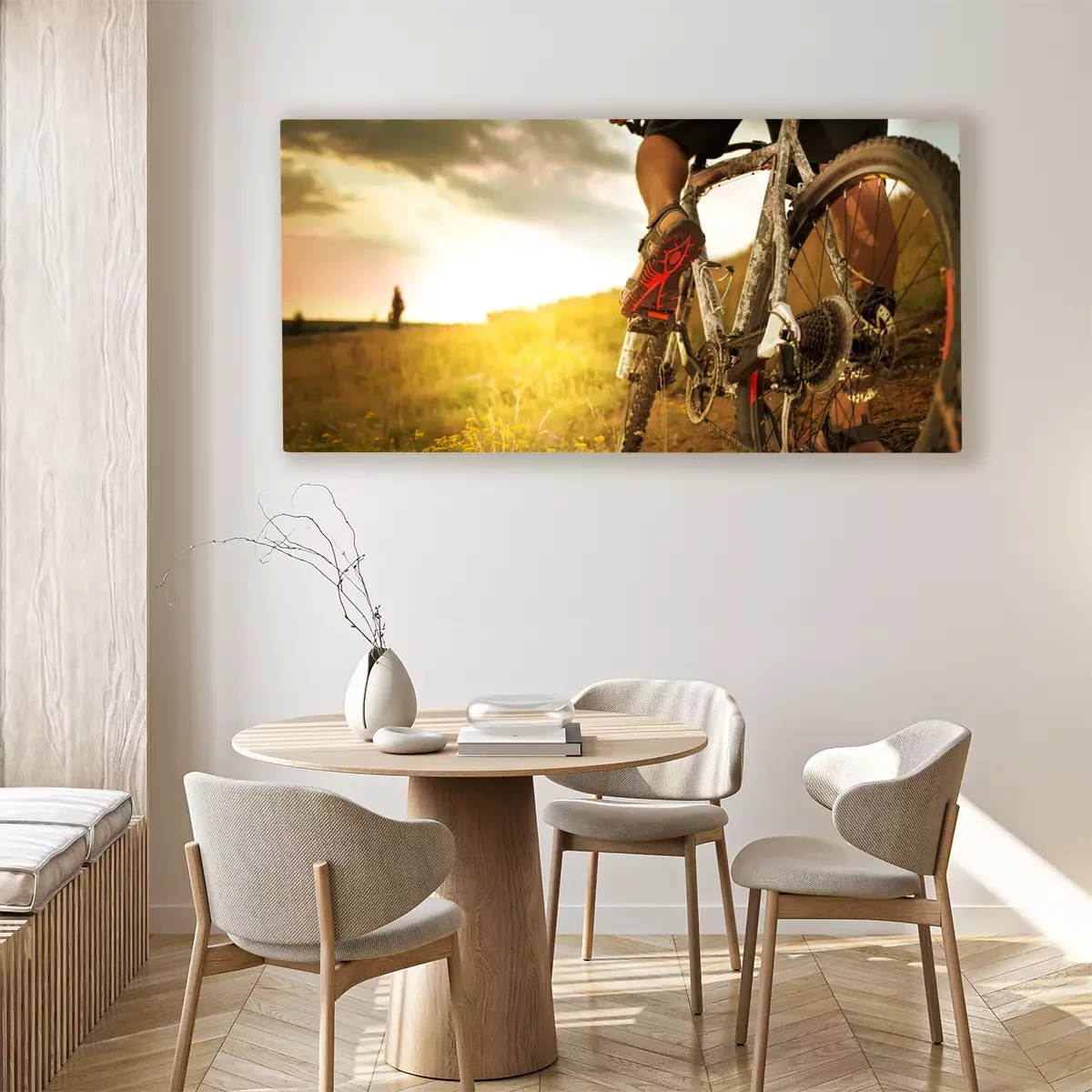 Tableau  Cyclist riding the bike down rocky hill at sunset. Close up extreme sport concept