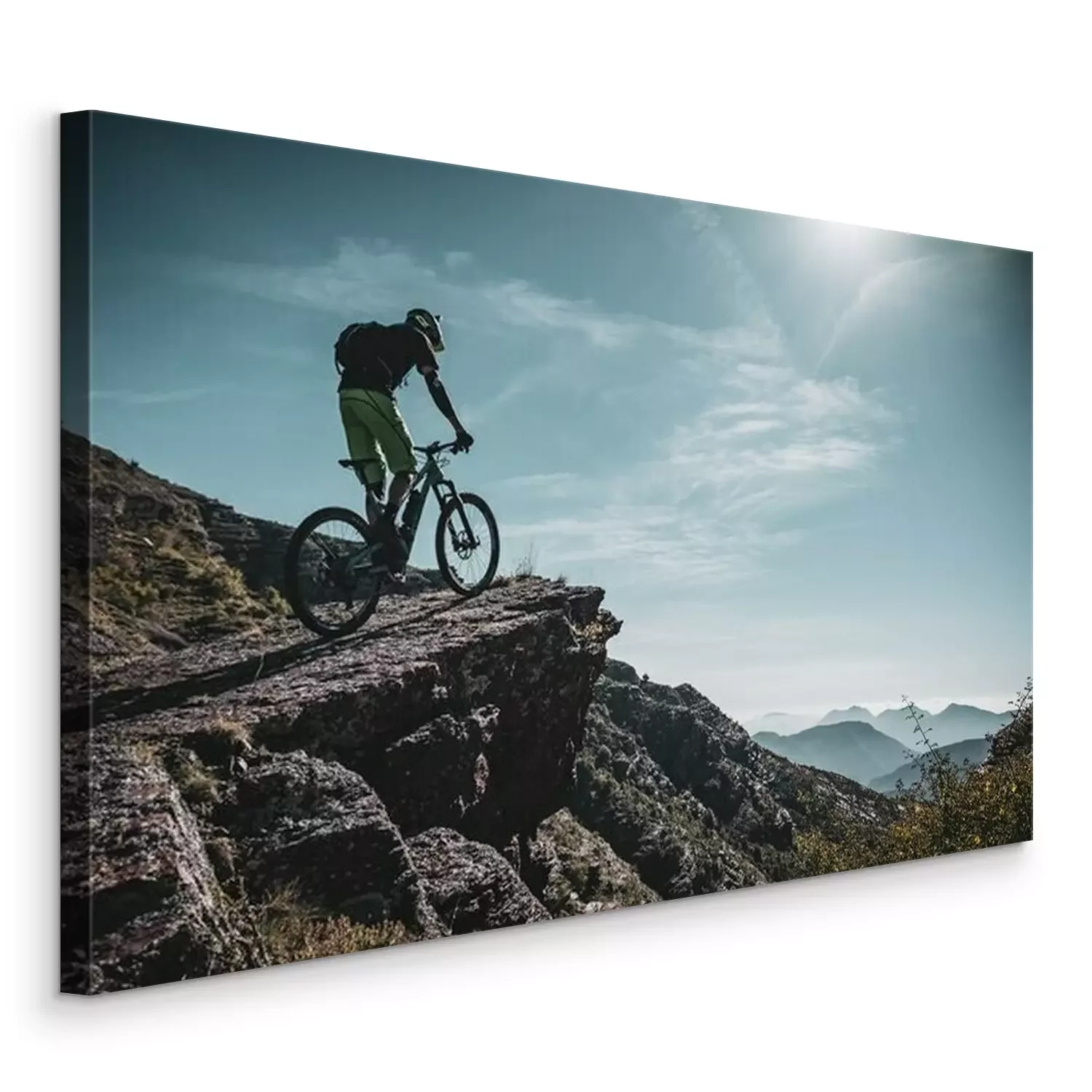 Tableau : Cycliste de montagne sur un grand rocher au fond des Alpes avec des couches de soleil et de montagne derrière