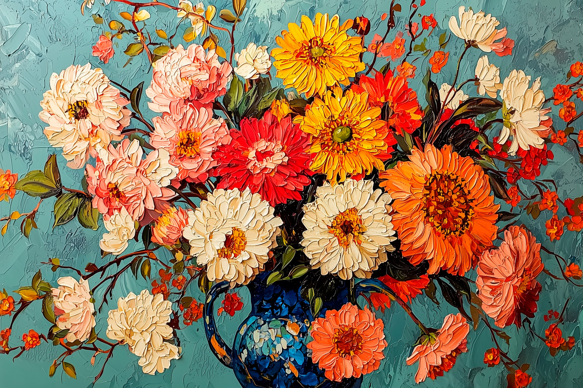 Tableau : Dahlias et chrysanthèmes colorés dans un vase