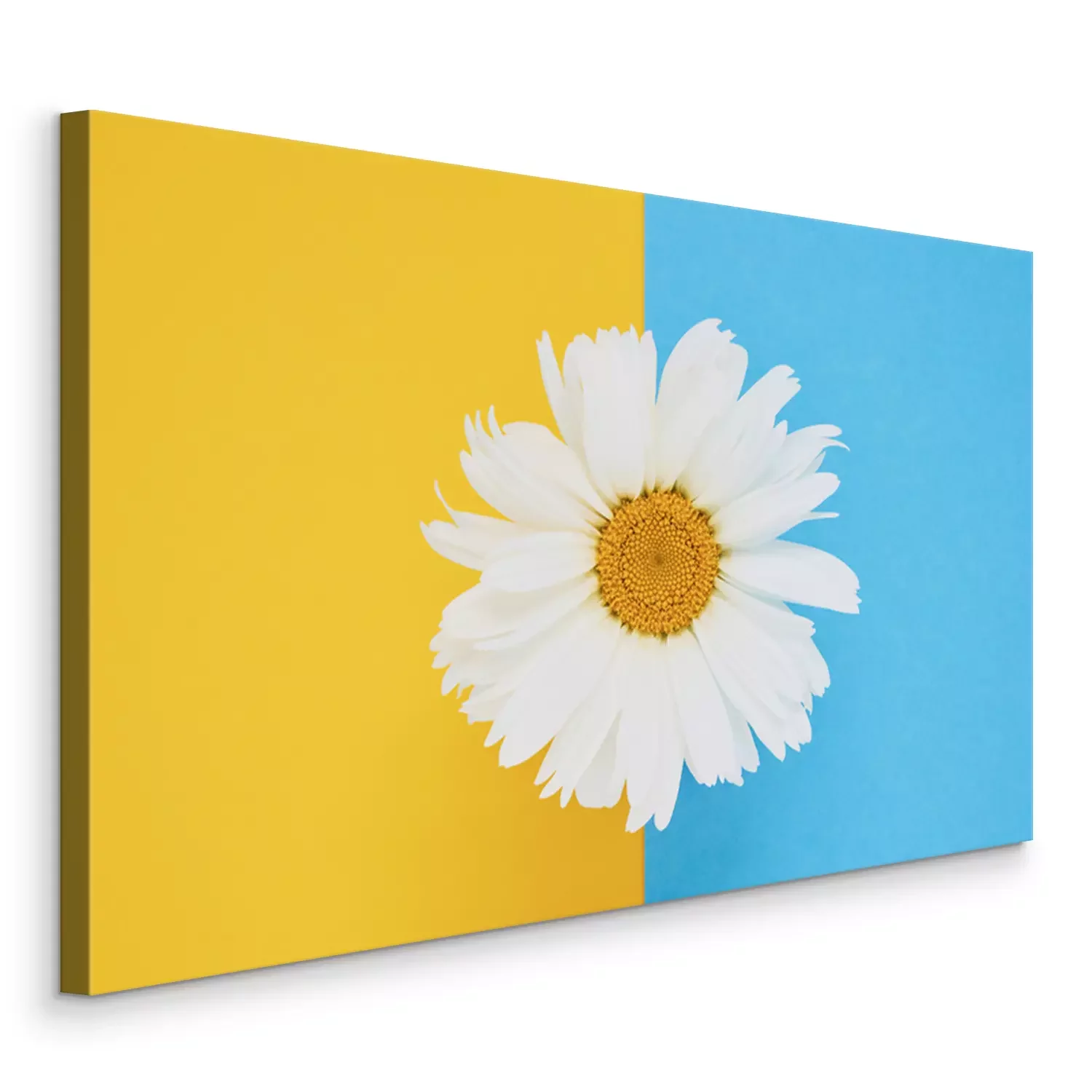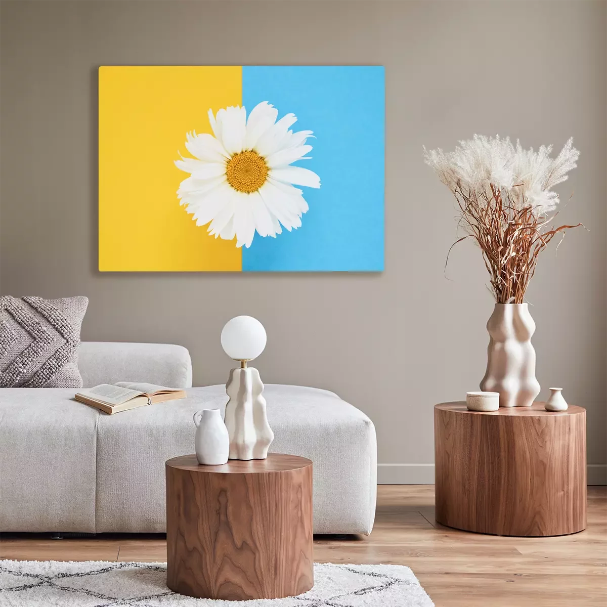 Tableau  Daisy flower on blue yellow background. Top view, copy space