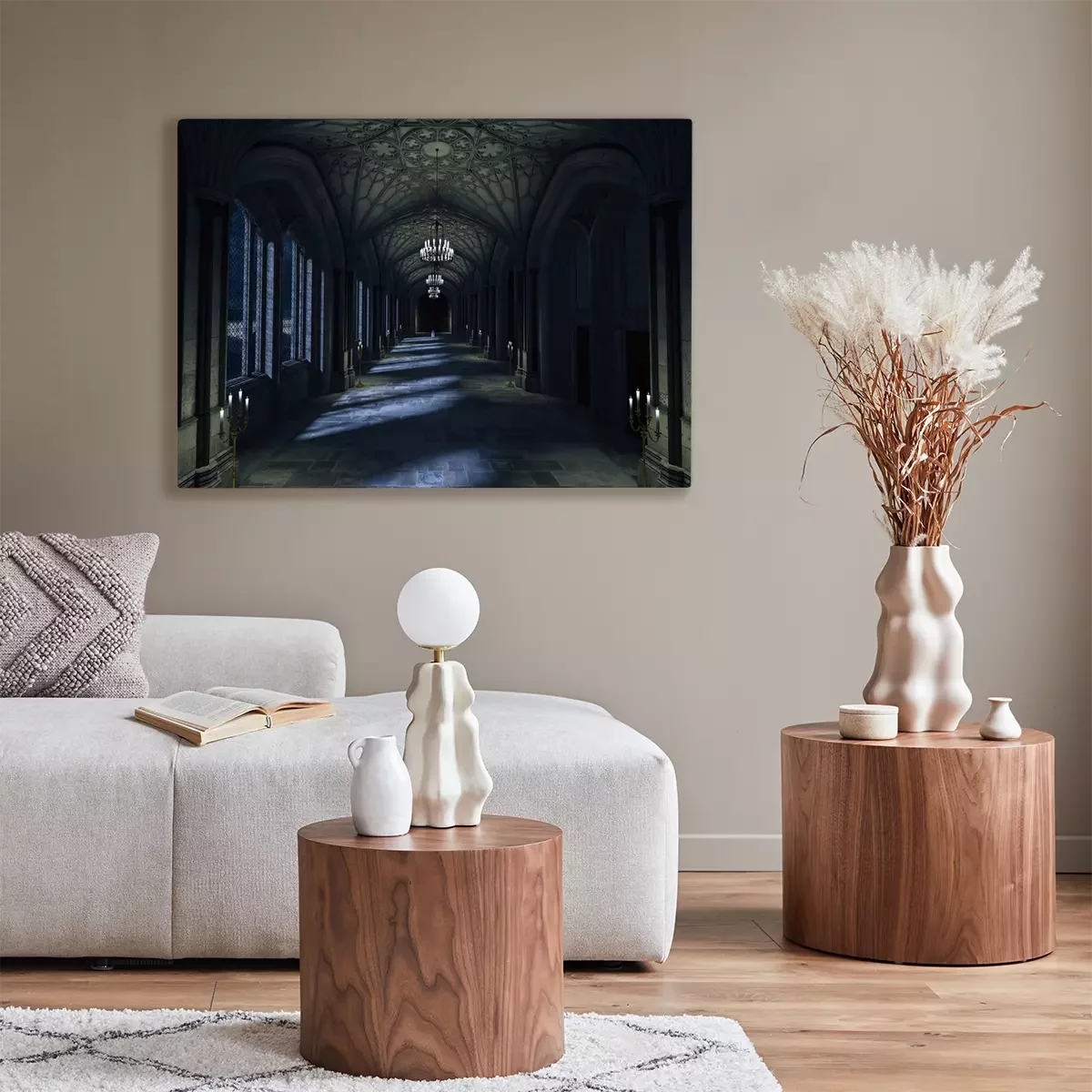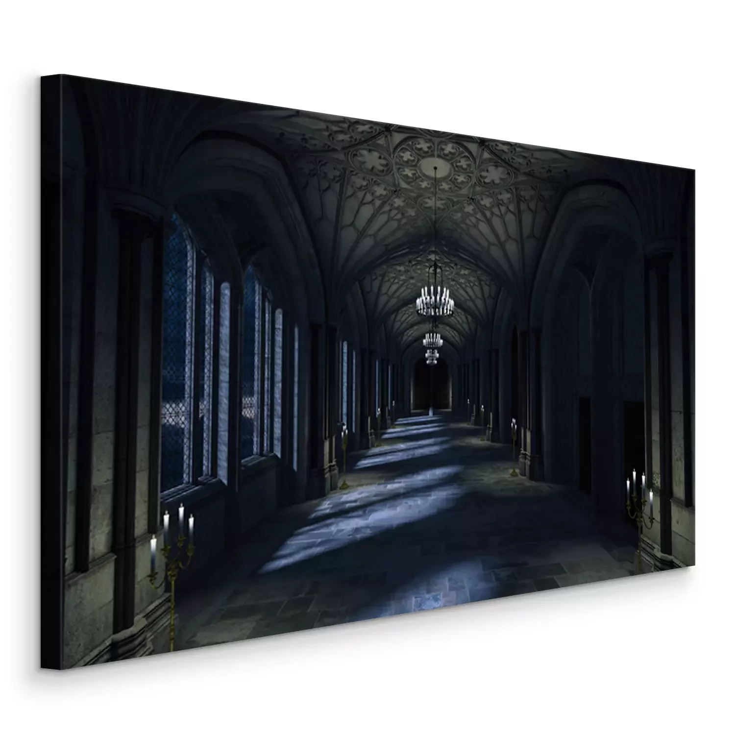 Tableau  Dark Palace Hallway avec des bougies allumées et le clair de lune qui brille à travers les fenêtres, rendu 3d.