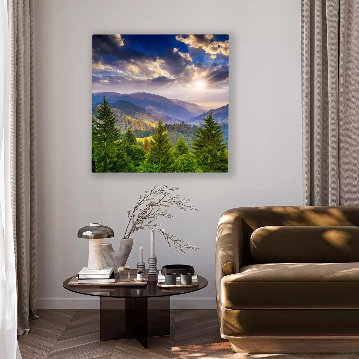 Tableau  de pins à proximité de la vallée dans les montagnes et la forêt à flanc de colline sous