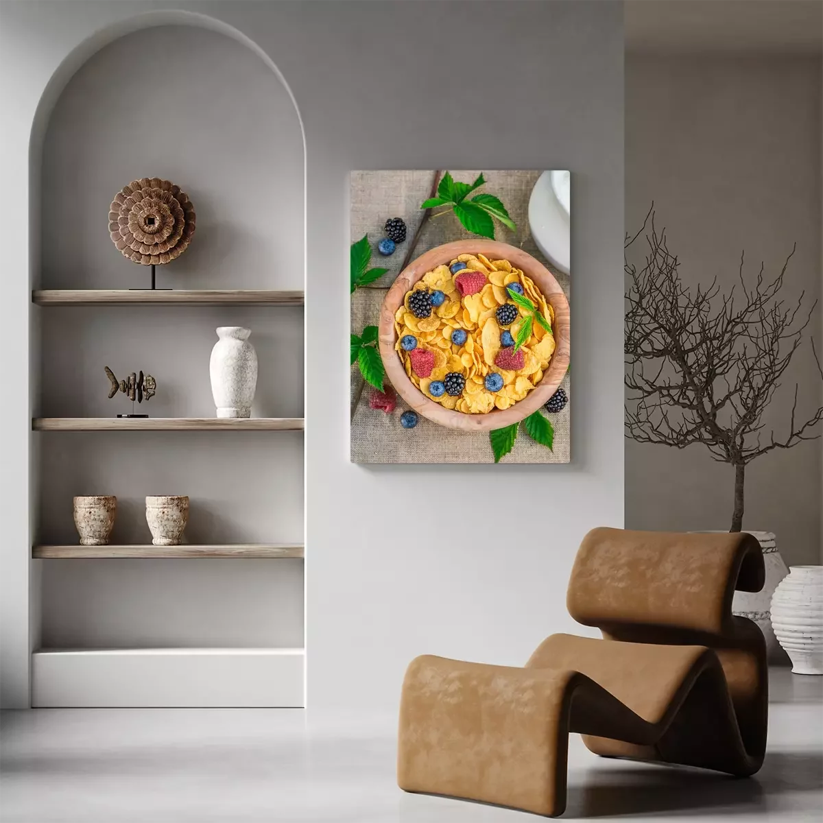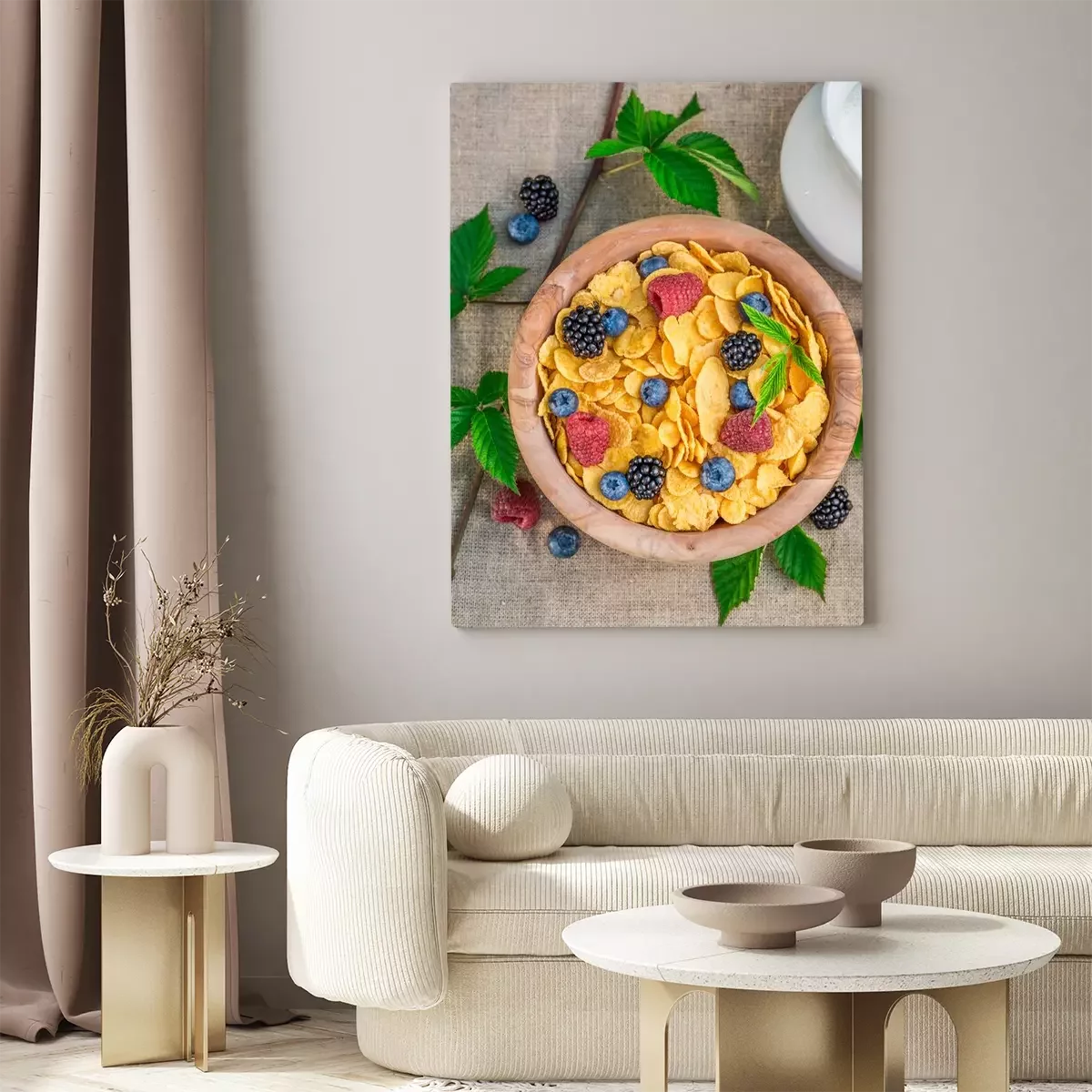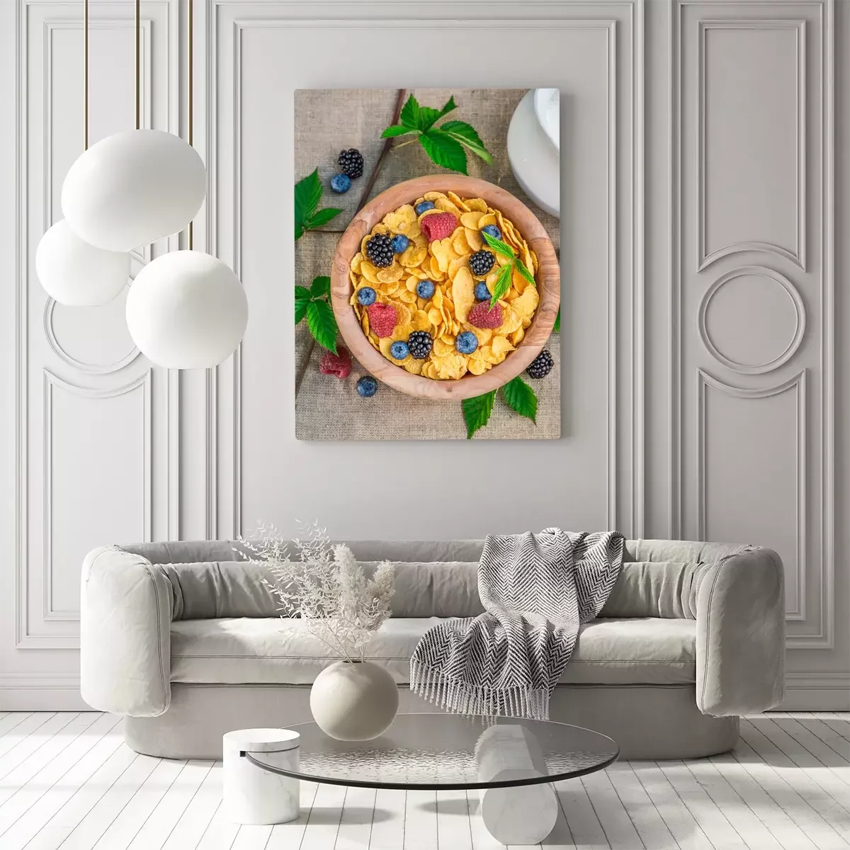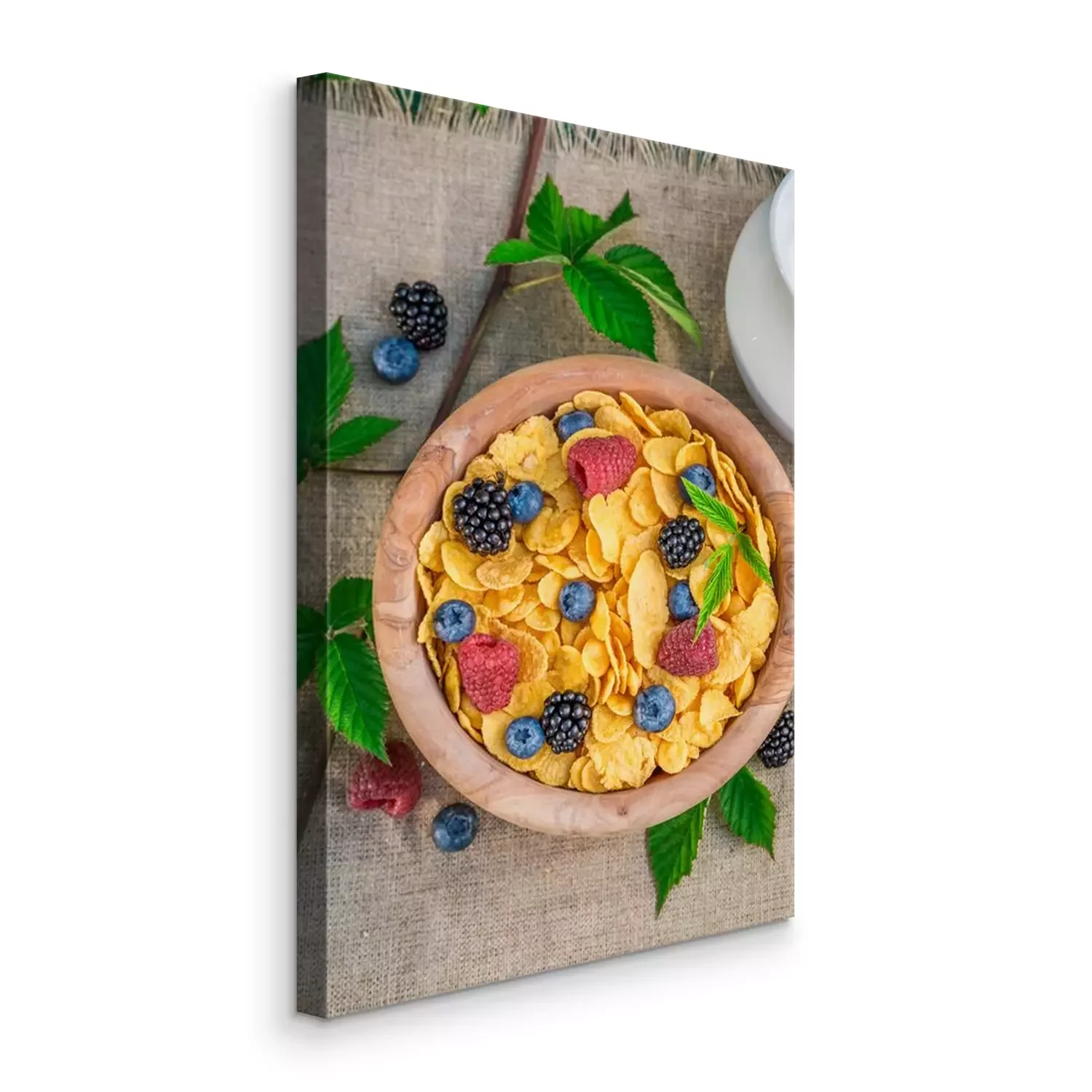 Tableau  Délicieux, cornflakes, lait, baies, fruits