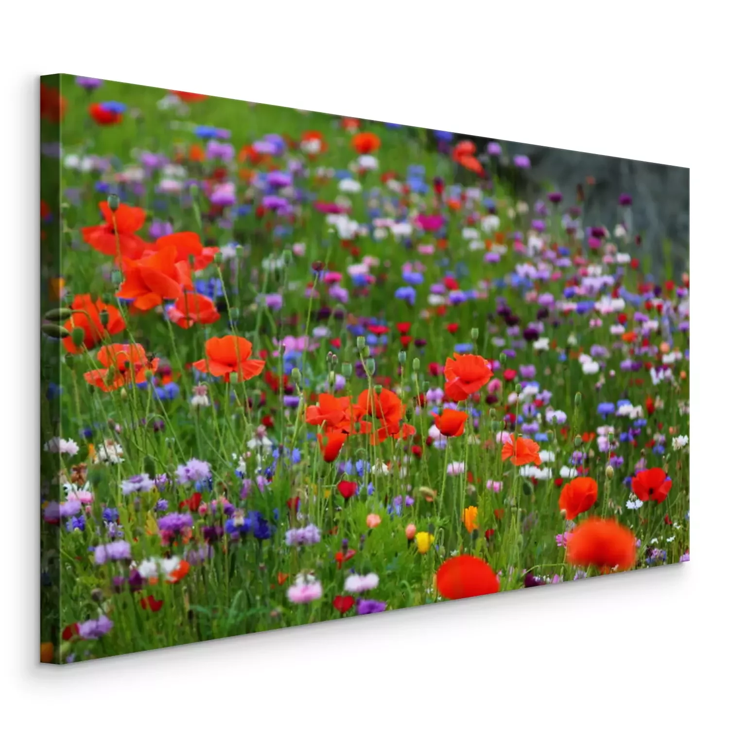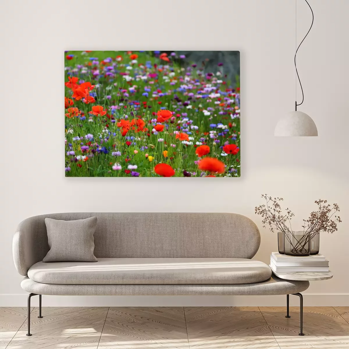Tableau  Des coquelicots rouges et des cornflowers blancs, mauves, orange et bleus sur la prairie.