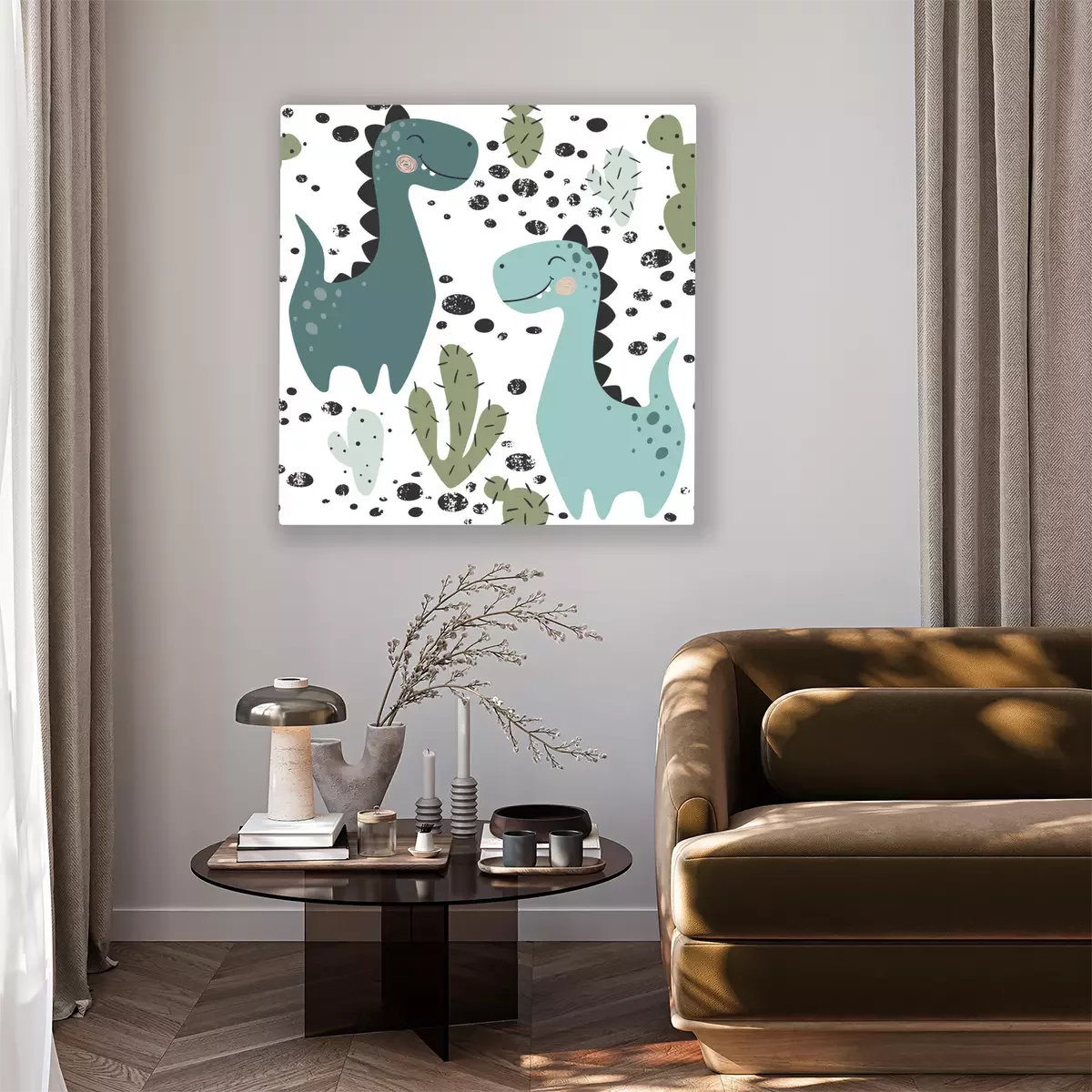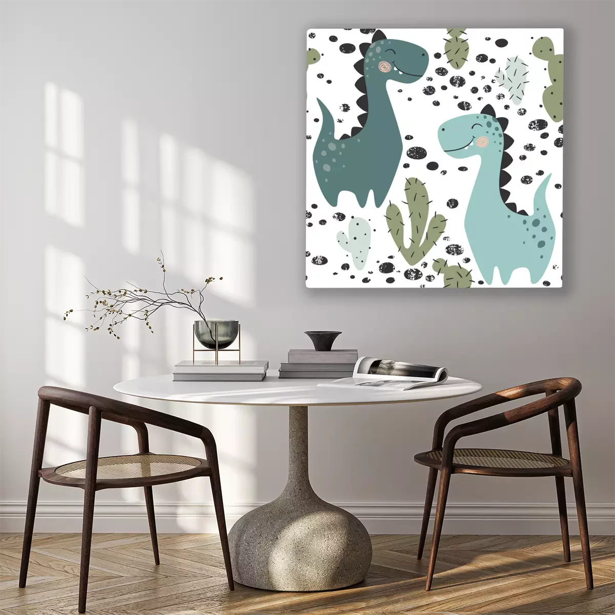Tableau : Des dinosaures au milieu de cactus dans un style scandinave