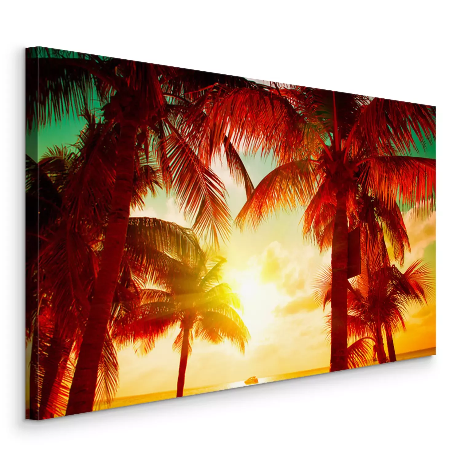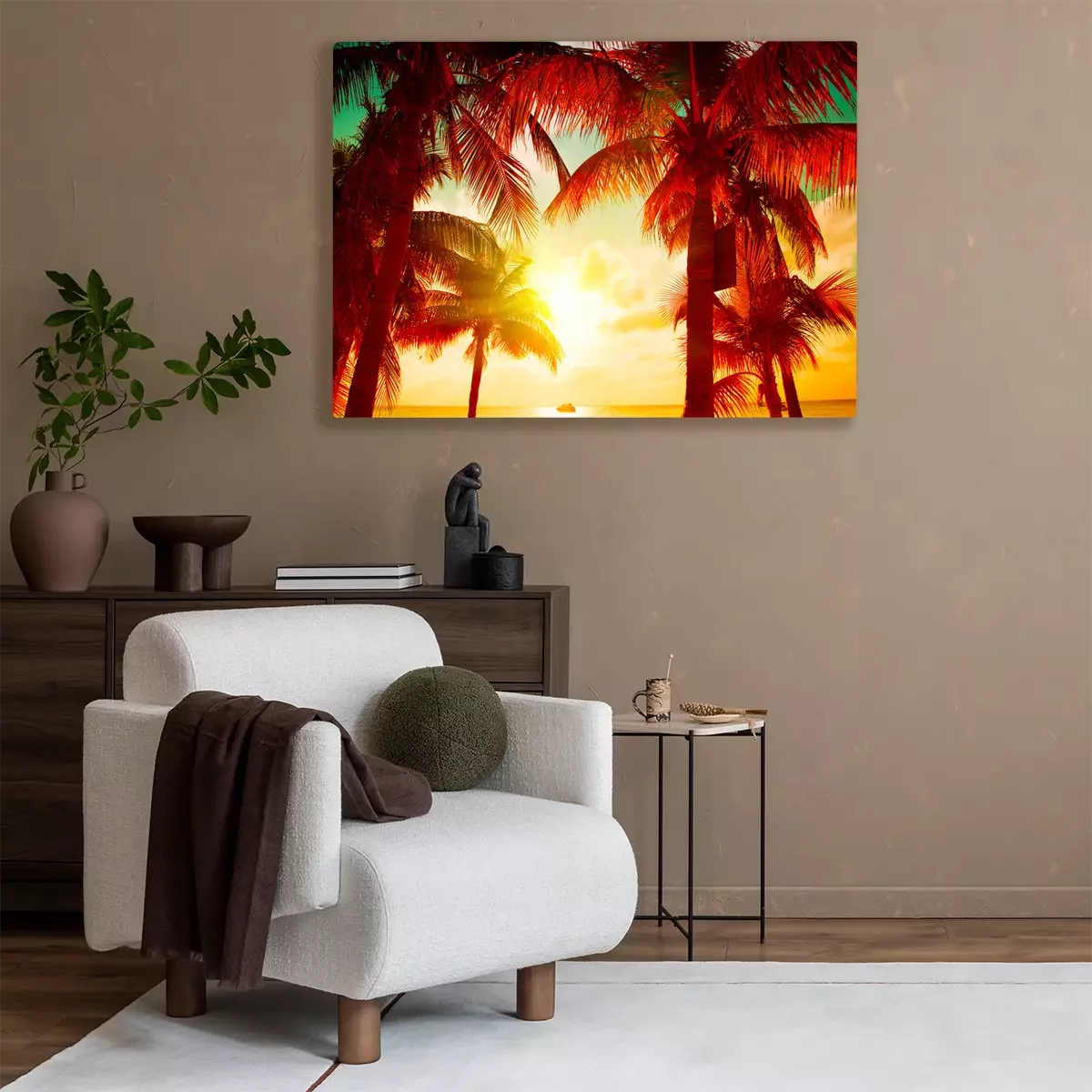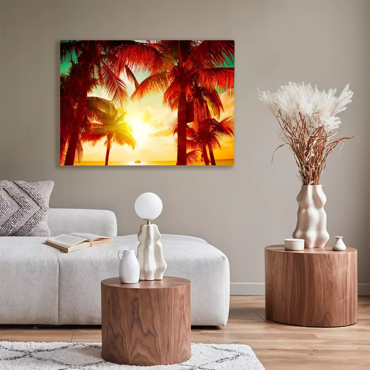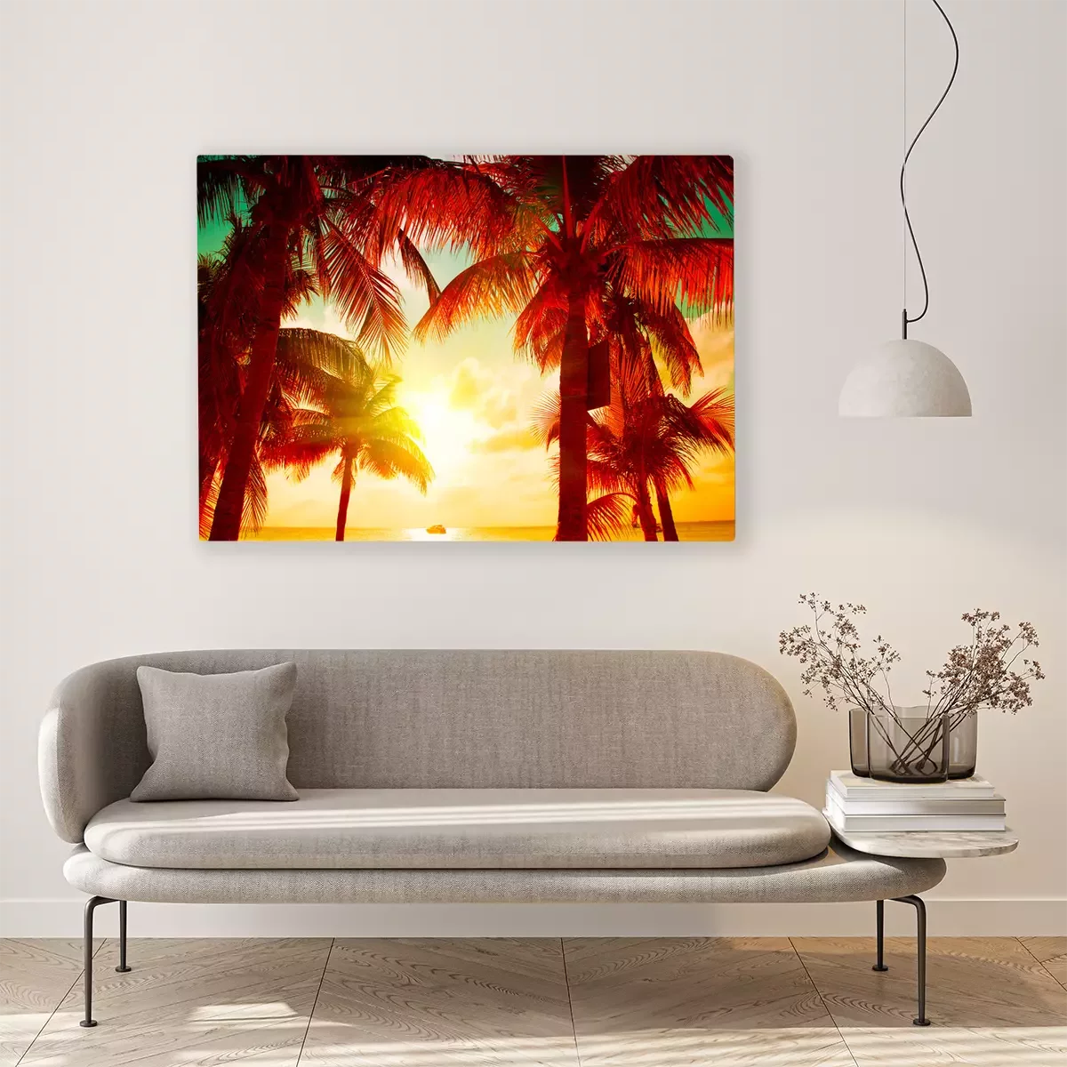 Sunset beach with tropical palm tree over beautiful sky. Palms and beautiful sky background. Tourism, vacation concept backdrop. Palms silhouettes over orange sun
