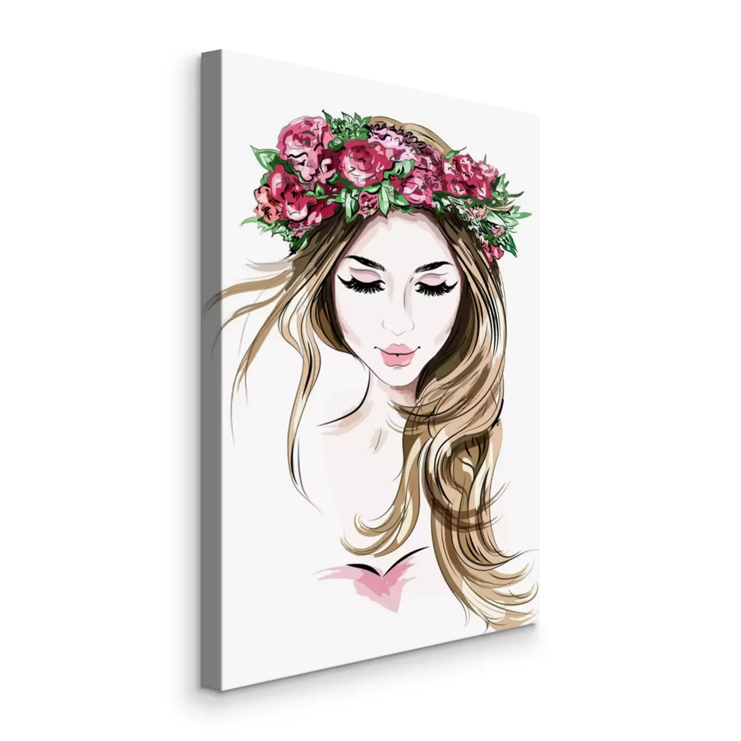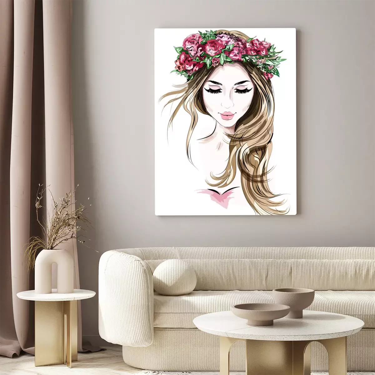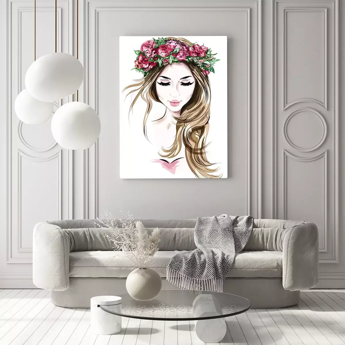 Tableau  Dessinée belle jeune femme dans la couronne de fleurs. Fille mignonne aux cheveux longs. Esquisser. Illustration vectorielle.