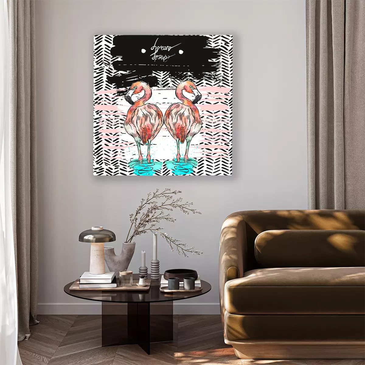 Tableau : Deux flamants roses dans l'eau