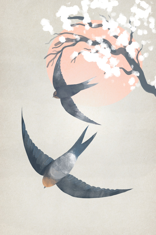 Tableau : Deux hirondelles et une fleur de cerisier sur fond de soleil
