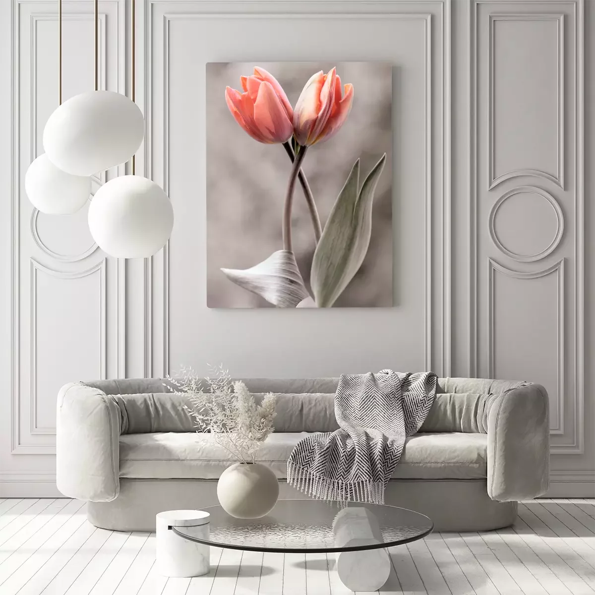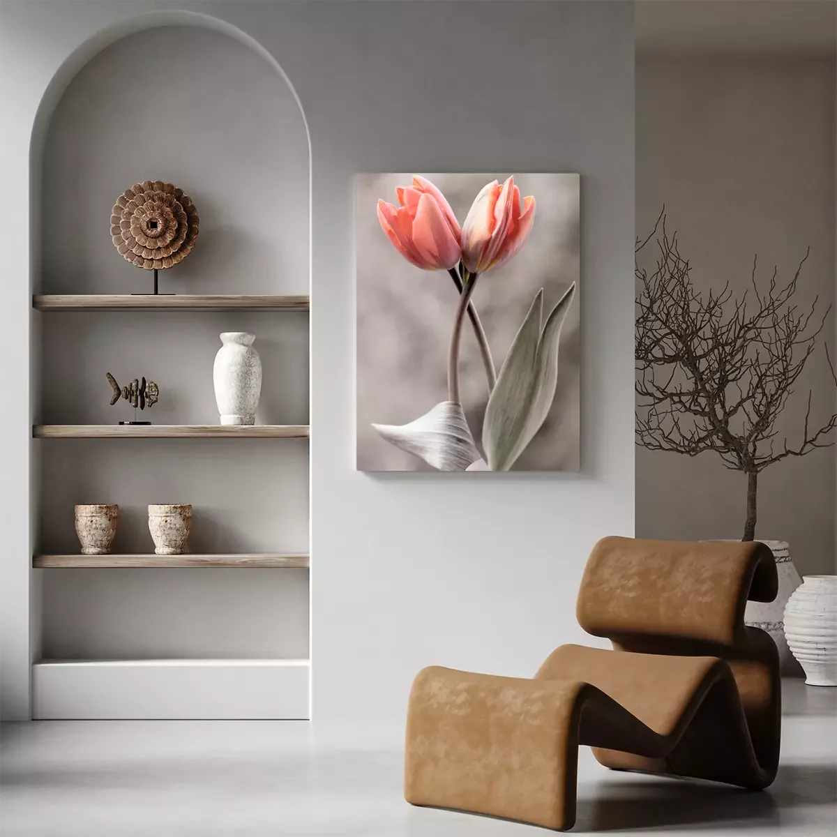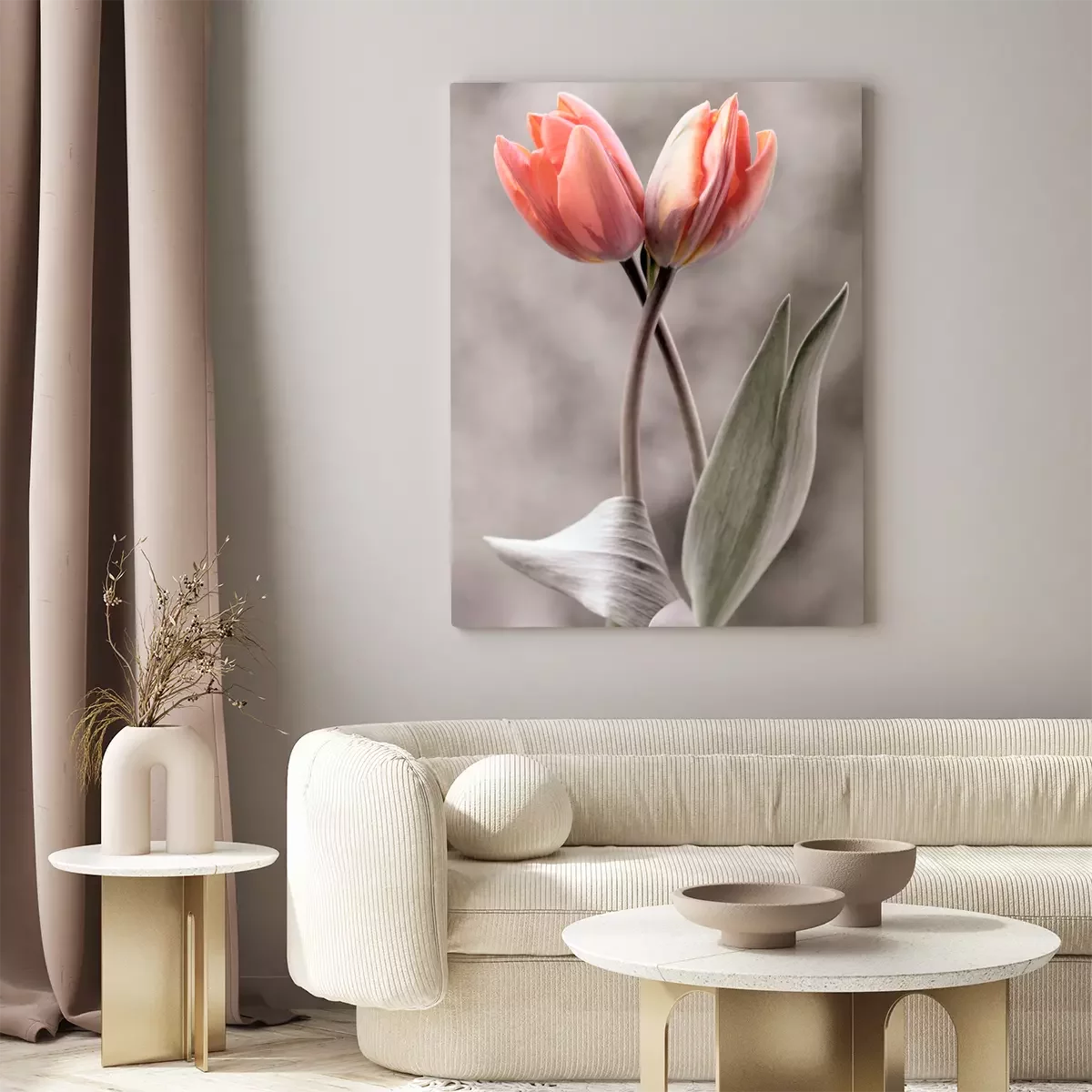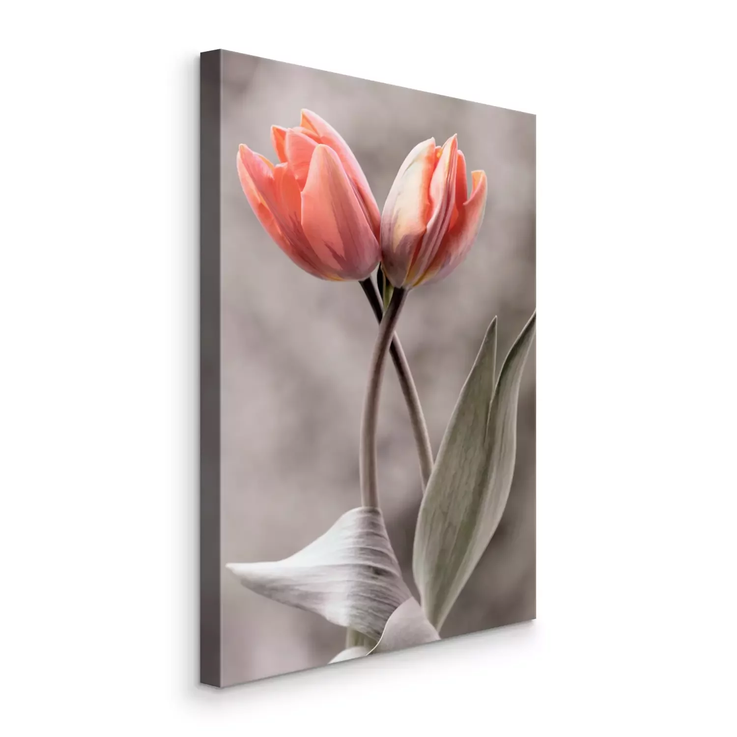 Deux tulipes roses sur un fond gris flou