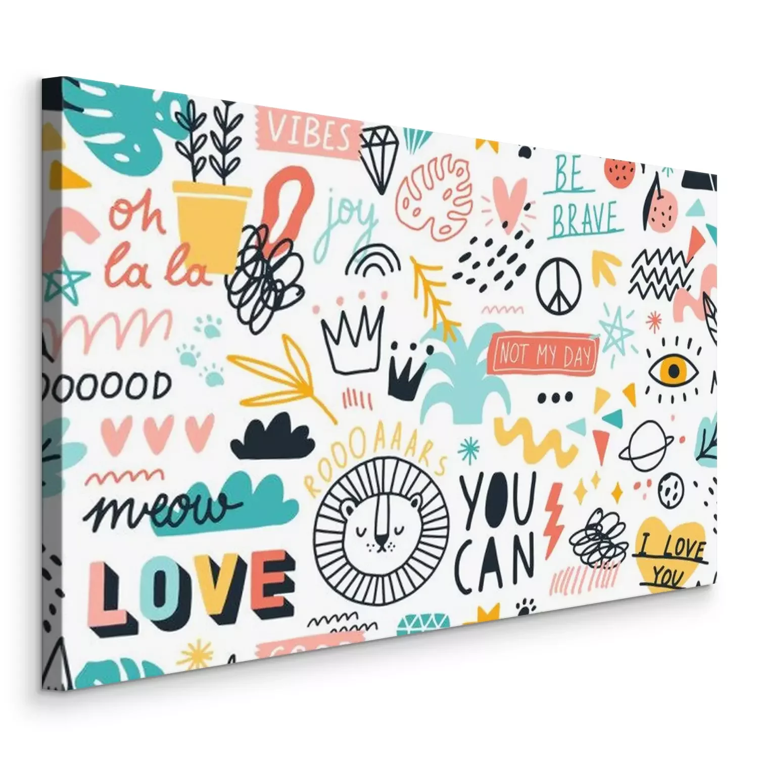 Tableau  Different hand drawn design elements animals, plants, symbols and handwritten slogans seamless pattern. Various colorful phrases and inscriptions on white. Vector flat illustration in doodle style