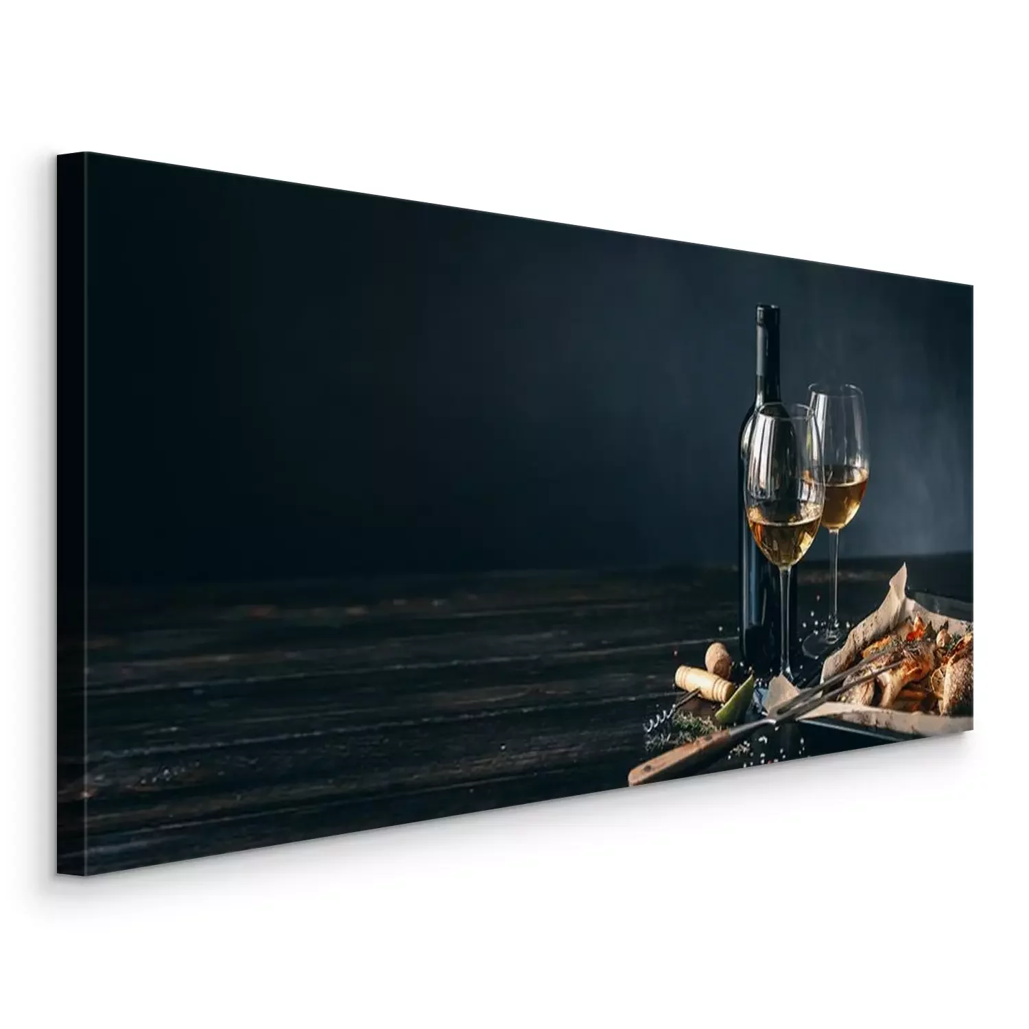 Tableau : dinner concept for two. two glasses of white wine, baked fish.