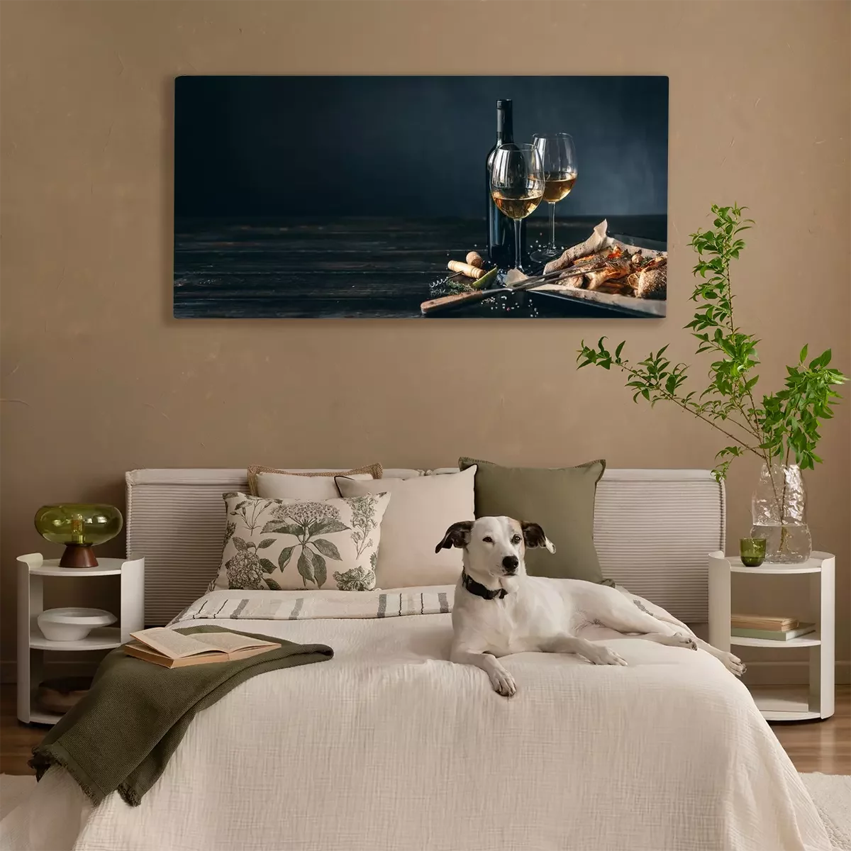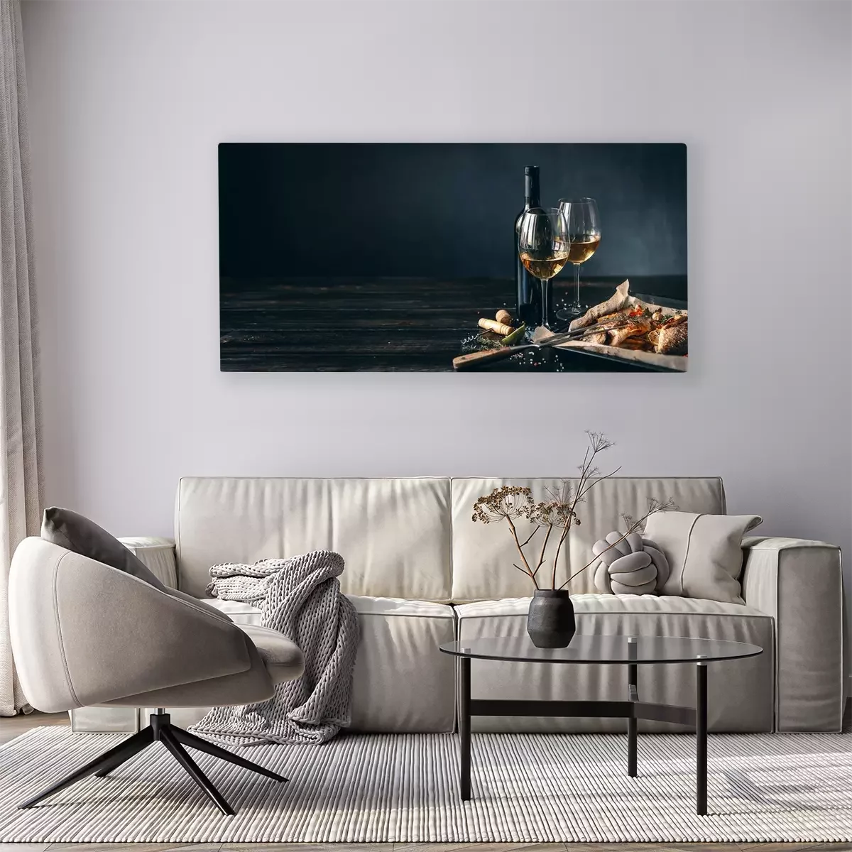 Tableau  dinner concept for two. two glasses of white wine, baked fish.