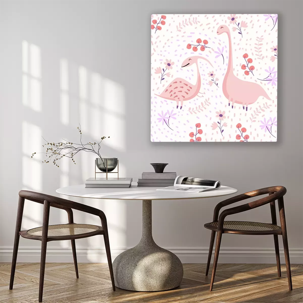 Tableau : Dinosaures roses sur fond floral