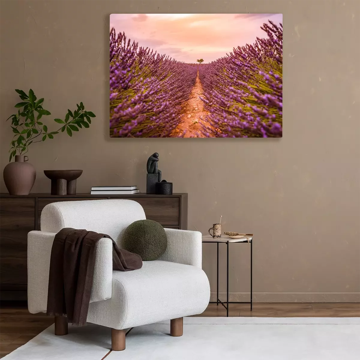 Tableau : Dramatic sunset landscape. Tree in lavender field at sunset in Provence, France