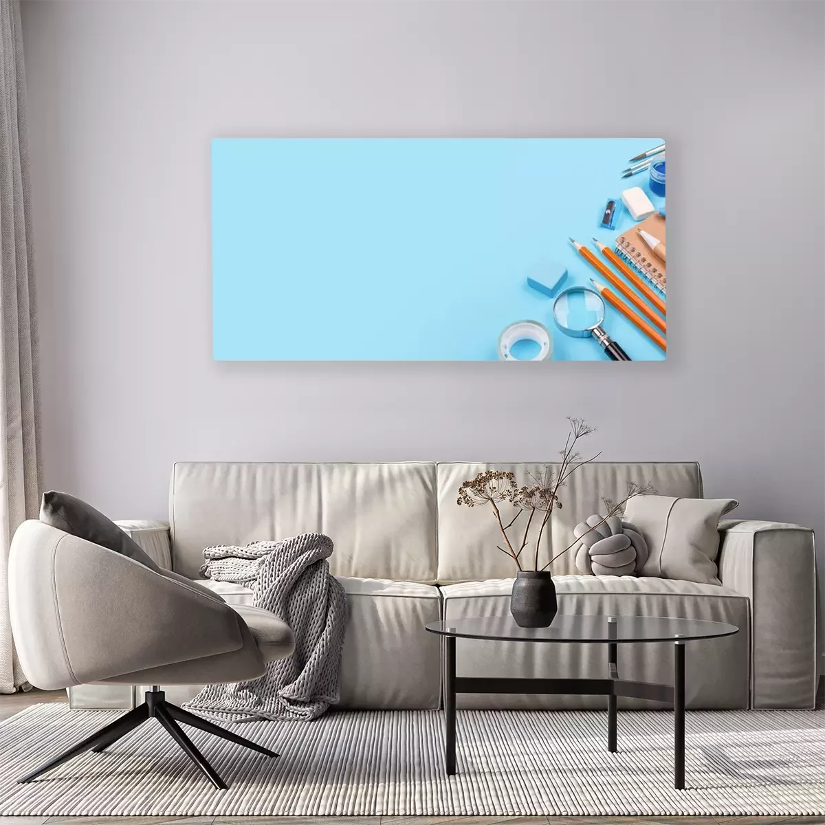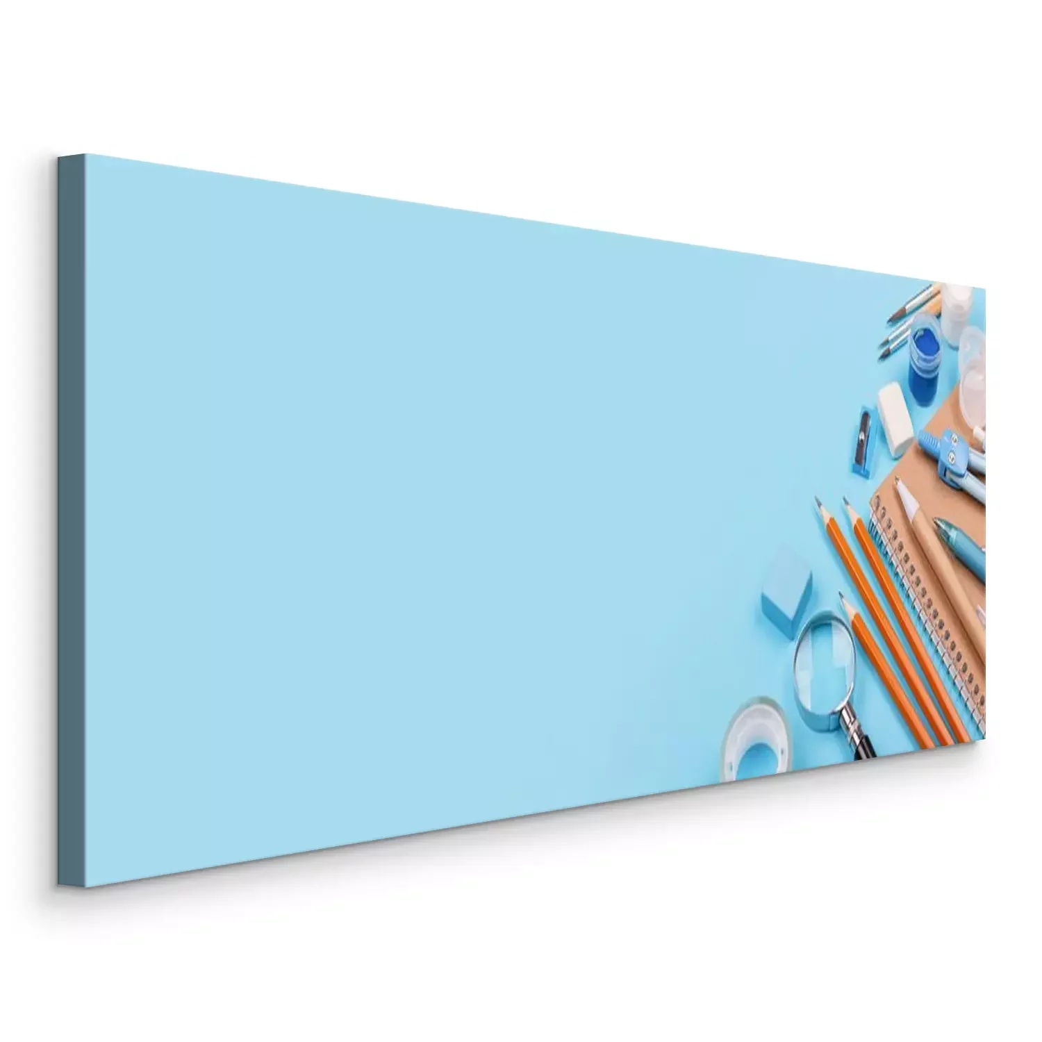 Tableau  École stationnaire sur fond bleu. Cahier, stylos, crayons et autres outils. Bannière pour le site.