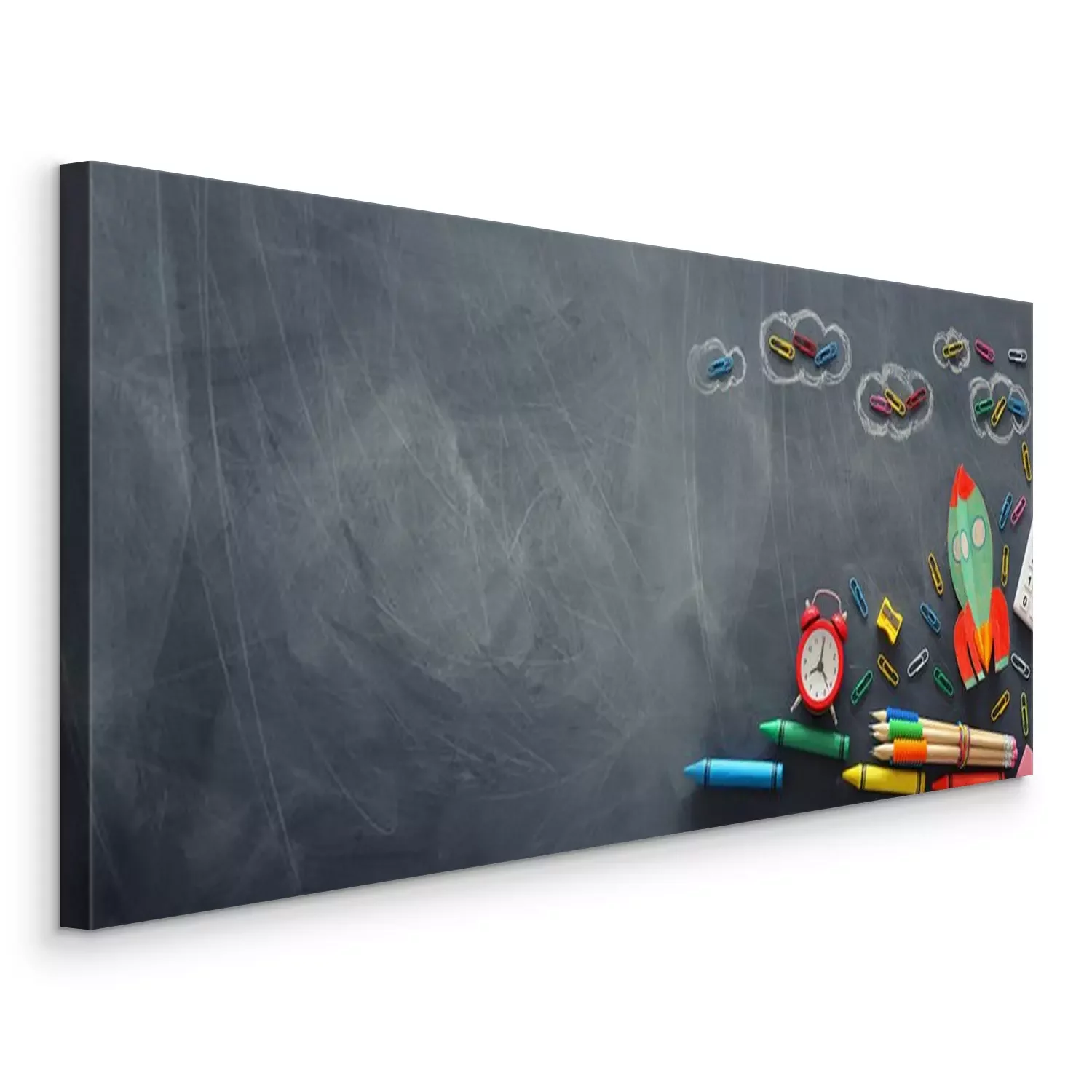 Tableau  education. Back to school concept. rocket cut from paper and painted over blackboard background. top view, flat lay. banner