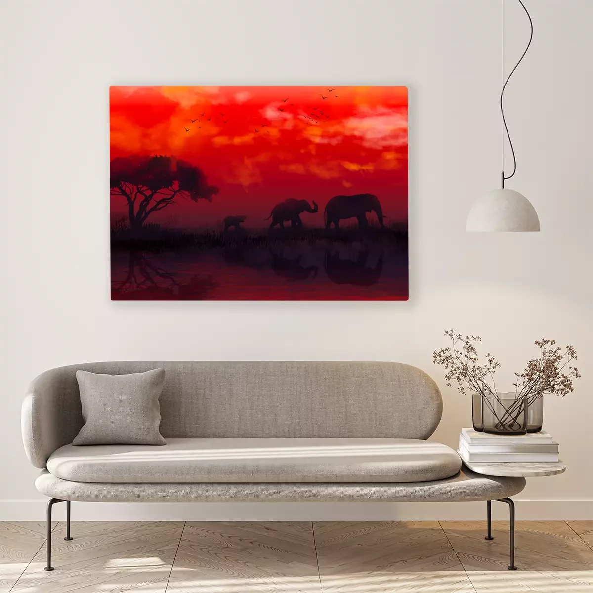 Éléphants au-dessus de l'eau dans une lueur rouge