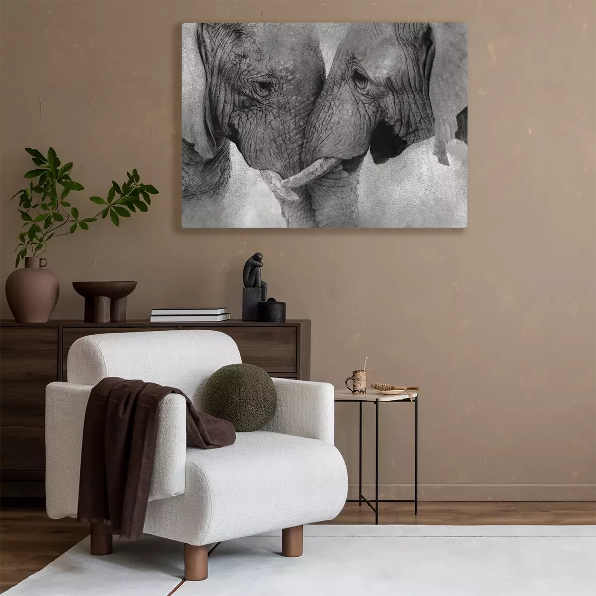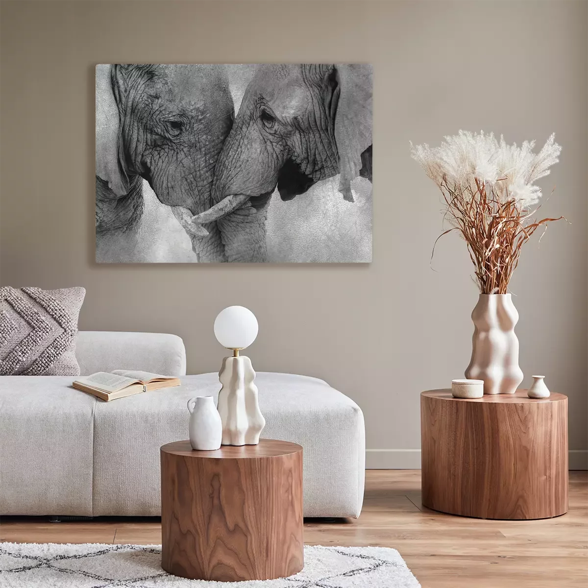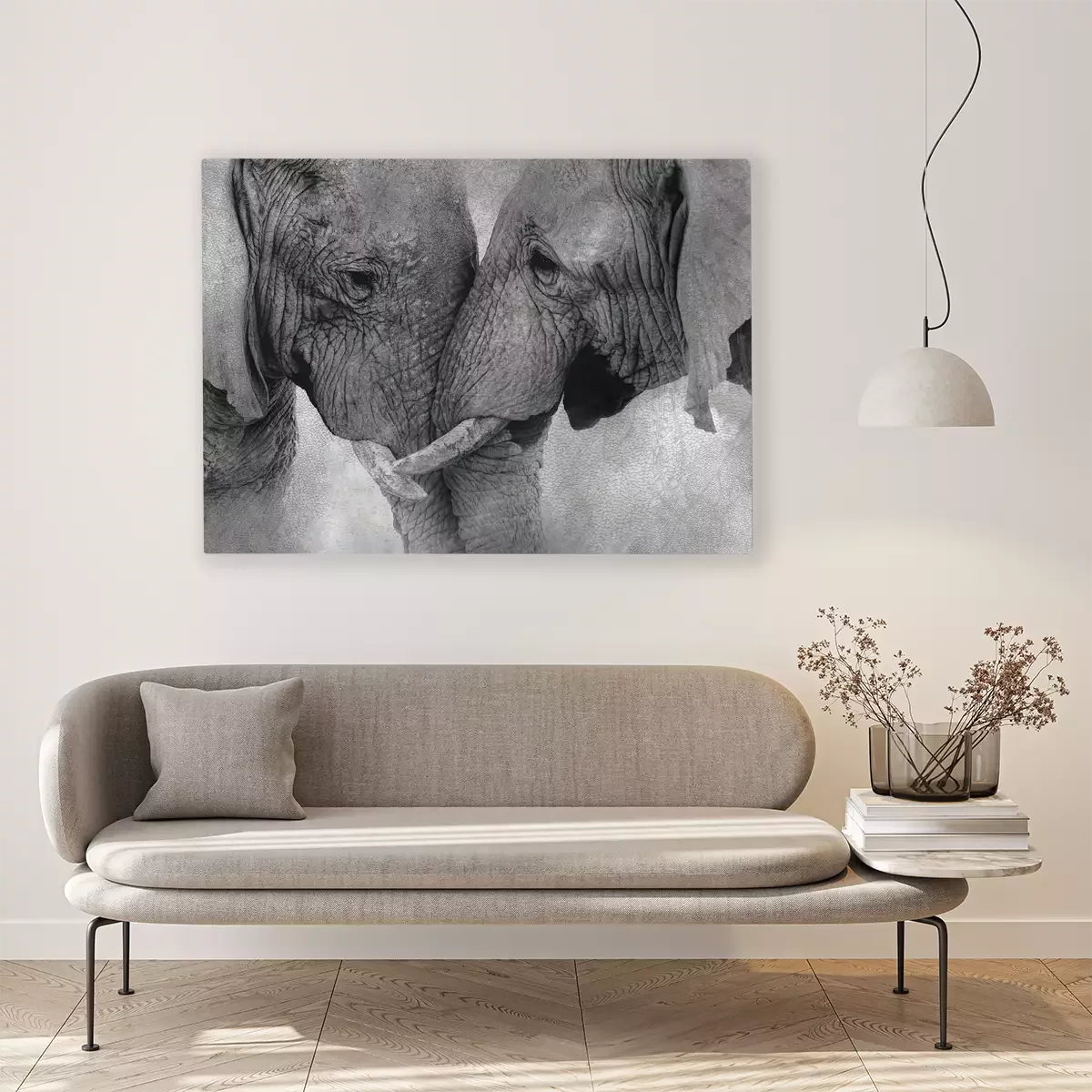 Éléphants enlacés en gris monochrome