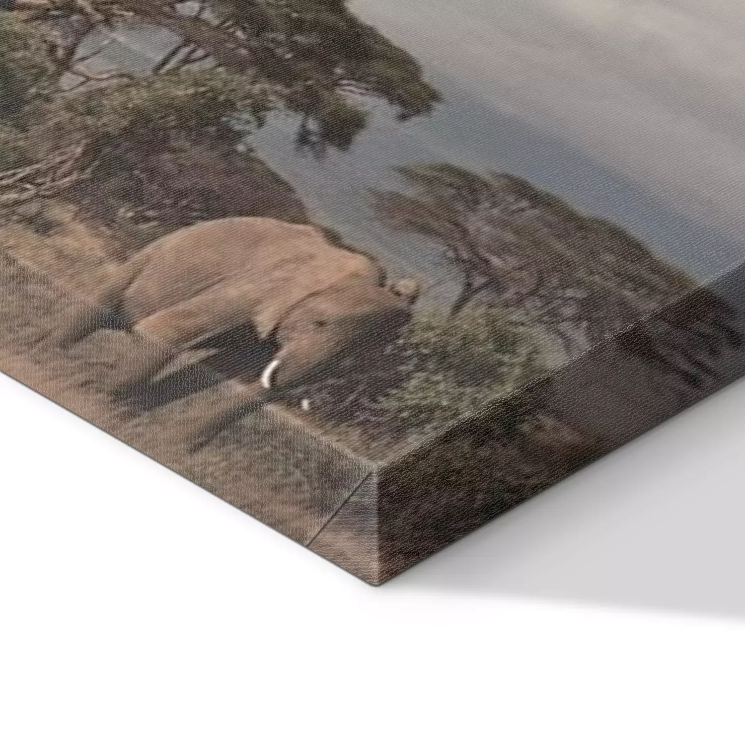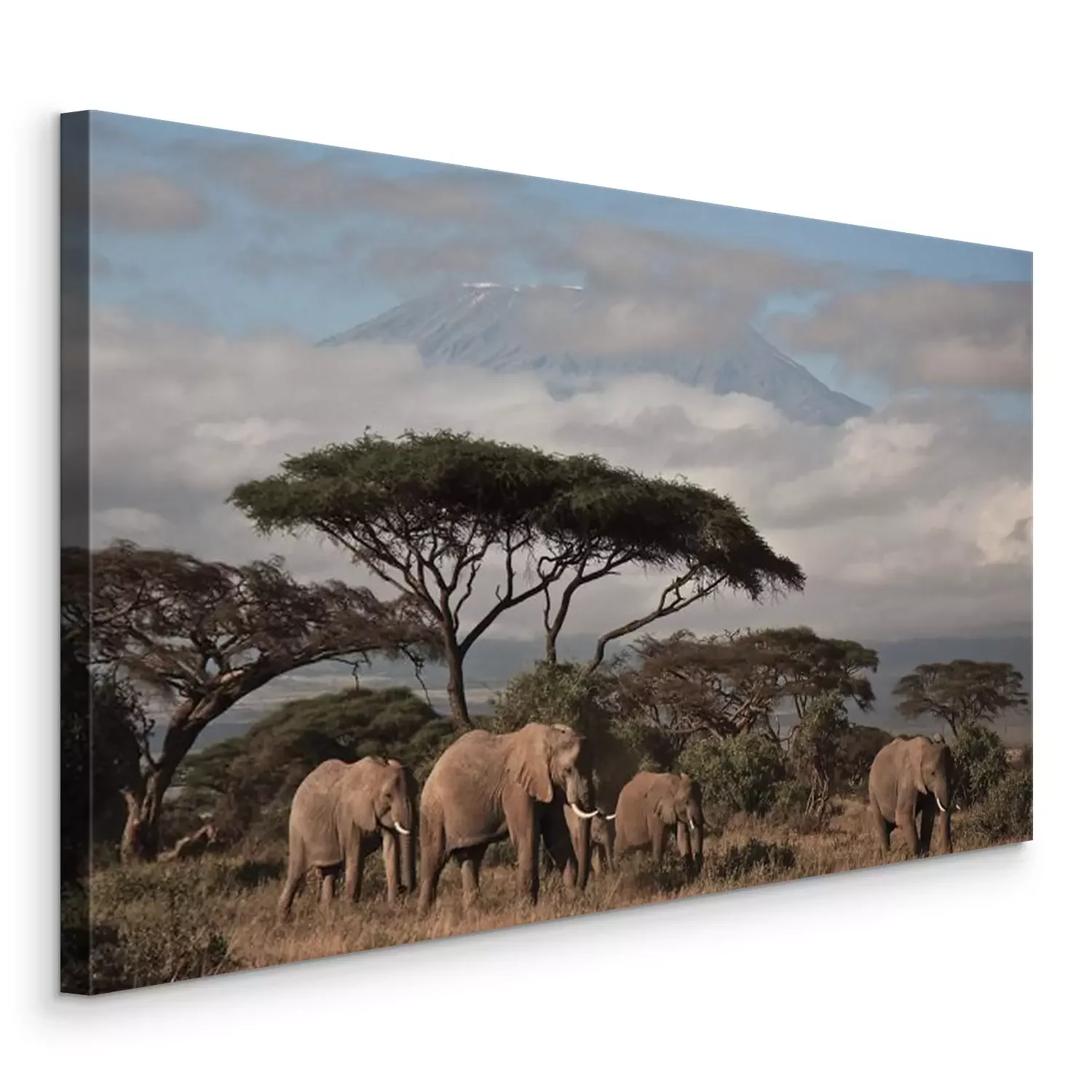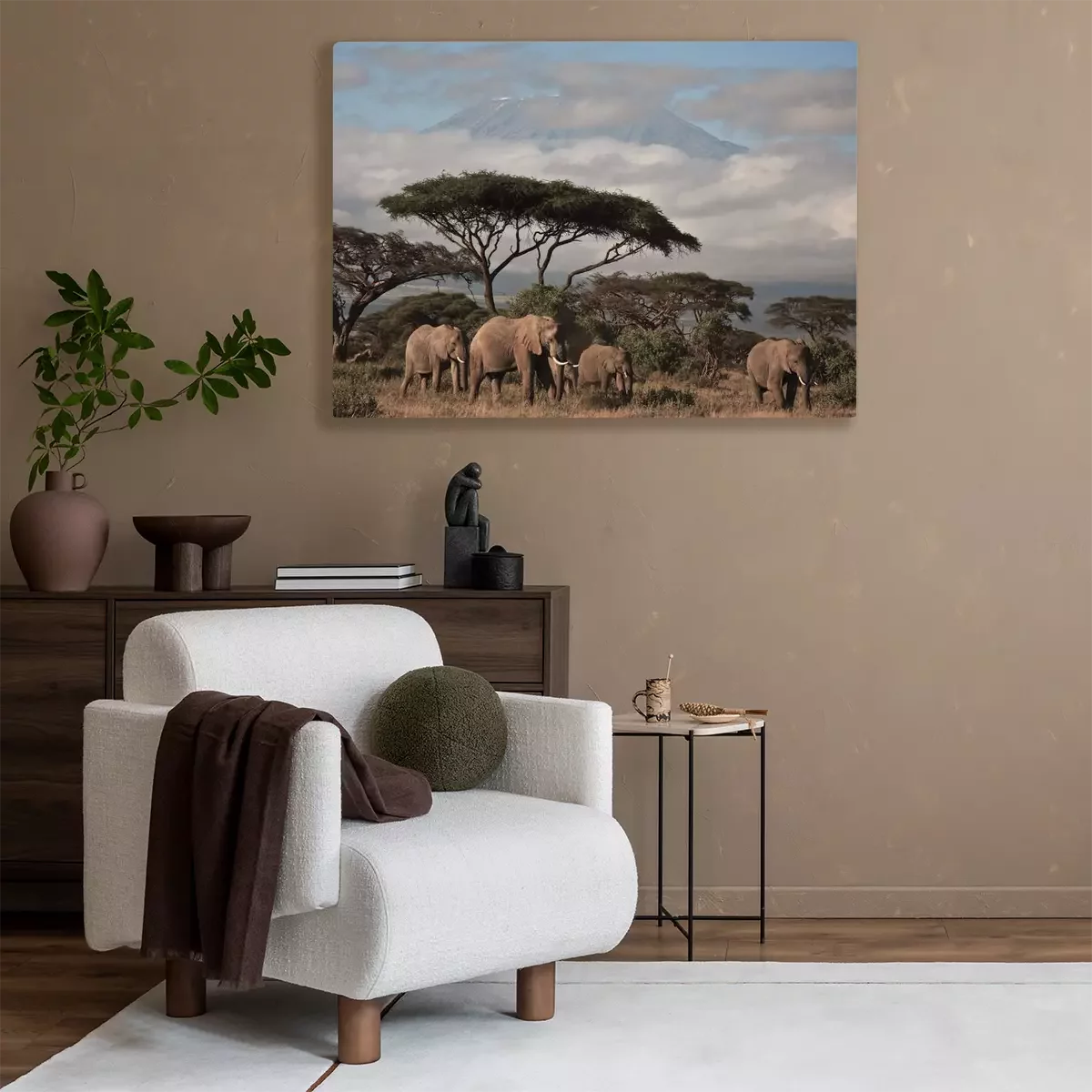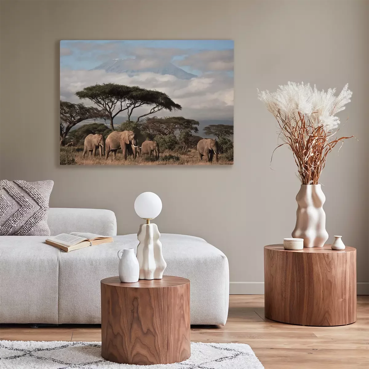 Éléphants majestueux se détachant sur fond d'arbres et de montagnes