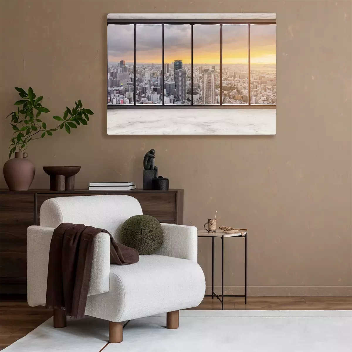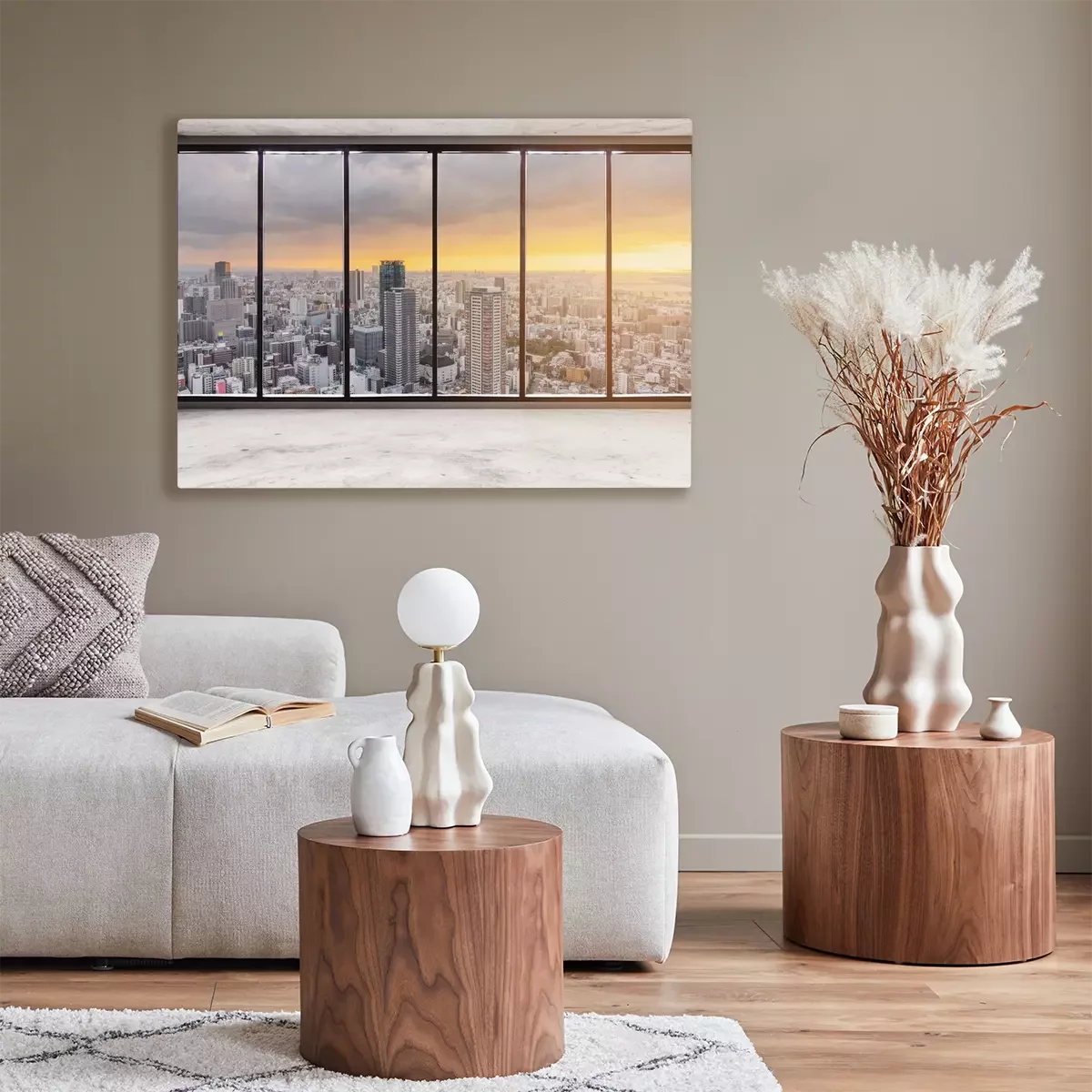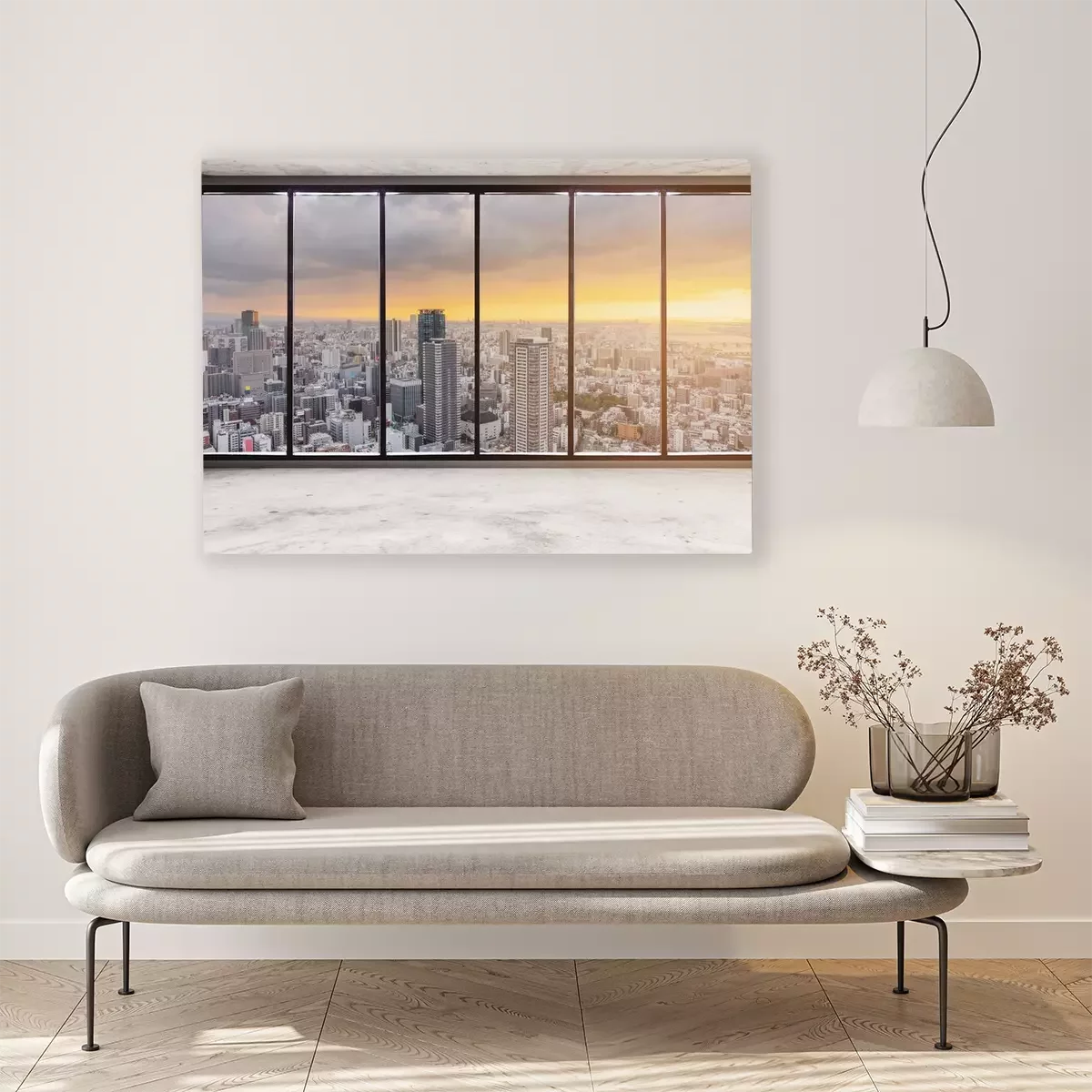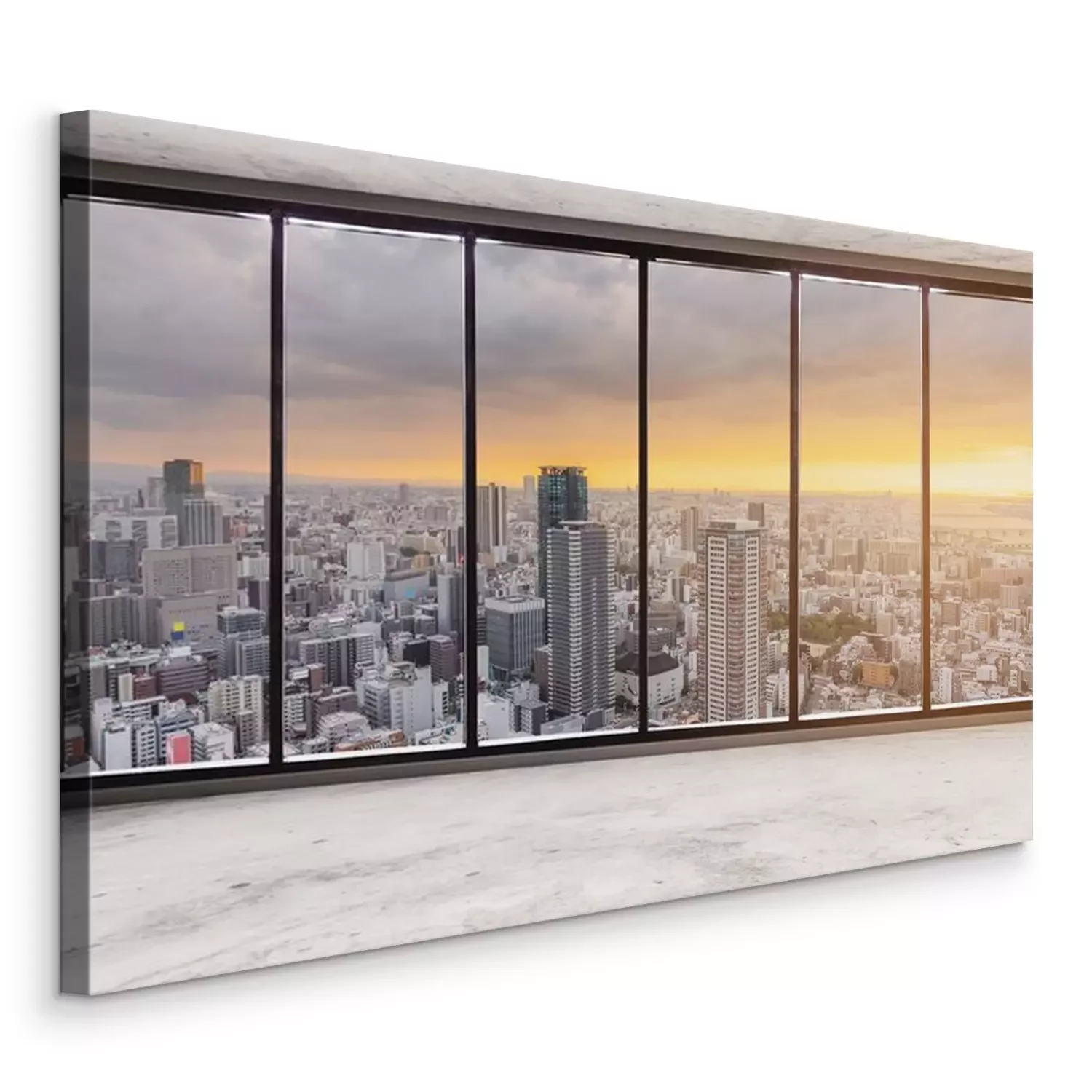 Tableau  Empty modern interior space with skyscraper city view in sunset, Empty Business Office Interior