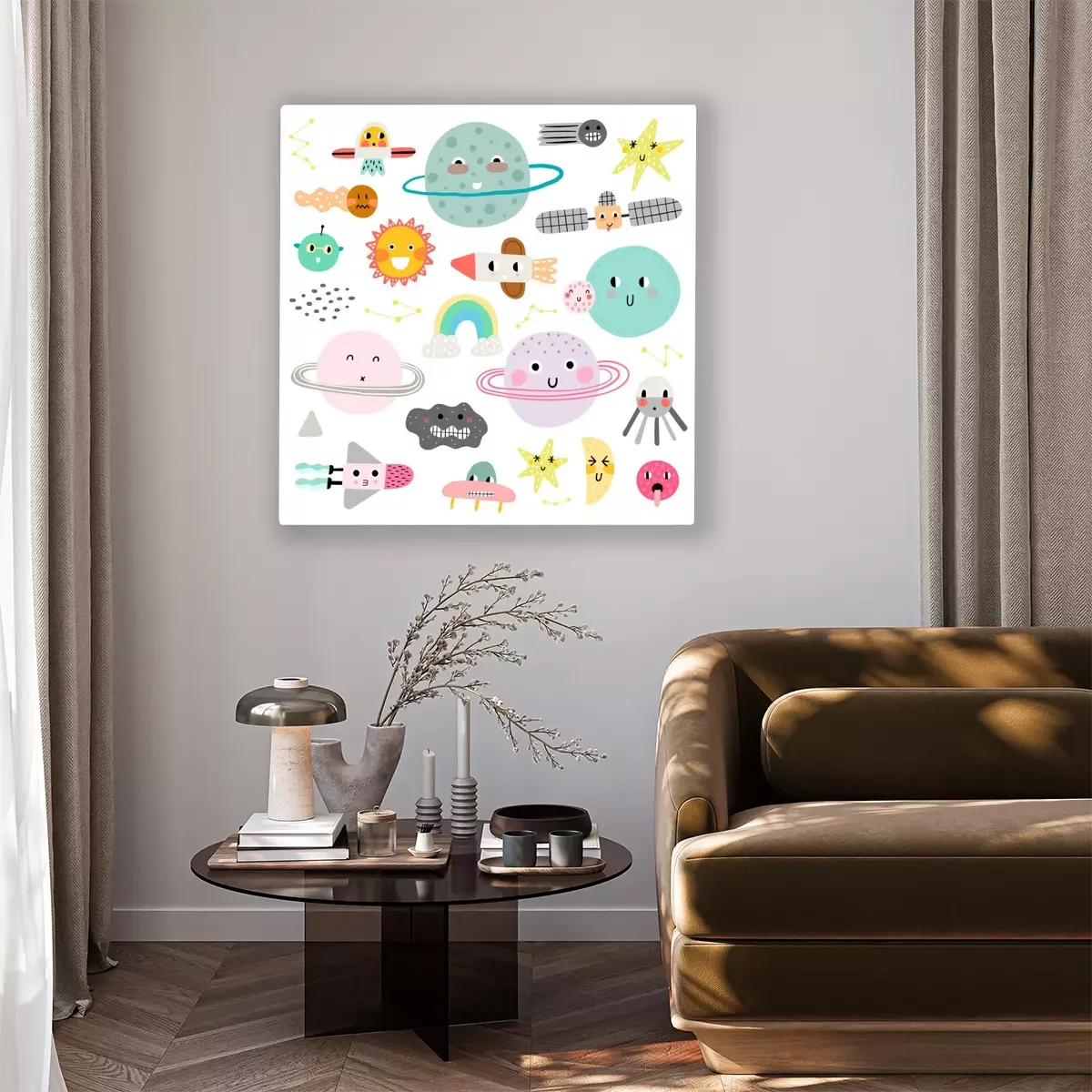Seamless pattern with cute planet, star and ufo. Vector illustration for children. Trendy kids vector background.