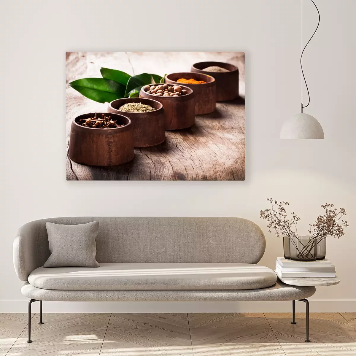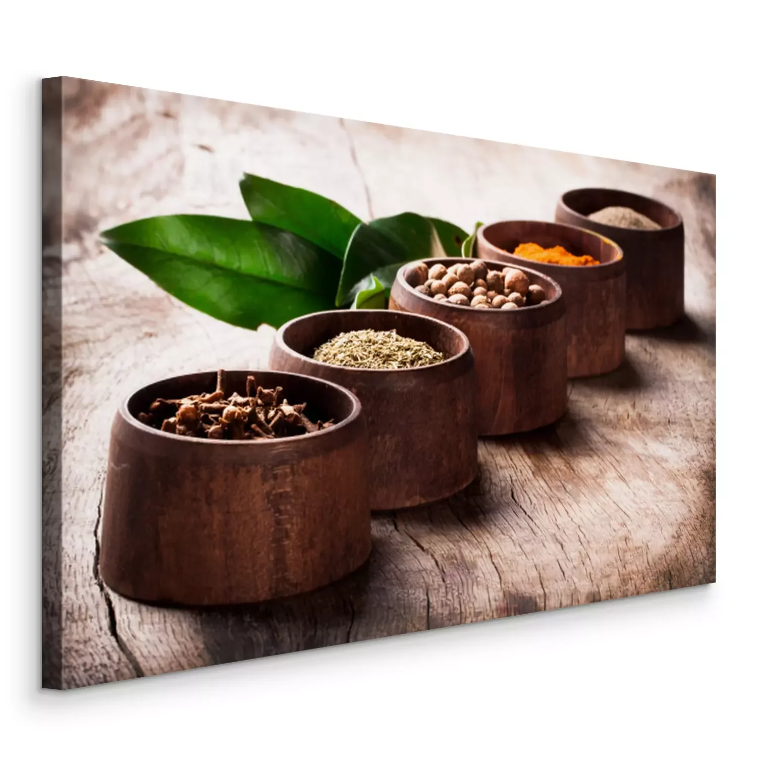 Tableau : Épices dans des récipients en bois